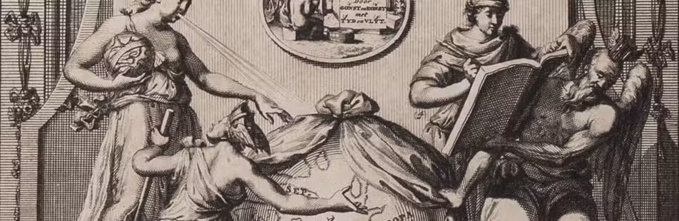 Amsterdam, Joannes Oosterwyk, 1720. 4to. With an engraved allegorical frontispiece by J. Folkema after F. Ottens, 6 folding engraved maps, and 7 engraved plates (including 1 folding showing ships at sea by A. Salm after Van der Hem). Further with the title page printed in red and black, a small woodcut vignette on the title page, some woodcut decorated initials, and some large woodcut floral tailpieces. Contemporary half sheepskin, marbled paper sides. [38], 330, [14] pp. Full description