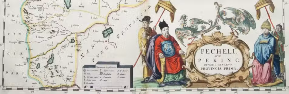 Leiden, Van den Heuvel and Van Santen, 1867-1868. 2 volumes. 8vo. Each volume with a different double-tinted lithographed view as frontispiece, further with a large folding tinted lithographed map of Japan and the Chinese coast, 2 lithographed views and 10 chromolithographed costume plates by P.W.M. Trap (the chromolithographs finished by hand). Original publisher's blind- and gold-blocked maroon cloth, marbled edges, green ribbon markers. XII, 335, [1]; VI, 357, [1] pp. Full description