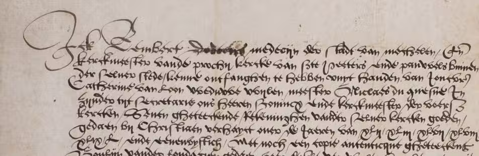 Antwerp, 20 January 1546. Manuscript notarial document in Latin, written in a Latin hand on one side of a single piece of sheepskin parchment (31 x 54.5 cm), opening with a large capital and closing with the notary's decorative signature, with the title and "M. Johan Carlo" on the back. Folded and loosely inserted in a paper folder (ca. 1690s?). [1] leaf. Full description