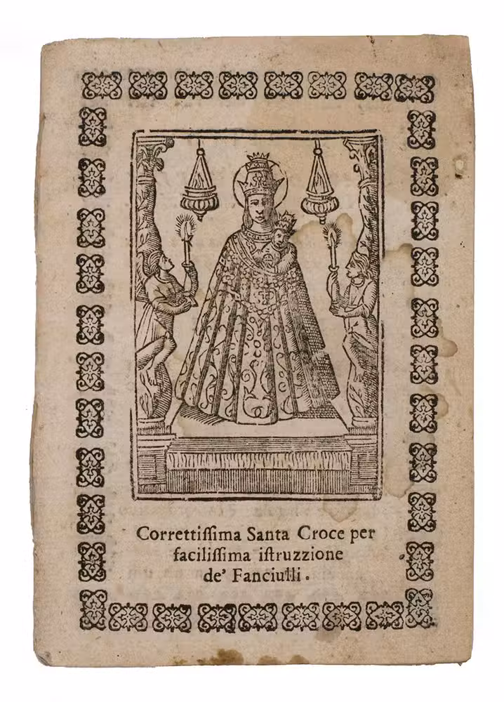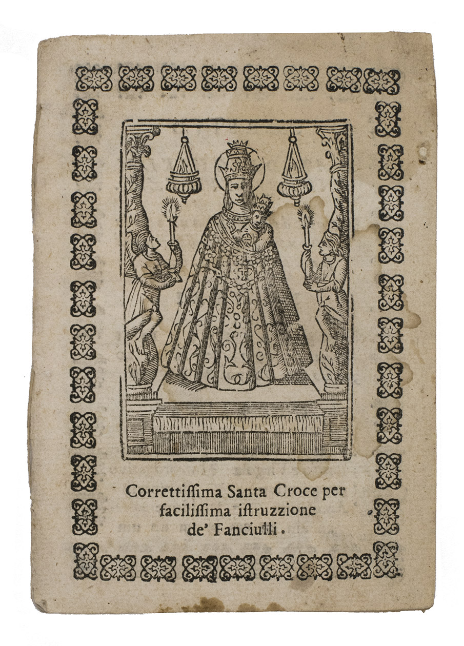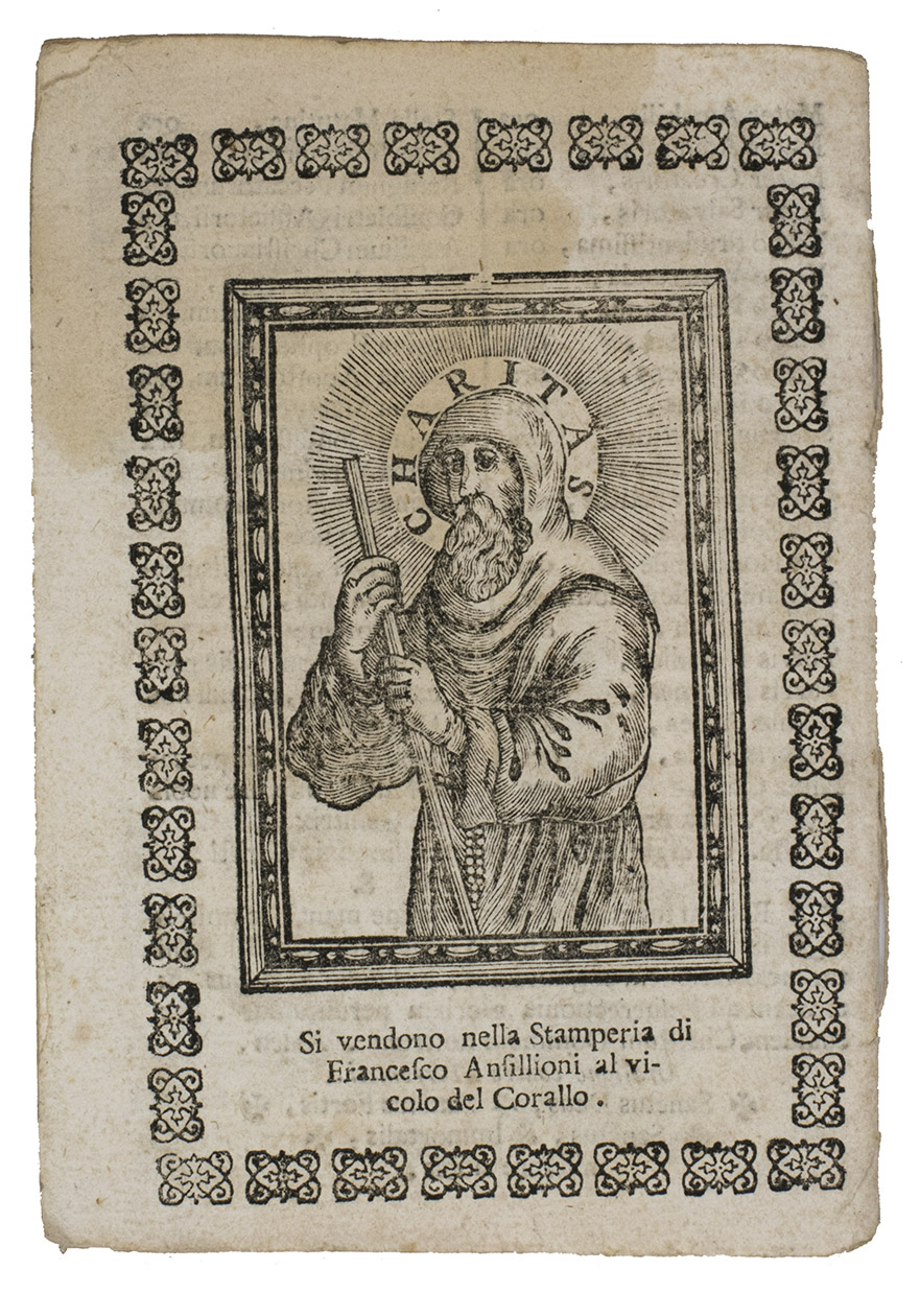 [Rome], Francesco Ansillioni, [ca. 1750]. Small 8vo. With 2 nearly full-page woodcuts (the Holy Virgin on the front cover and a monk with a shining nimbus containing the word "charitas" around his head on the back cover) and 7 small religious woodcuts in text. Front and back cover and the first two pages with alphabets and numbers in ornamental woodcut borders. Sewn. [16] pp.