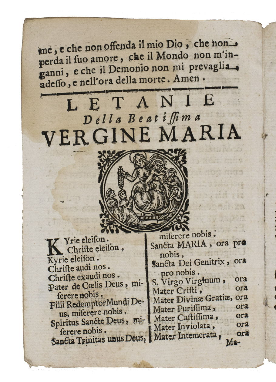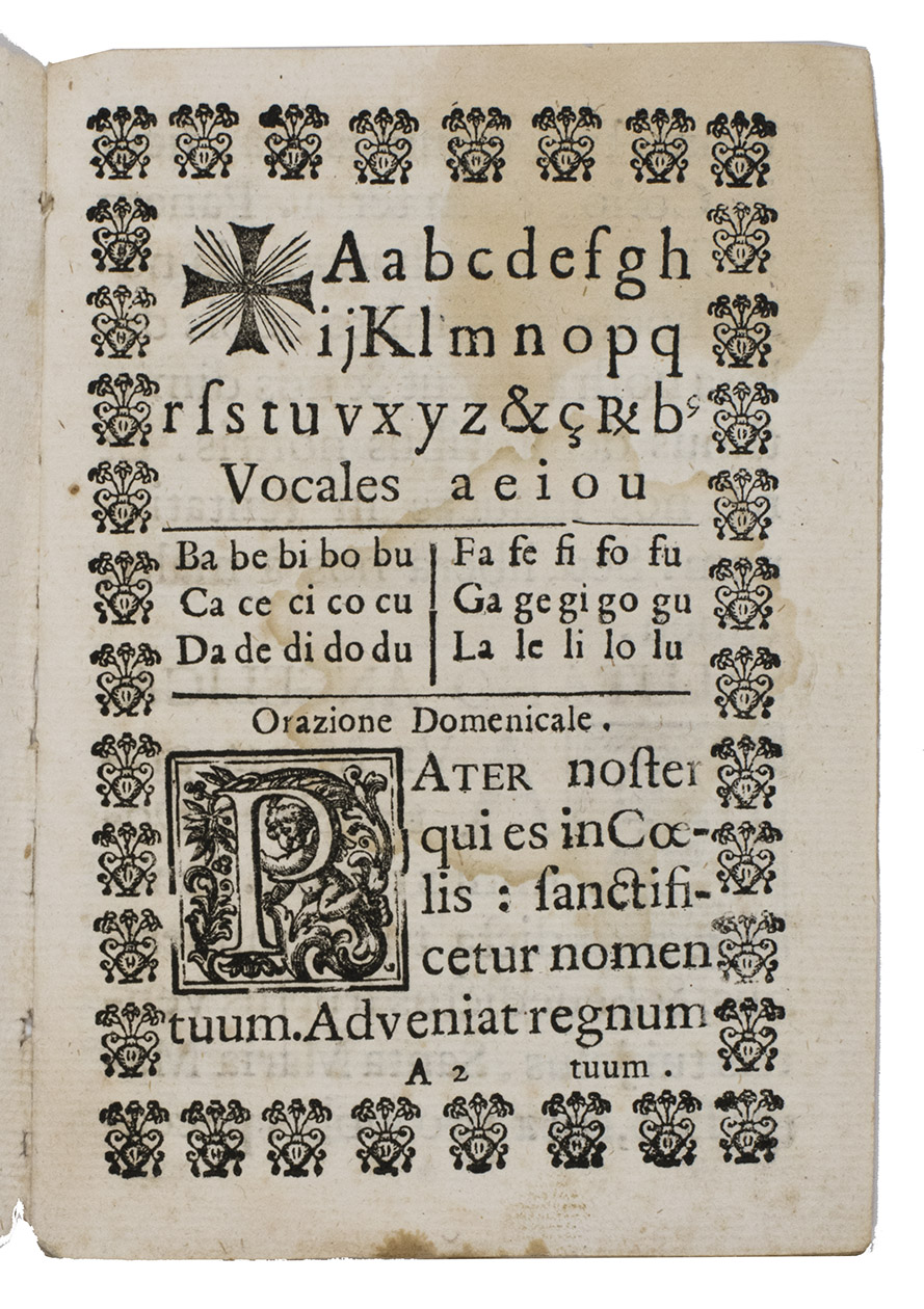 Only copy located of a Latin ABC book for children, published in Italy, starting with alphabets on the back of the title-page and continuing on the next page, also introducing the Latin names for the punctuation marks and including reading exercises in one-syllable words. As in many ABC books, the alphabets are followed by the most important prayers and texts from the catechism, for example the Lord's Prayer, which is followed by the Ave Maria and some other prayers in Latin to the Holy Virgin, Benedictus, Angelus Dei, antiphons, a list of symbols of the twelve apostles, prayers for during the mass, litanies (for example of the Blessed Virgin Mary), etc. This tiny book shows the strong 18th-century connection between children's education and religion: when learning to read and to write, the young children had to concern themselves with religious texts. We couldn't trace any other copy of this rare ABC book, which is beautifully illustrated with small religious woodcuts. The book collates A-B4.