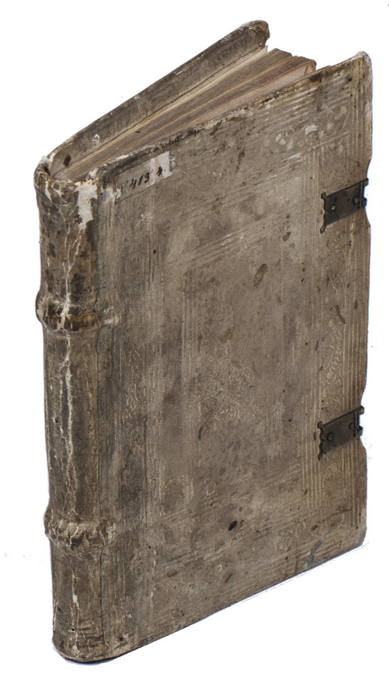 (Colophon: Lyon, Antoine Blanchard, 1528. Small 8vo. With a title-page with a 4-piece decorated woodcut border with flowers, birds and snails, woodcut printer's device on last page, 6 woodcut initials and a leaf ornament. Set in 3 sizes of rotunda gothic types, with the title in roman capitals. Contemporary blind-tooled sheepskin(?) parchment over wooden boards, in a panel design with quadruple fillets and 2 decorative rolls, brass catch-plates and anchor-plates (straps and clasps lost). LXXXIII ll.