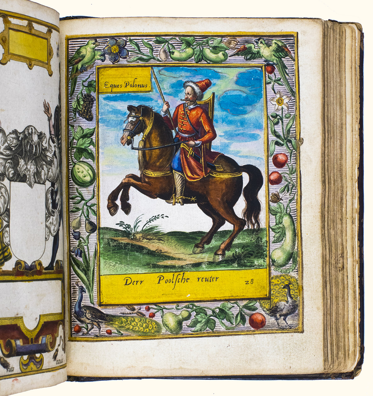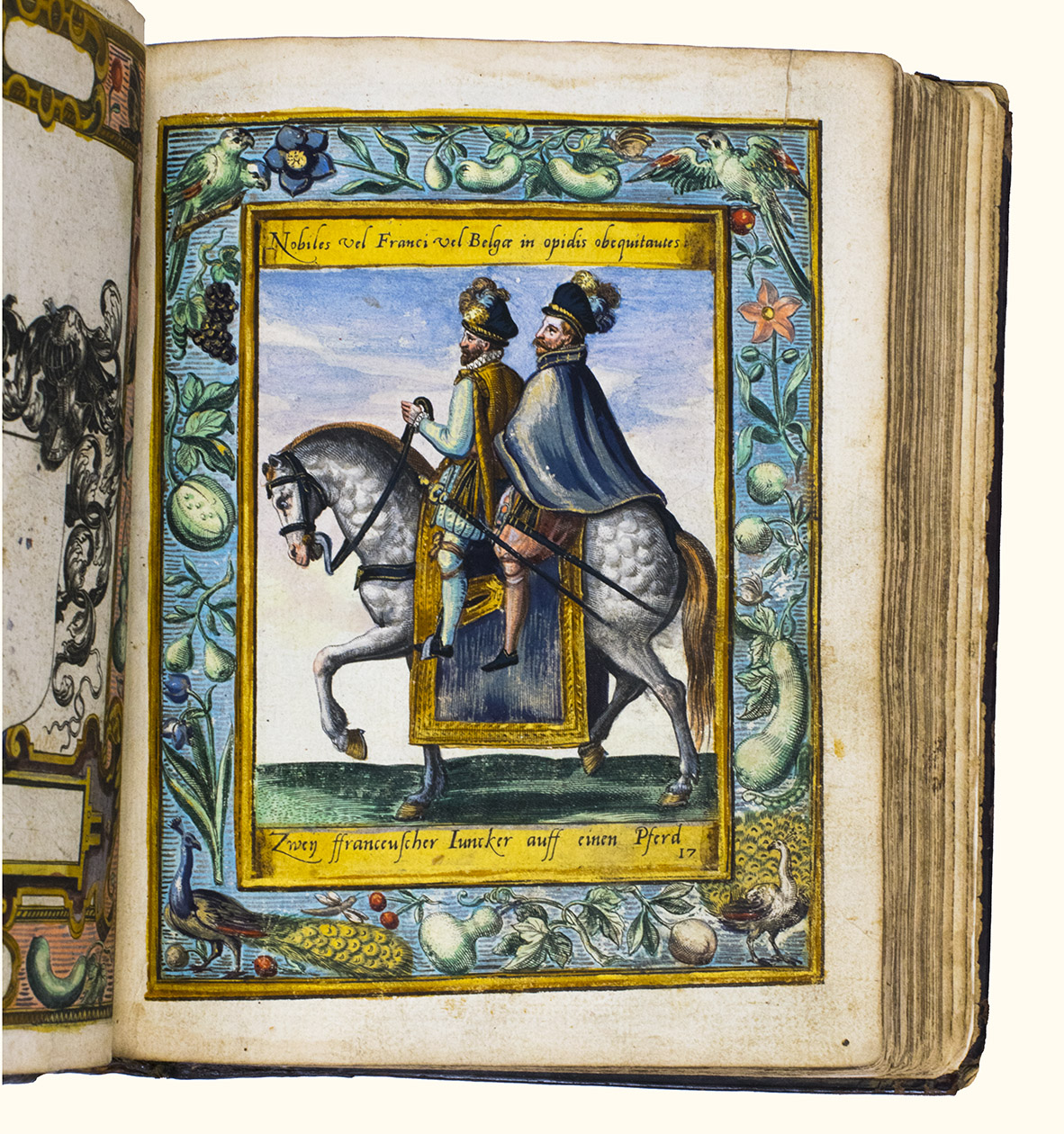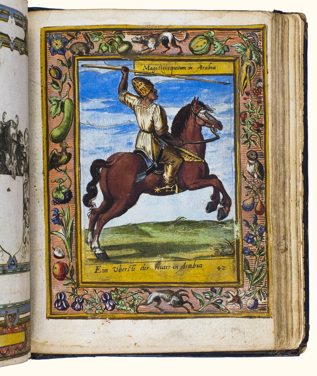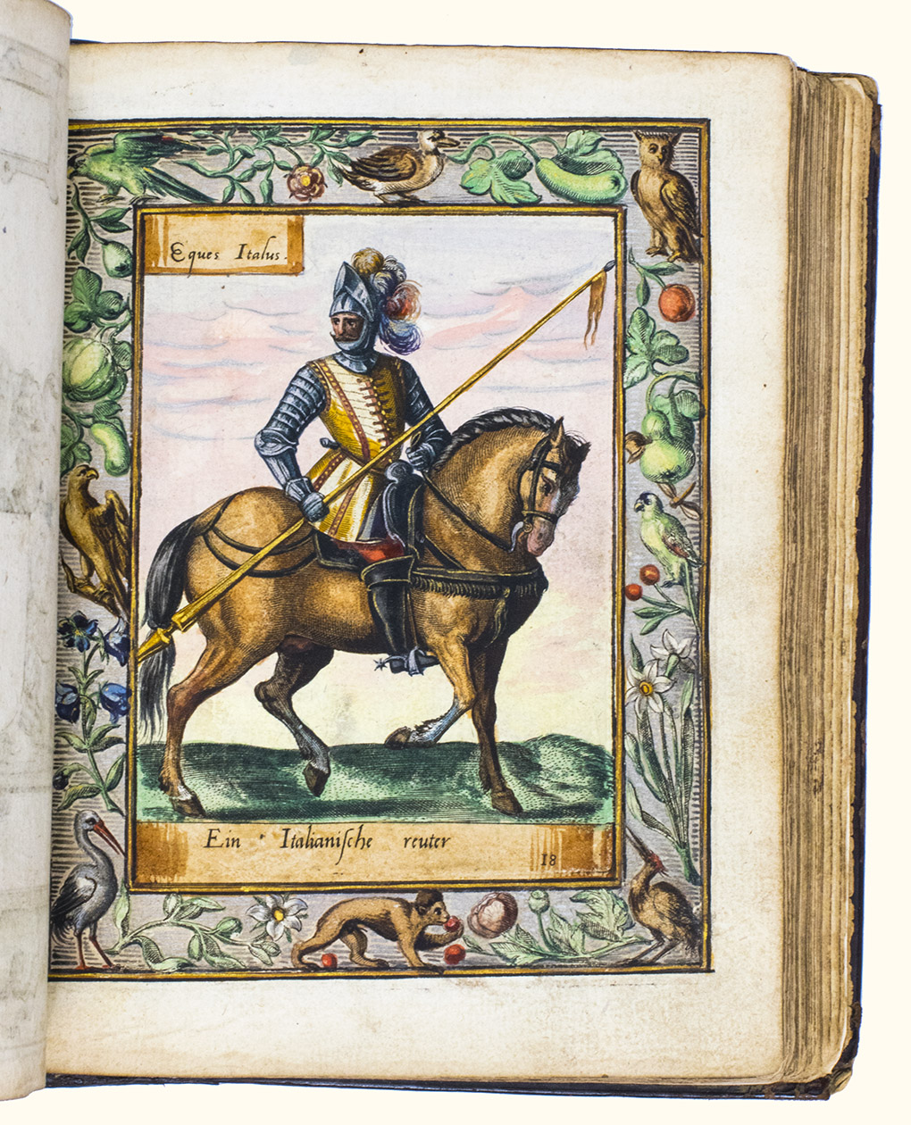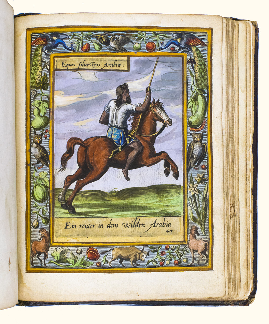 A remarkable album amicorum containing numerous late 16th- and early 17th-century inscriptions, bound in an elaborately decorated binding (dated 1590) and including more than 90 expertly hand-coloured and highlighted in gold engraved plates on equestrianism and heraldry. The engraved plates of horses (and in two cases dromedaries) and the nine pages of explanatory printed text at the beginning of the album were based on a late 16th-century work by the Flemish engraver Abraham de Bruyn (ca. 1539-1587), titled: Equitum descriptio, quomodo equestres... (ca. 1575/76). This work was published again in Cologne in 1577 with the following title Diversarum gentium armatura equestris; each engraving shows a horseman from a particular country or region, including Germany, the Low Countries, France, Ireland, Italy, Spain, Russia, Romania, Hungary, Poland, Turkey, Persia, Egypt, Arabia, and more. De Bruyn's set of engravings was altered and expanded by the Flemish artist, Caspar Ruts (1530-1607), who later moved to Germany. Ruts (or Rutz) added two different types of plates meant for drawing coats-of-arms and family crests: the first type shows a crest flanked by a woman and a man (signed in the plate "Caspar Ruts excudit") and the second shows a crest in an ornamental frame. This frame is present in several versions: one type contains fruit and insects; a second one contains parrots, squirrels and fruit; a third shows flowers, berries and butterflies.