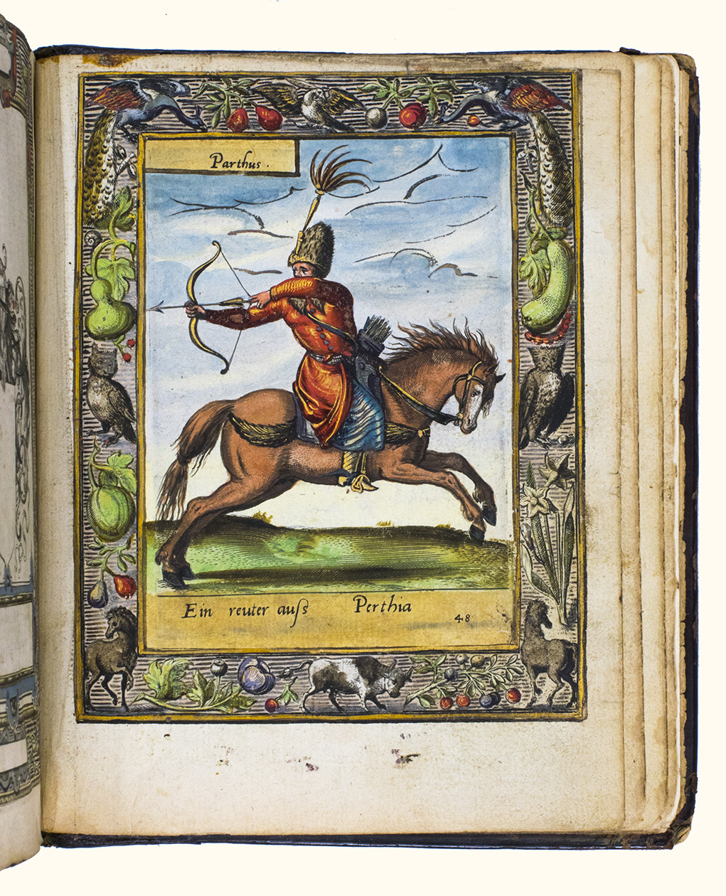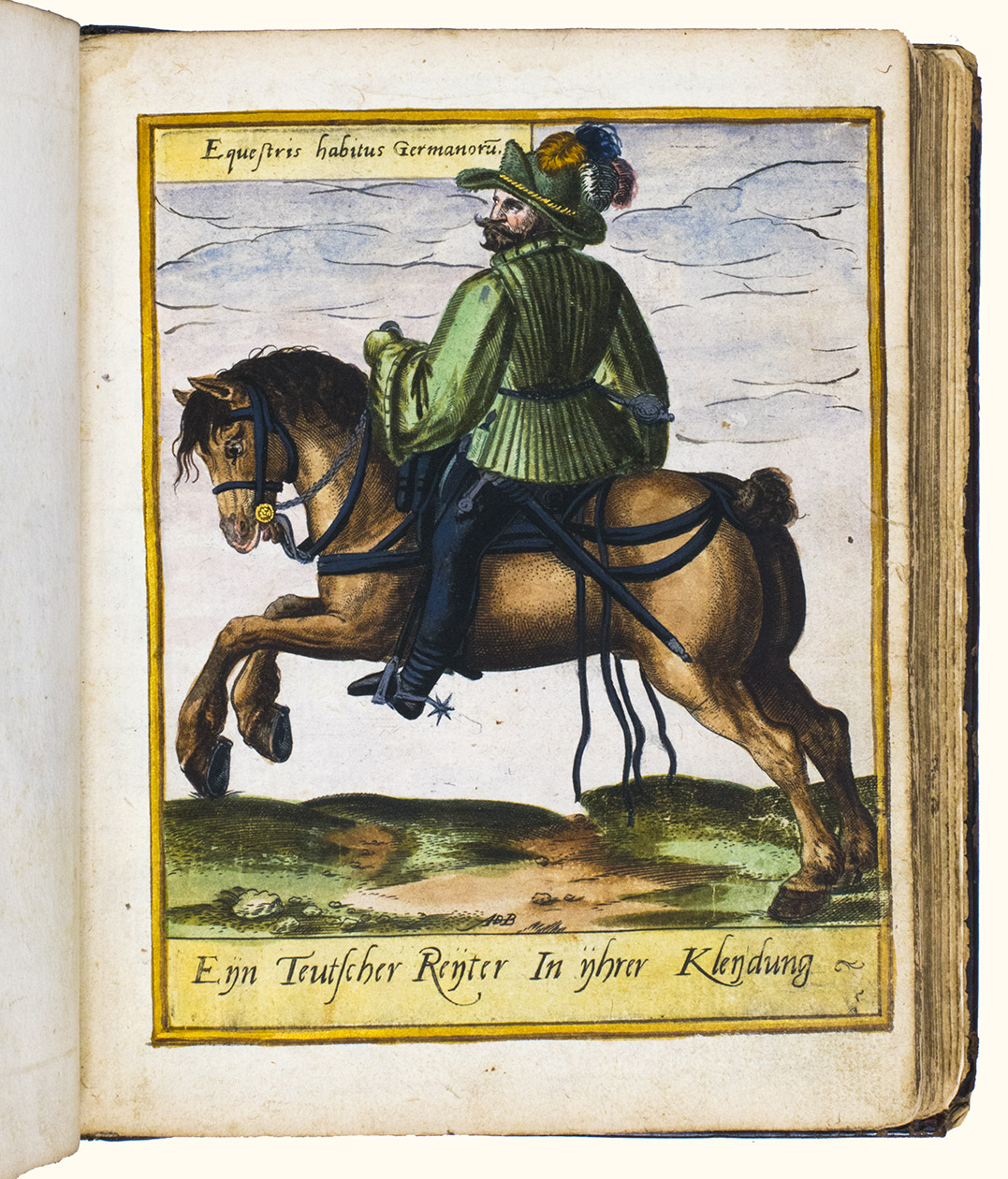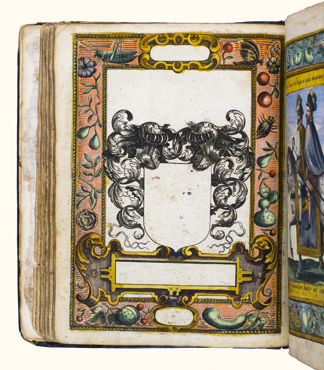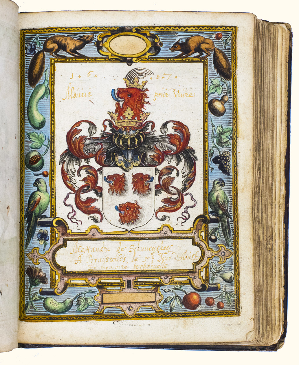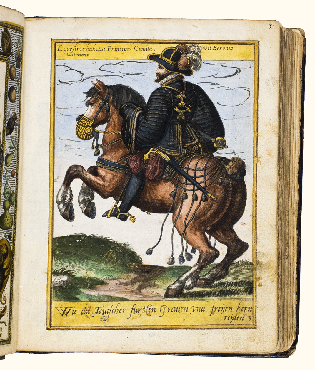 A remarkable album amicorum containing numerous late 16th- and early 17th-century inscriptions, bound in an elaborately decorated binding (dated 1590) and including more than 90 expertly hand-coloured and highlighted in gold engraved plates on equestrianism and heraldry. The engraved plates of horses (and in two cases dromedaries) and the nine pages of explanatory printed text at the beginning of the album were based on a late 16th-century work by the Flemish engraver Abraham de Bruyn (ca. 1539-1587), titled: Equitum descriptio, quomodo equestres... (ca. 1575/76). This work was published again in Cologne in 1577 with the following title Diversarum gentium armatura equestris; each engraving shows a horseman from a particular country or region, including Germany, the Low Countries, France, Ireland, Italy, Spain, Russia, Romania, Hungary, Poland, Turkey, Persia, Egypt, Arabia, and more. De Bruyn's set of engravings was altered and expanded by the Flemish artist, Caspar Ruts (1530-1607), who later moved to Germany. Ruts (or Rutz) added two different types of plates meant for drawing coats-of-arms and family crests: the first type shows a crest flanked by a woman and a man (signed in the plate "Caspar Ruts excudit") and the second shows a crest in an ornamental frame. This frame is present in several versions: one type contains fruit and insects; a second one contains parrots, squirrels and fruit; a third shows flowers, berries and butterflies.