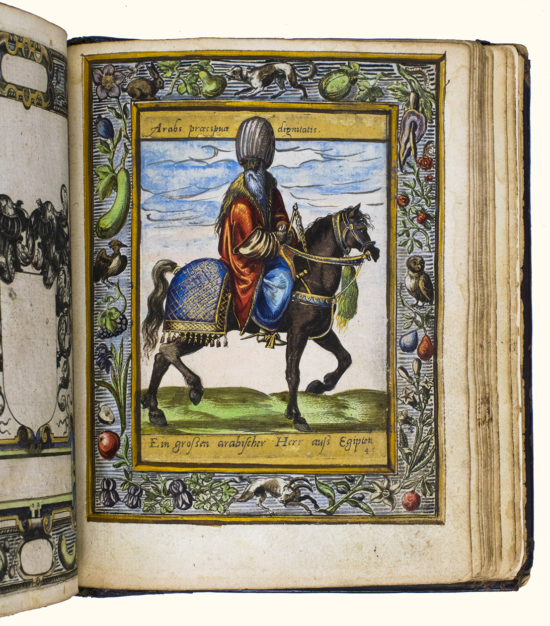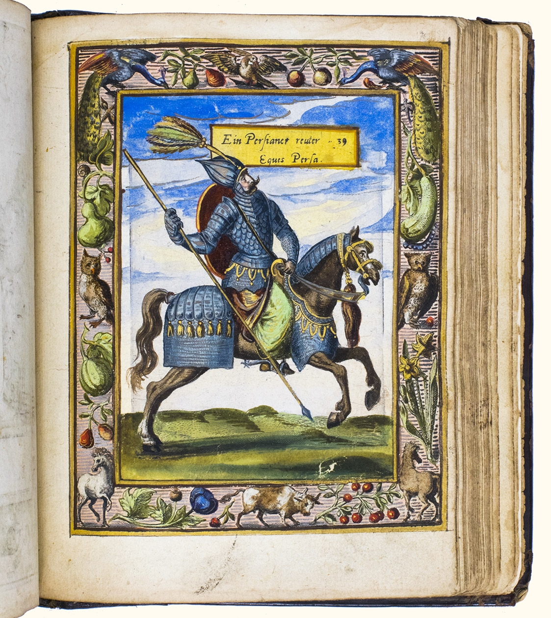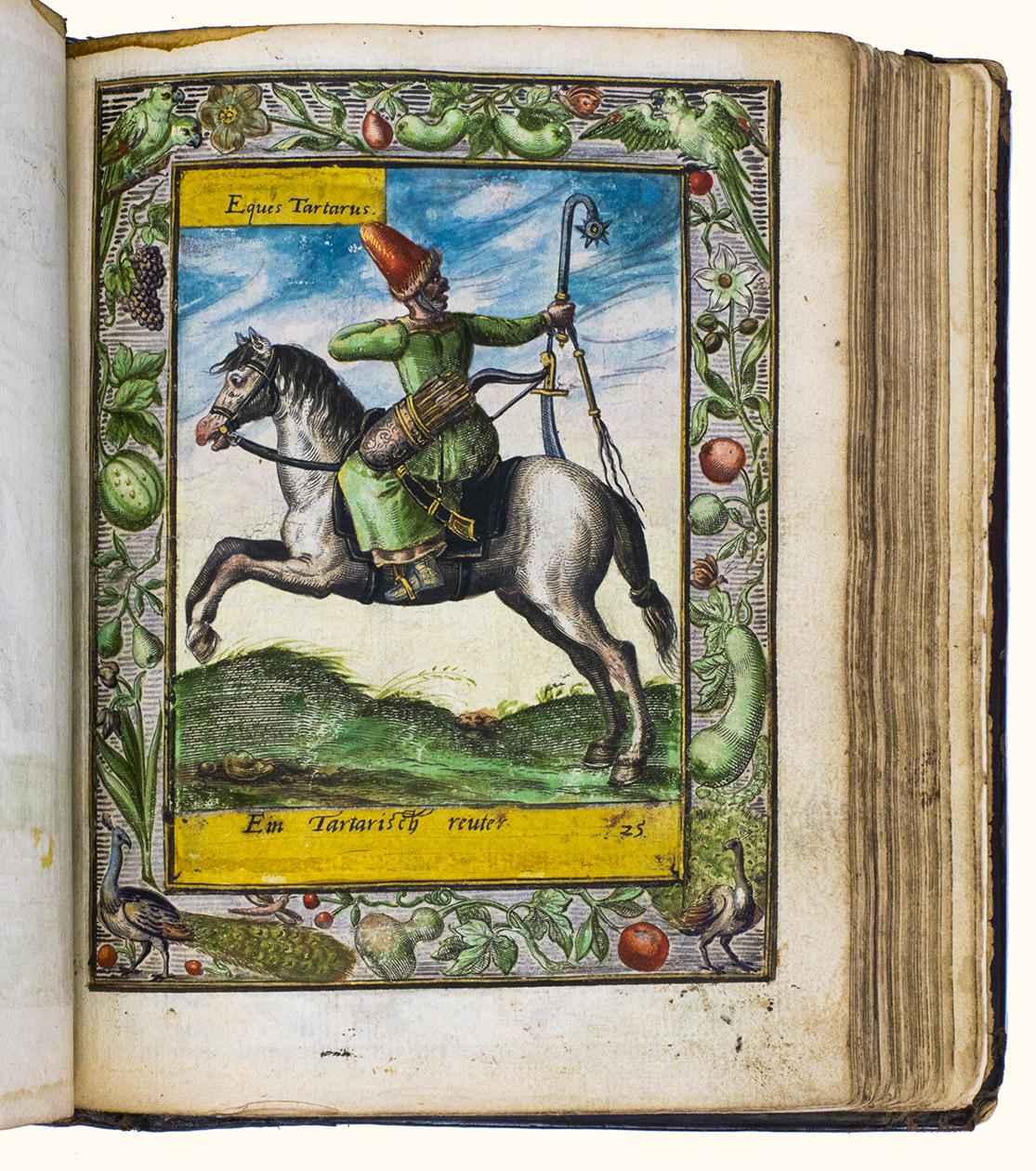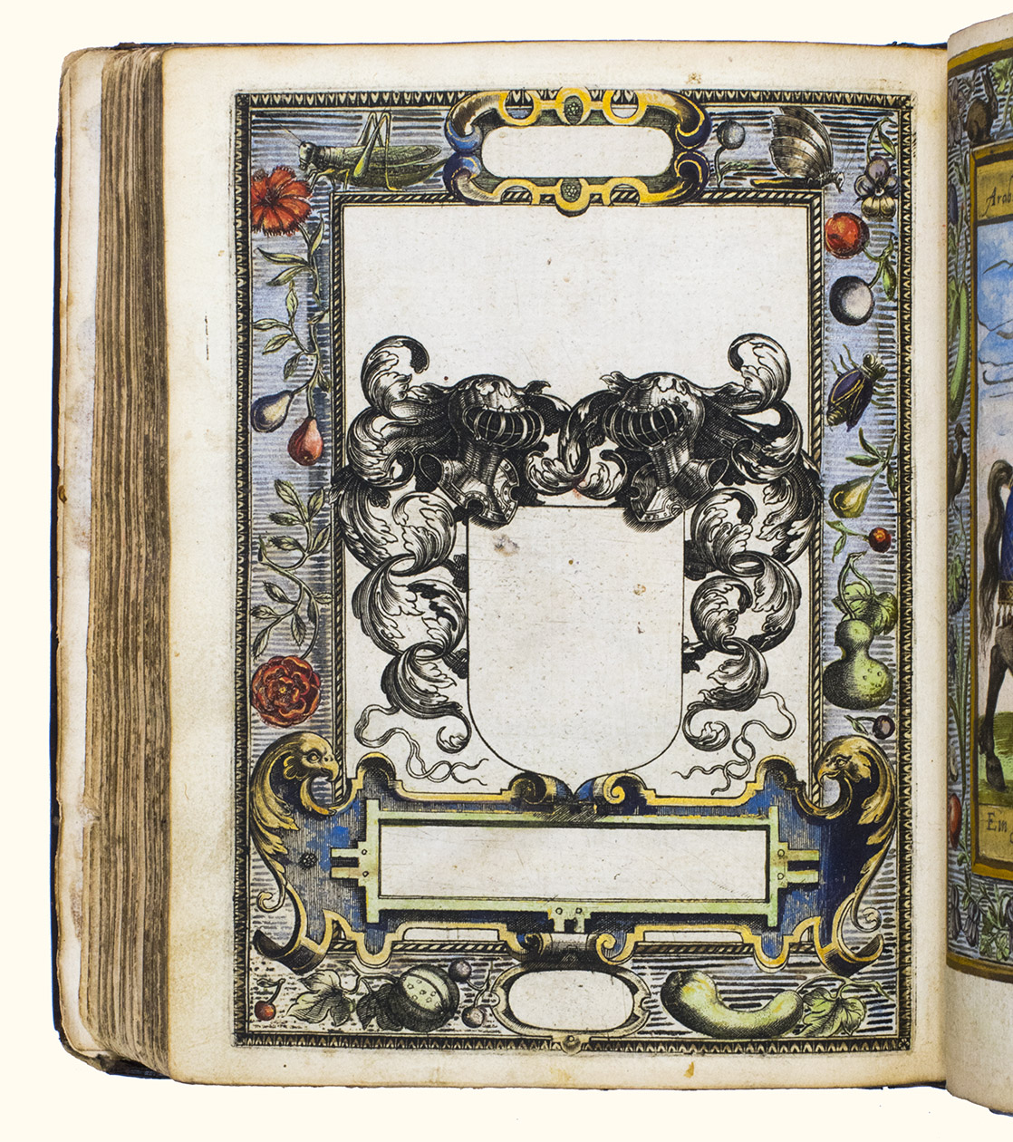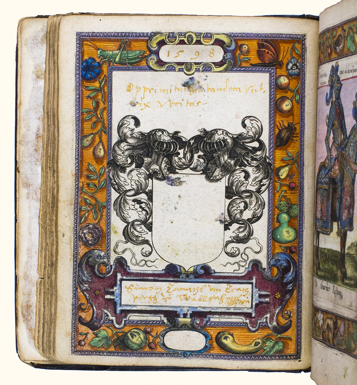 A remarkable album amicorum containing numerous late 16th- and early 17th-century inscriptions, bound in an elaborately decorated binding (dated 1590) and including more than 90 expertly hand-coloured and highlighted in gold engraved plates on equestrianism and heraldry. The engraved plates of horses (and in two cases dromedaries) and the nine pages of explanatory printed text at the beginning of the album were based on a late 16th-century work by the Flemish engraver Abraham de Bruyn (ca. 1539-1587), titled: Equitum descriptio, quomodo equestres... (ca. 1575/76). This work was published again in Cologne in 1577 with the following title Diversarum gentium armatura equestris; each engraving shows a horseman from a particular country or region, including Germany, the Low Countries, France, Ireland, Italy, Spain, Russia, Romania, Hungary, Poland, Turkey, Persia, Egypt, Arabia, and more. De Bruyn's set of engravings was altered and expanded by the Flemish artist, Caspar Ruts (1530-1607), who later moved to Germany. Ruts (or Rutz) added two different types of plates meant for drawing coats-of-arms and family crests: the first type shows a crest flanked by a woman and a man (signed in the plate "Caspar Ruts excudit") and the second shows a crest in an ornamental frame. This frame is present in several versions: one type contains fruit and insects; a second one contains parrots, squirrels and fruit; a third shows flowers, berries and butterflies.