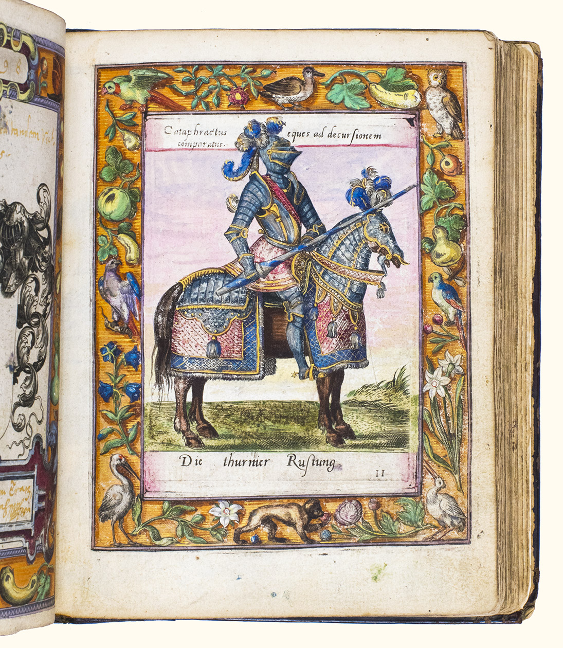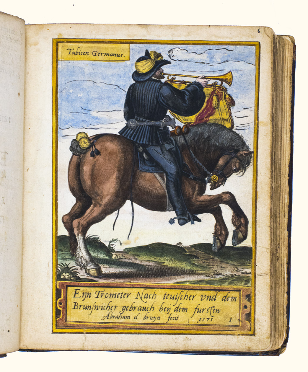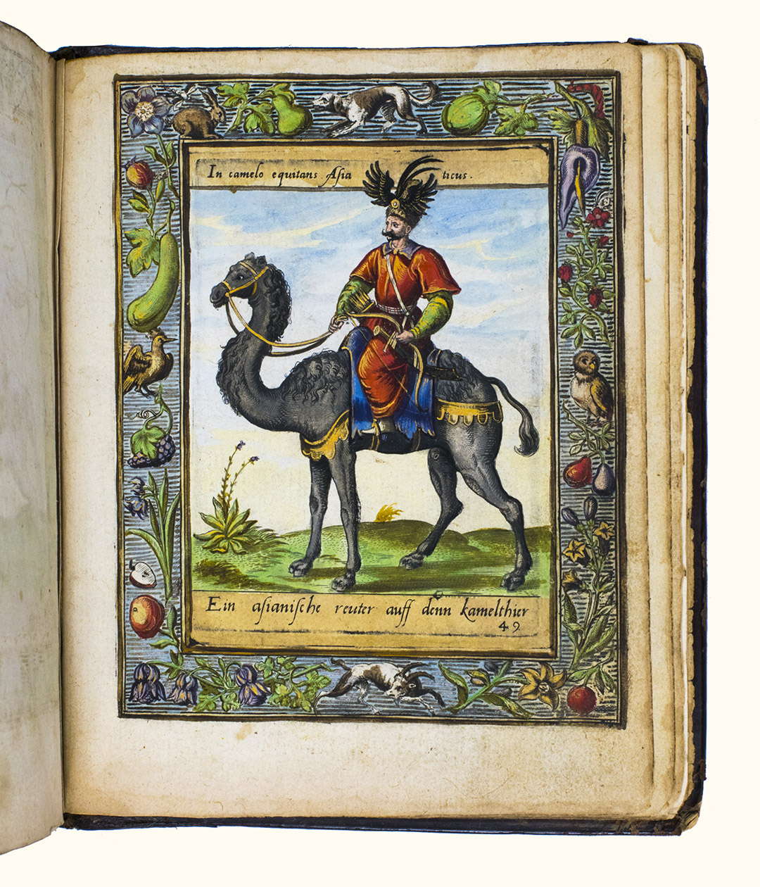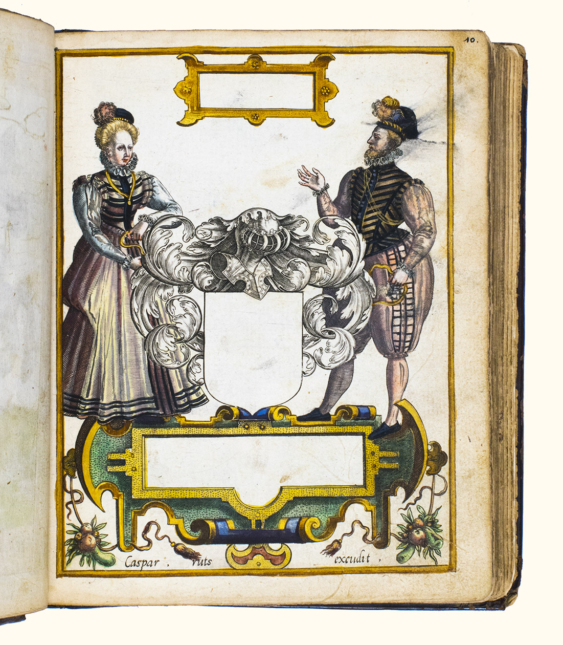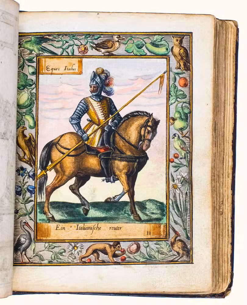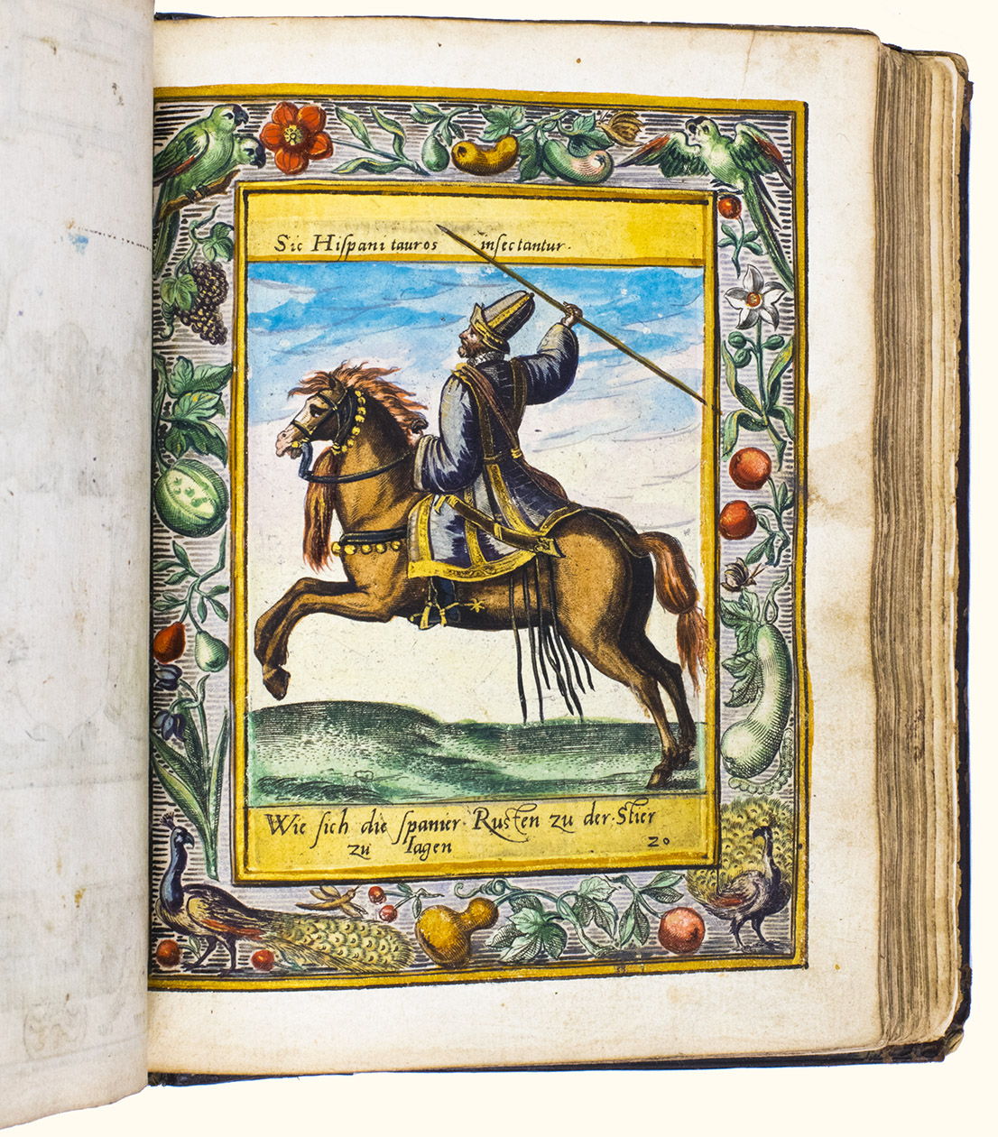 A remarkable album amicorum containing numerous late 16th- and early 17th-century inscriptions, bound in an elaborately decorated binding (dated 1590) and including more than 90 expertly hand-coloured and highlighted in gold engraved plates on equestrianism and heraldry. The engraved plates of horses (and in two cases dromedaries) and the nine pages of explanatory printed text at the beginning of the album were based on a late 16th-century work by the Flemish engraver Abraham de Bruyn (ca. 1539-1587), titled: Equitum descriptio, quomodo equestres... (ca. 1575/76). This work was published again in Cologne in 1577 with the following title Diversarum gentium armatura equestris; each engraving shows a horseman from a particular country or region, including Germany, the Low Countries, France, Ireland, Italy, Spain, Russia, Romania, Hungary, Poland, Turkey, Persia, Egypt, Arabia, and more. De Bruyn's set of engravings was altered and expanded by the Flemish artist, Caspar Ruts (1530-1607), who later moved to Germany. Ruts (or Rutz) added two different types of plates meant for drawing coats-of-arms and family crests: the first type shows a crest flanked by a woman and a man (signed in the plate "Caspar Ruts excudit") and the second shows a crest in an ornamental frame. This frame is present in several versions: one type contains fruit and insects; a second one contains parrots, squirrels and fruit; a third shows flowers, berries and butterflies.