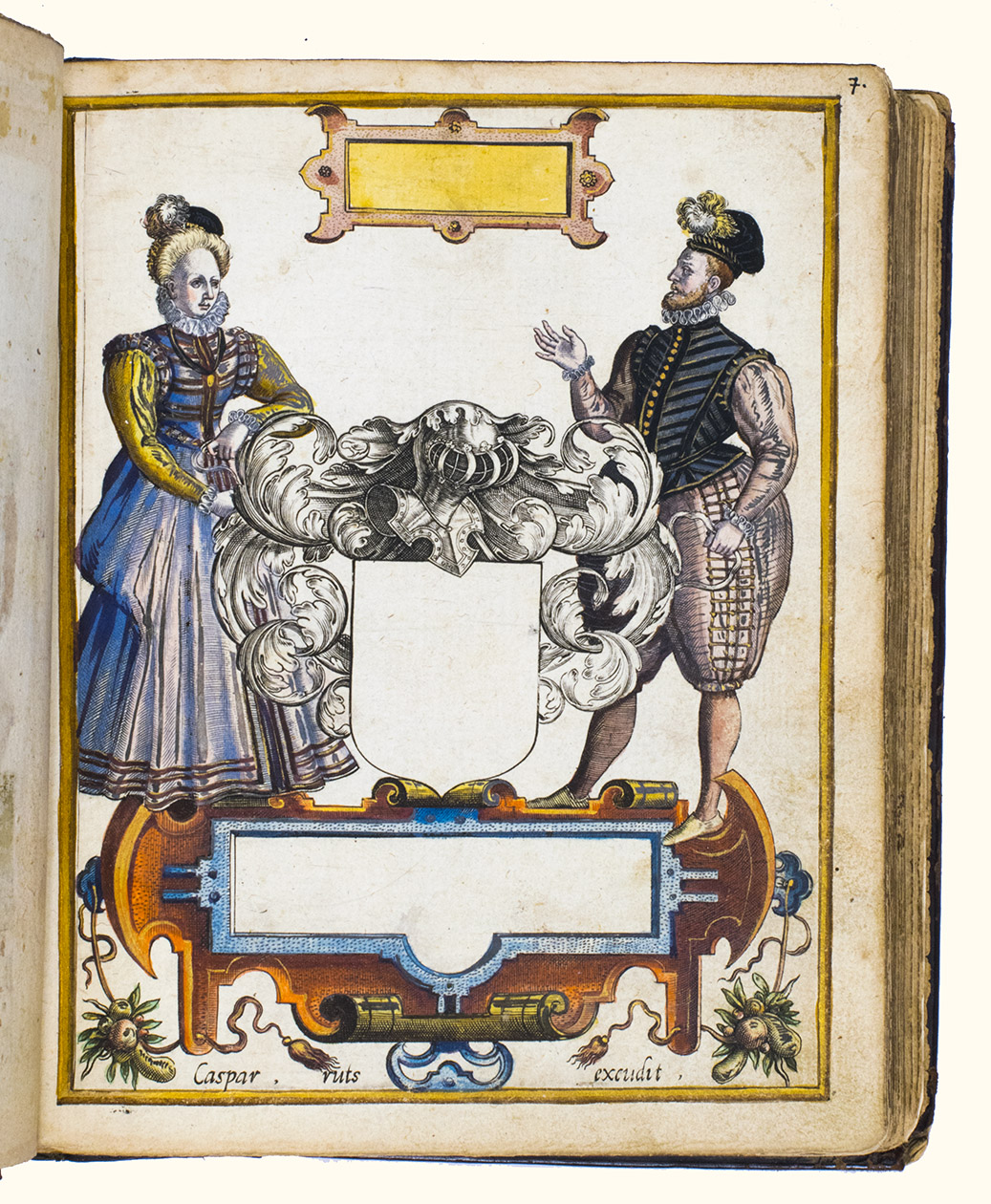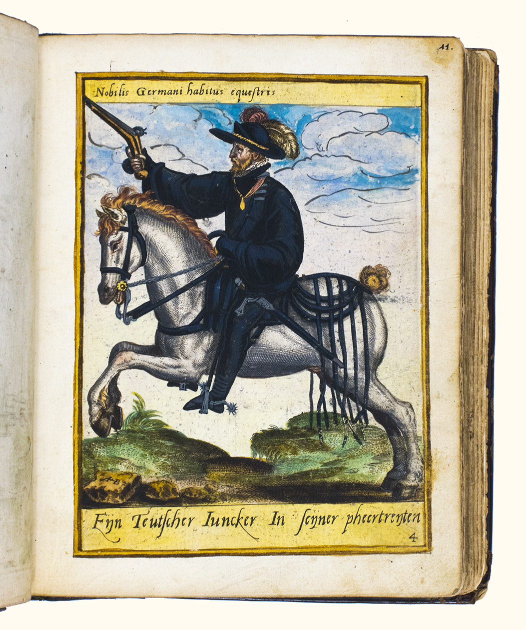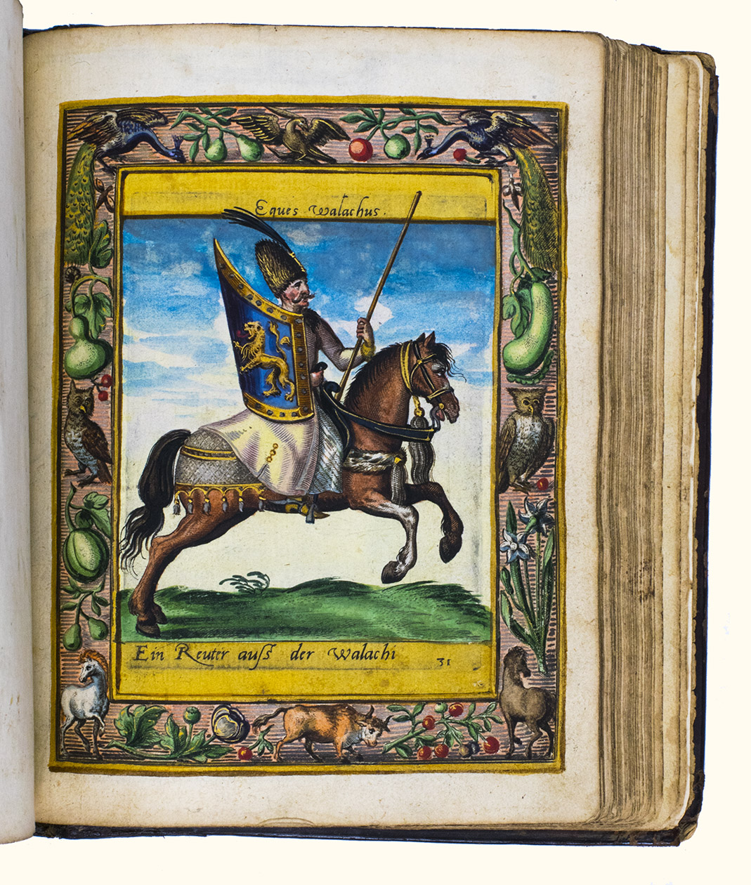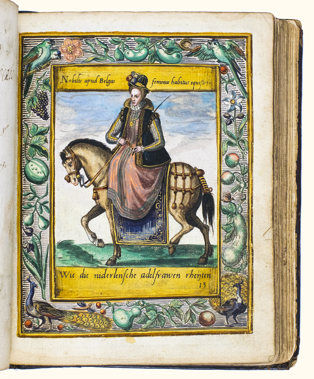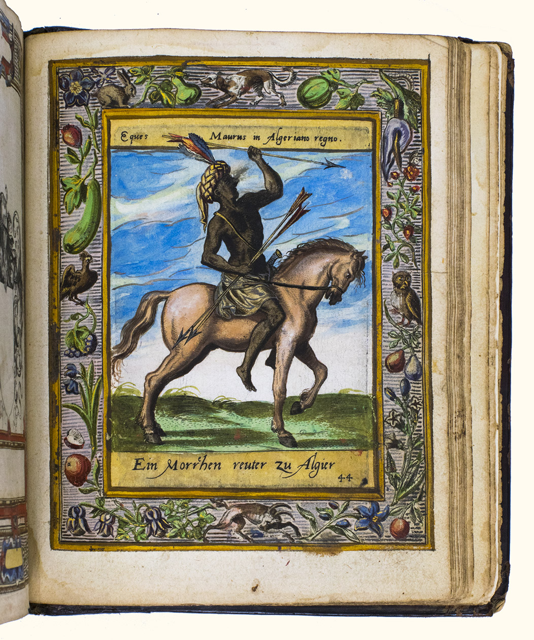 A remarkable album amicorum containing numerous late 16th- and early 17th-century inscriptions, bound in an elaborately decorated binding (dated 1590) and including more than 90 expertly hand-coloured and highlighted in gold engraved plates on equestrianism and heraldry. The engraved plates of horses (and in two cases dromedaries) and the nine pages of explanatory printed text at the beginning of the album were based on a late 16th-century work by the Flemish engraver Abraham de Bruyn (ca. 1539-1587), titled: Equitum descriptio, quomodo equestres... (ca. 1575/76). This work was published again in Cologne in 1577 with the following title Diversarum gentium armatura equestris; each engraving shows a horseman from a particular country or region, including Germany, the Low Countries, France, Ireland, Italy, Spain, Russia, Romania, Hungary, Poland, Turkey, Persia, Egypt, Arabia, and more. De Bruyn's set of engravings was altered and expanded by the Flemish artist, Caspar Ruts (1530-1607), who later moved to Germany. Ruts (or Rutz) added two different types of plates meant for drawing coats-of-arms and family crests: the first type shows a crest flanked by a woman and a man (signed in the plate "Caspar Ruts excudit") and the second shows a crest in an ornamental frame. This frame is present in several versions: one type contains fruit and insects; a second one contains parrots, squirrels and fruit; a third shows flowers, berries and butterflies.