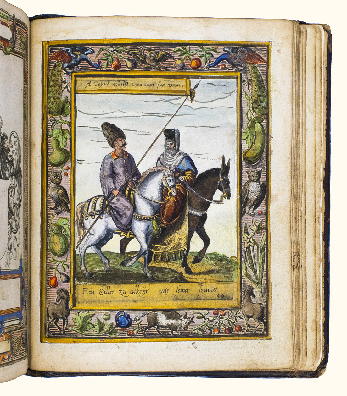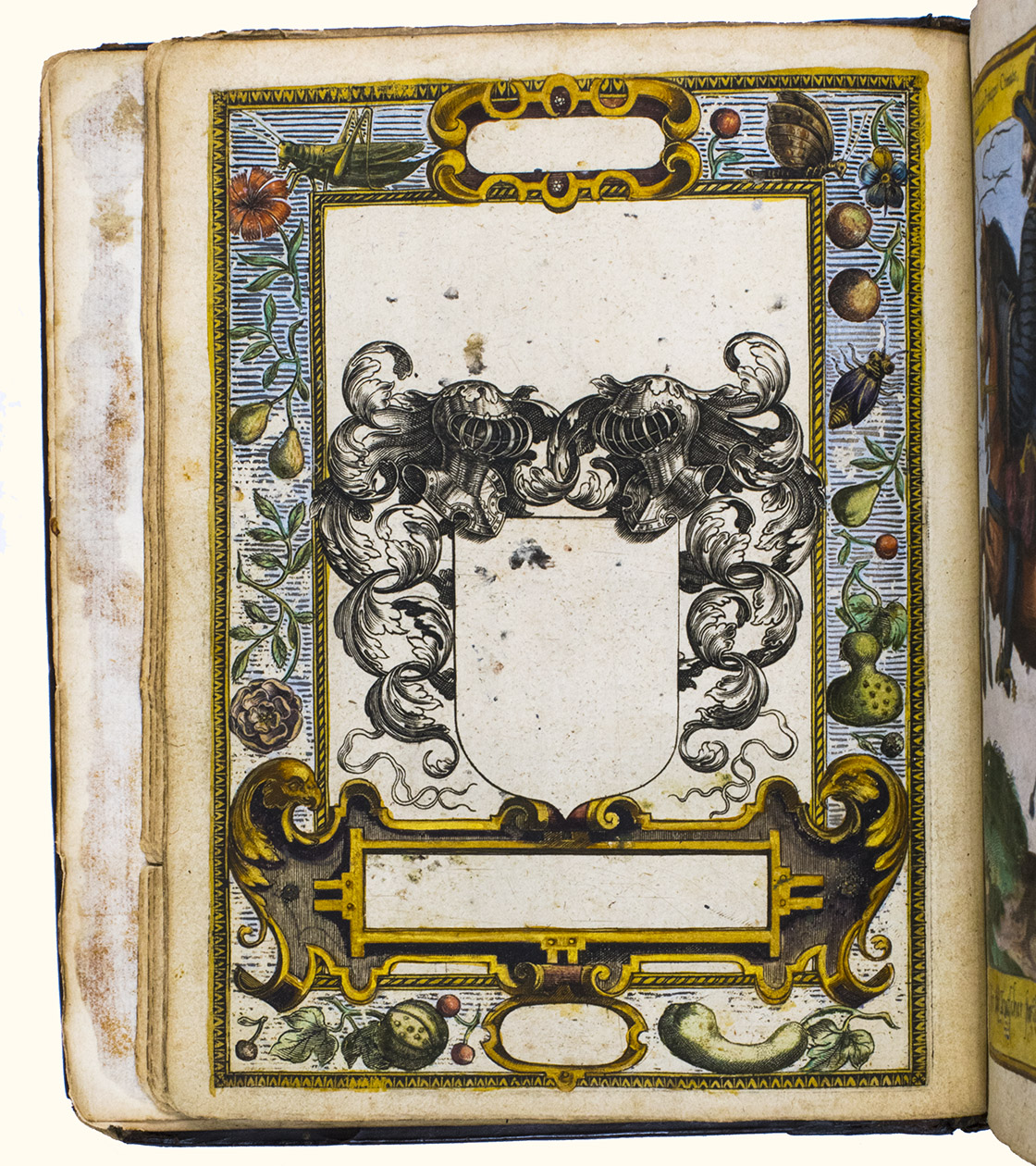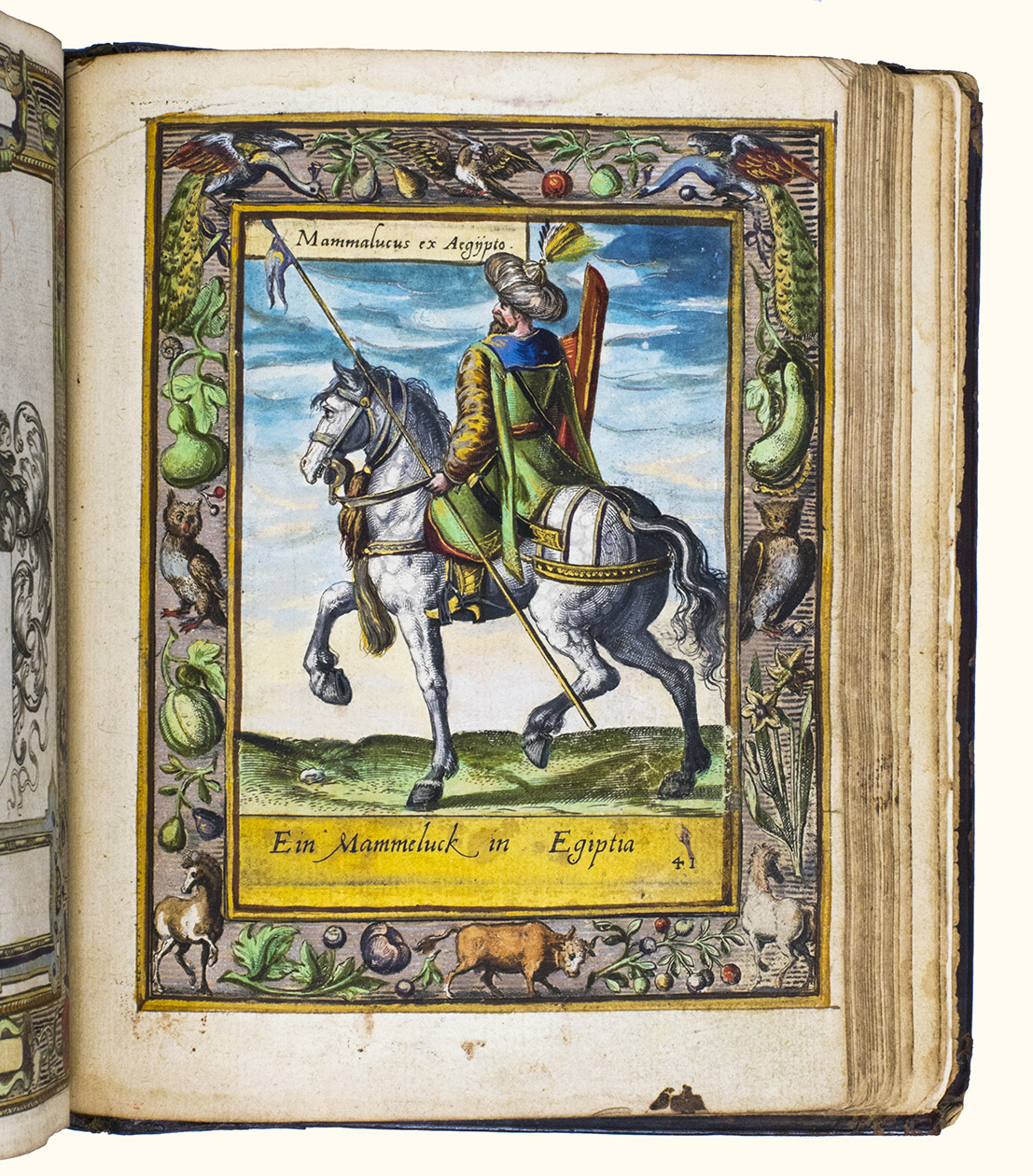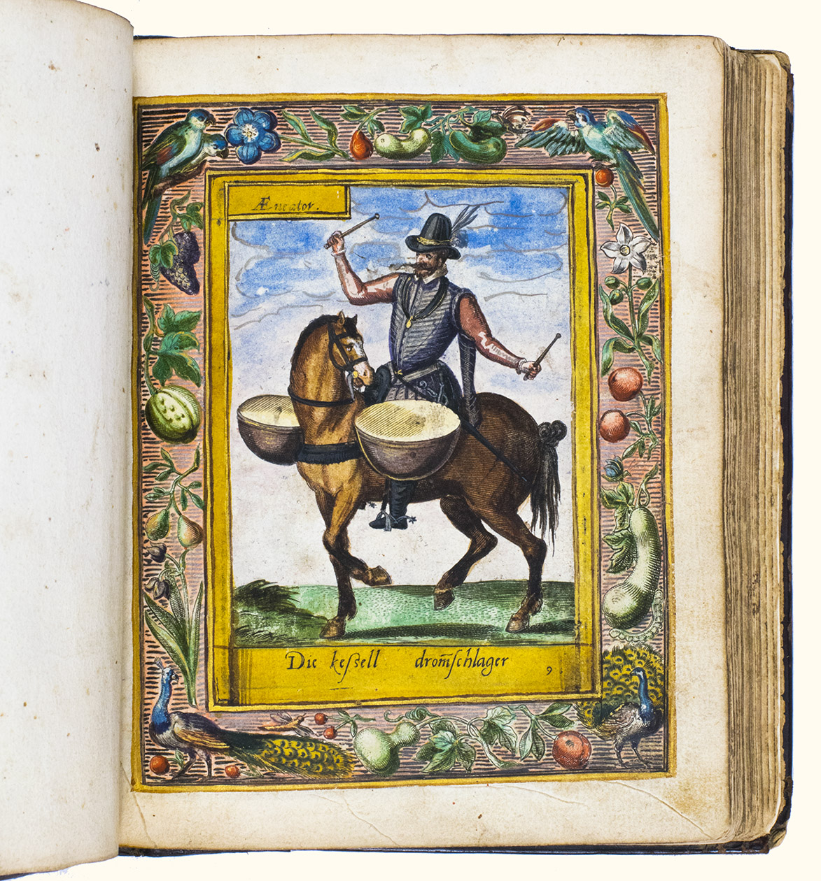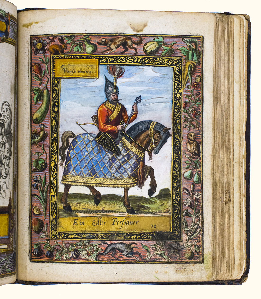 A remarkable album amicorum containing numerous late 16th- and early 17th-century inscriptions, bound in an elaborately decorated binding (dated 1590) and including more than 90 expertly hand-coloured and highlighted in gold engraved plates on equestrianism and heraldry. The engraved plates of horses (and in two cases dromedaries) and the nine pages of explanatory printed text at the beginning of the album were based on a late 16th-century work by the Flemish engraver Abraham de Bruyn (ca. 1539-1587), titled: Equitum descriptio, quomodo equestres... (ca. 1575/76). This work was published again in Cologne in 1577 with the following title Diversarum gentium armatura equestris; each engraving shows a horseman from a particular country or region, including Germany, the Low Countries, France, Ireland, Italy, Spain, Russia, Romania, Hungary, Poland, Turkey, Persia, Egypt, Arabia, and more. De Bruyn's set of engravings was altered and expanded by the Flemish artist, Caspar Ruts (1530-1607), who later moved to Germany. Ruts (or Rutz) added two different types of plates meant for drawing coats-of-arms and family crests: the first type shows a crest flanked by a woman and a man (signed in the plate "Caspar Ruts excudit") and the second shows a crest in an ornamental frame. This frame is present in several versions: one type contains fruit and insects; a second one contains parrots, squirrels and fruit; a third shows flowers, berries and butterflies.