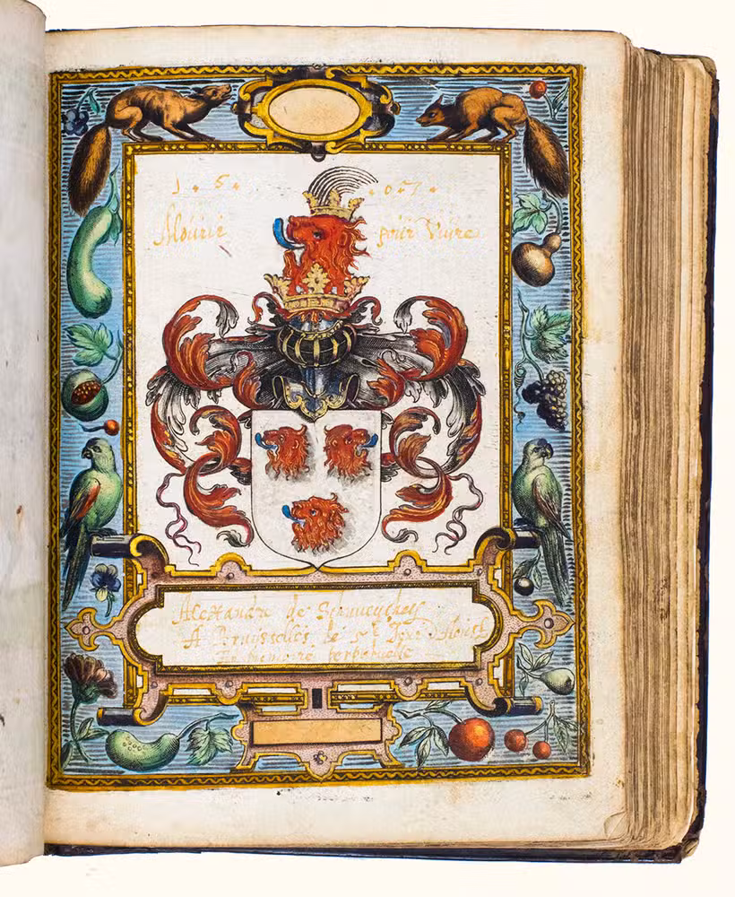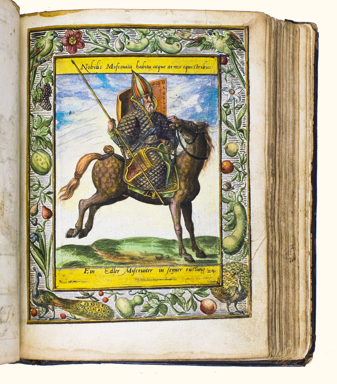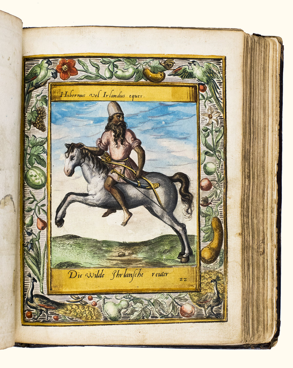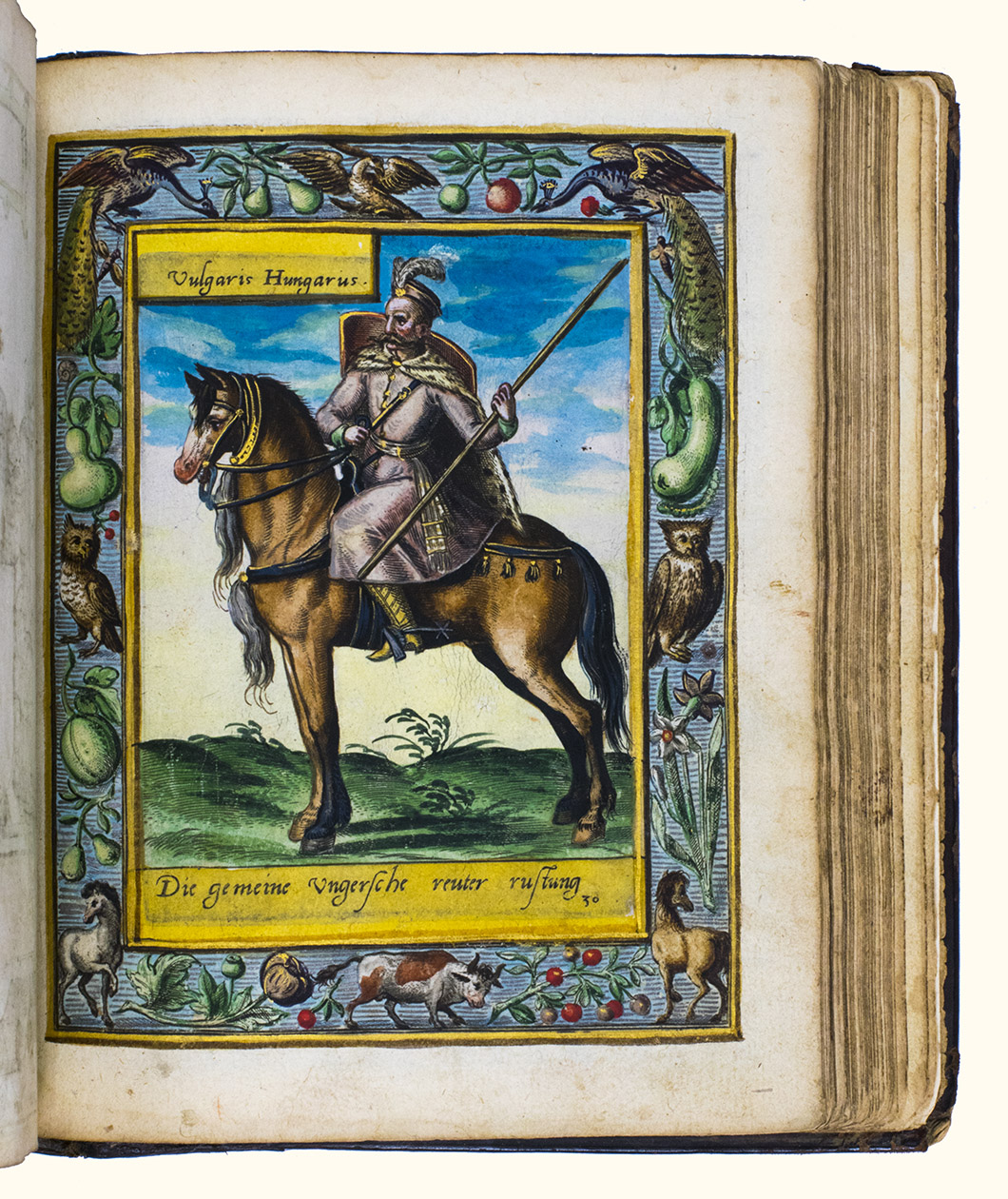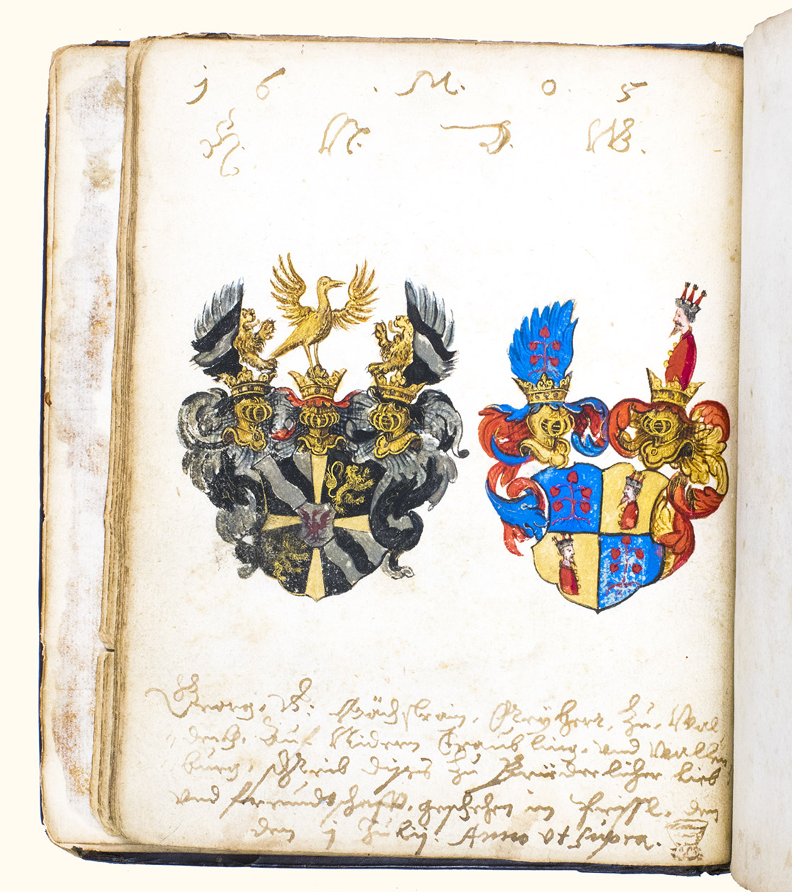 A remarkable album amicorum containing numerous late 16th- and early 17th-century inscriptions, bound in an elaborately decorated binding (dated 1590) and including more than 90 expertly hand-coloured and highlighted in gold engraved plates on equestrianism and heraldry. The engraved plates of horses (and in two cases dromedaries) and the nine pages of explanatory printed text at the beginning of the album were based on a late 16th-century work by the Flemish engraver Abraham de Bruyn (ca. 1539-1587), titled: Equitum descriptio, quomodo equestres... (ca. 1575/76). This work was published again in Cologne in 1577 with the following title Diversarum gentium armatura equestris; each engraving shows a horseman from a particular country or region, including Germany, the Low Countries, France, Ireland, Italy, Spain, Russia, Romania, Hungary, Poland, Turkey, Persia, Egypt, Arabia, and more. De Bruyn's set of engravings was altered and expanded by the Flemish artist, Caspar Ruts (1530-1607), who later moved to Germany. Ruts (or Rutz) added two different types of plates meant for drawing coats-of-arms and family crests: the first type shows a crest flanked by a woman and a man (signed in the plate "Caspar Ruts excudit") and the second shows a crest in an ornamental frame. This frame is present in several versions: one type contains fruit and insects; a second one contains parrots, squirrels and fruit; a third shows flowers, berries and butterflies.