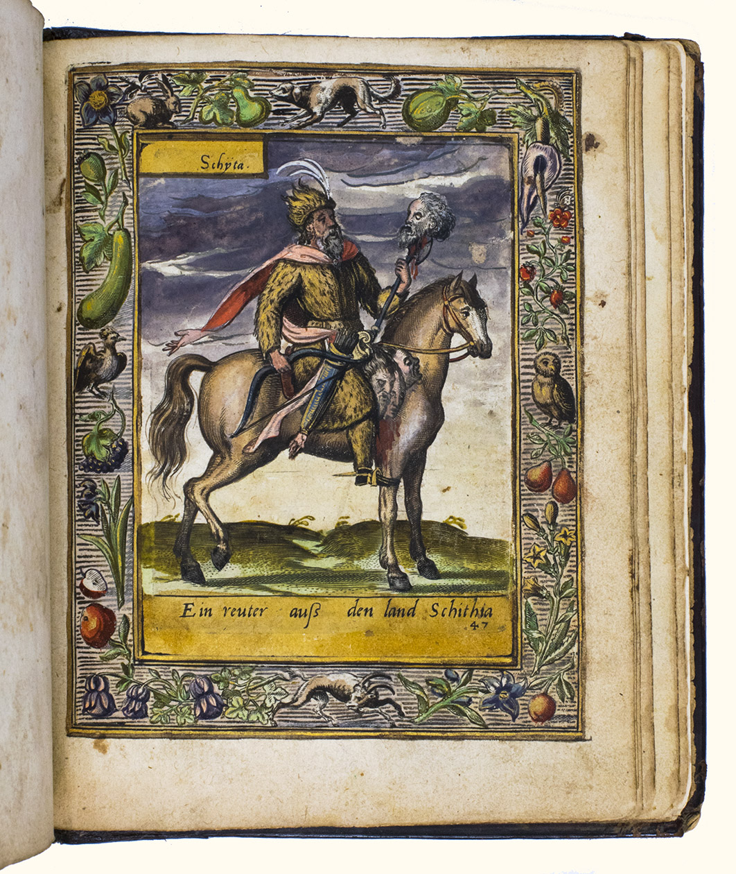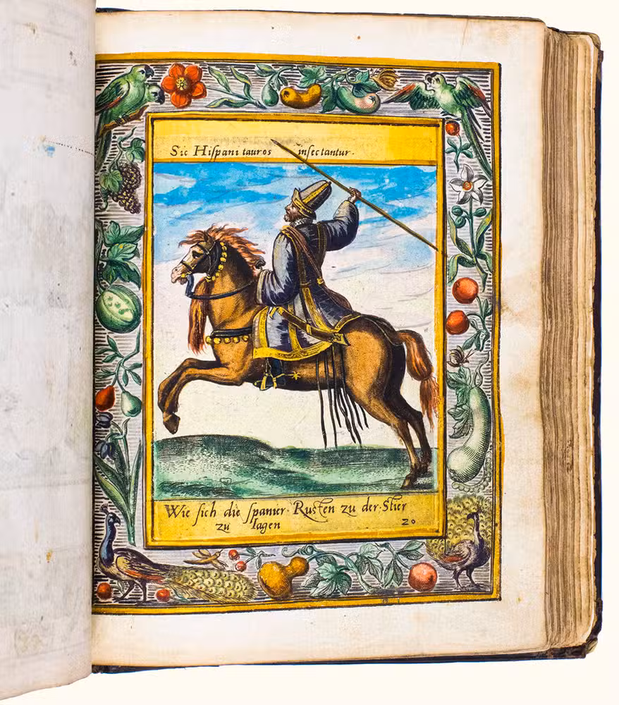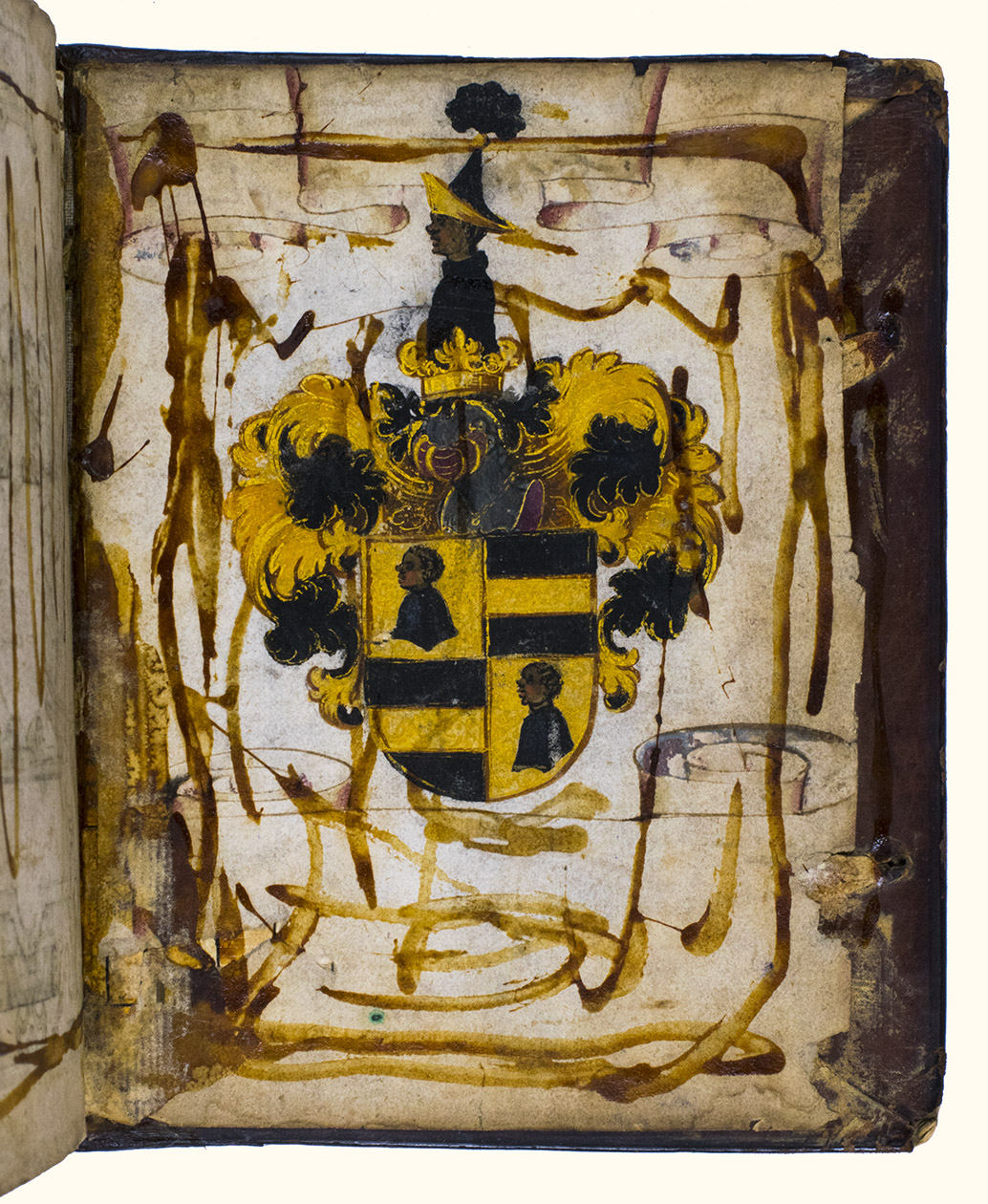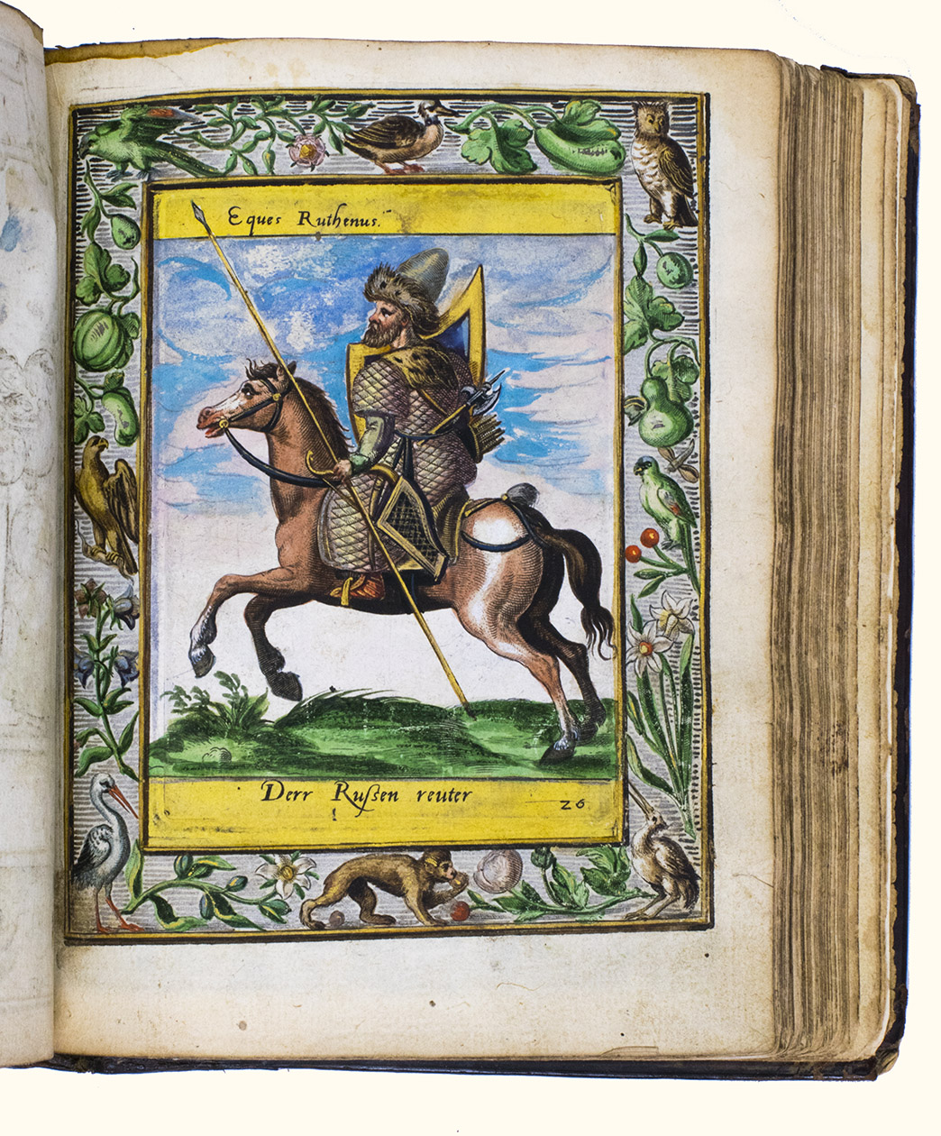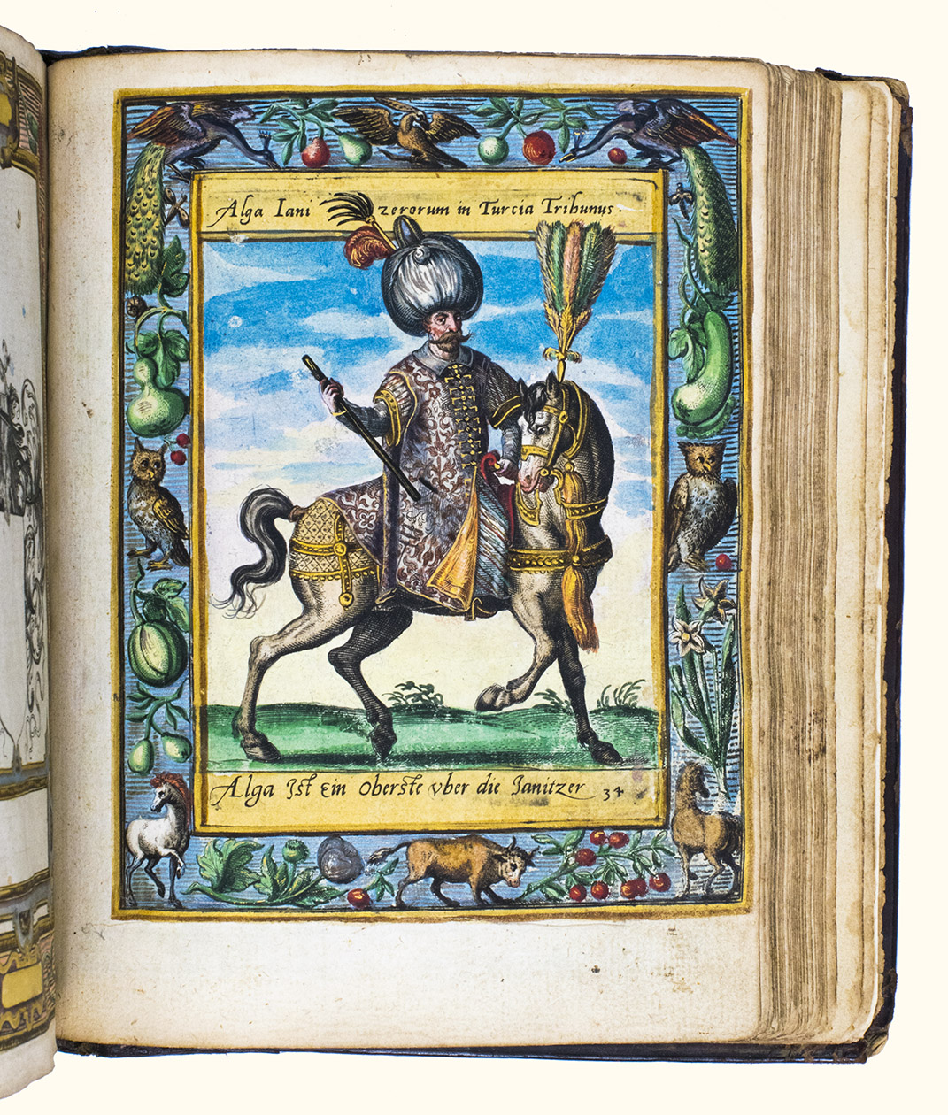 A remarkable album amicorum containing numerous late 16th- and early 17th-century inscriptions, bound in an elaborately decorated binding (dated 1590) and including more than 90 expertly hand-coloured and highlighted in gold engraved plates on equestrianism and heraldry. The engraved plates of horses (and in two cases dromedaries) and the nine pages of explanatory printed text at the beginning of the album were based on a late 16th-century work by the Flemish engraver Abraham de Bruyn (ca. 1539-1587), titled: Equitum descriptio, quomodo equestres... (ca. 1575/76). This work was published again in Cologne in 1577 with the following title Diversarum gentium armatura equestris; each engraving shows a horseman from a particular country or region, including Germany, the Low Countries, France, Ireland, Italy, Spain, Russia, Romania, Hungary, Poland, Turkey, Persia, Egypt, Arabia, and more. De Bruyn's set of engravings was altered and expanded by the Flemish artist, Caspar Ruts (1530-1607), who later moved to Germany. Ruts (or Rutz) added two different types of plates meant for drawing coats-of-arms and family crests: the first type shows a crest flanked by a woman and a man (signed in the plate "Caspar Ruts excudit") and the second shows a crest in an ornamental frame. This frame is present in several versions: one type contains fruit and insects; a second one contains parrots, squirrels and fruit; a third shows flowers, berries and butterflies.