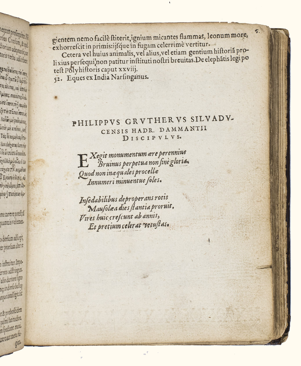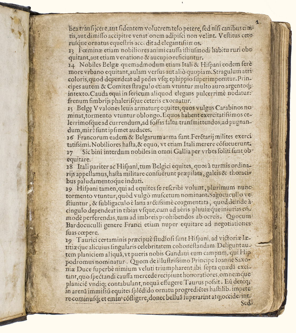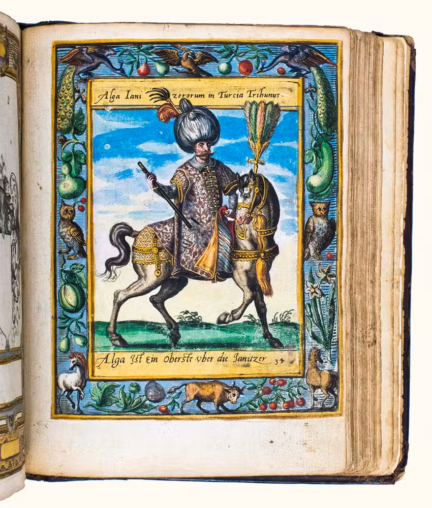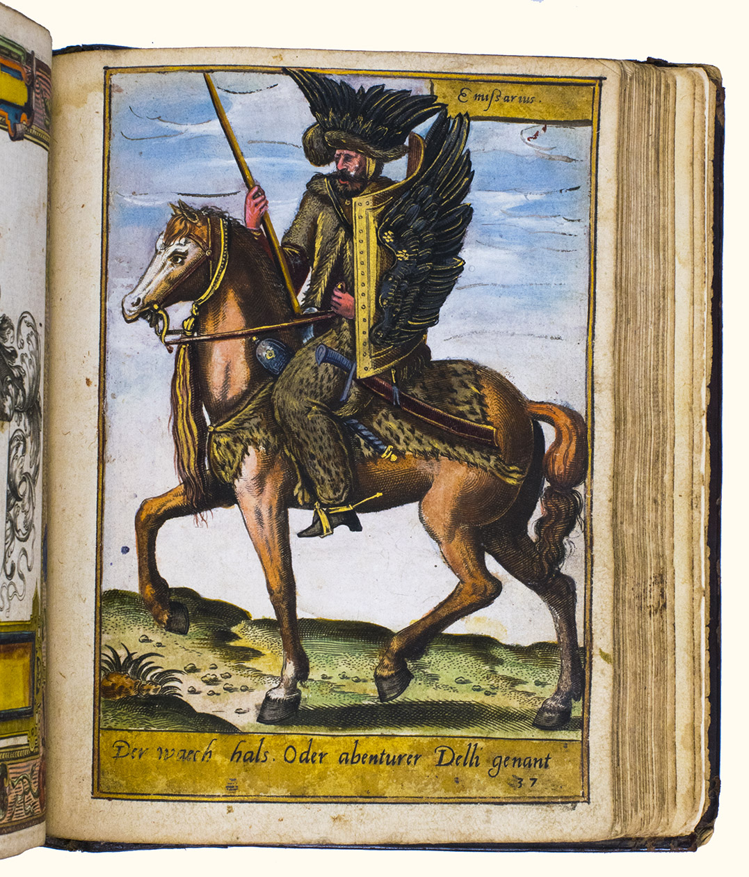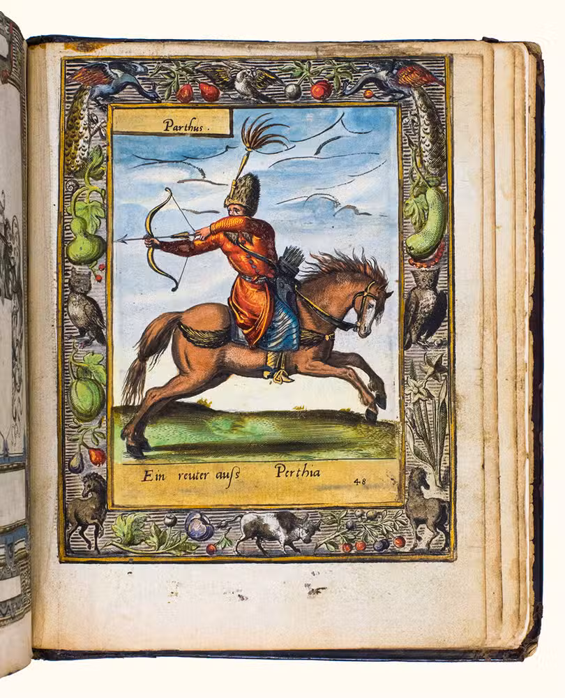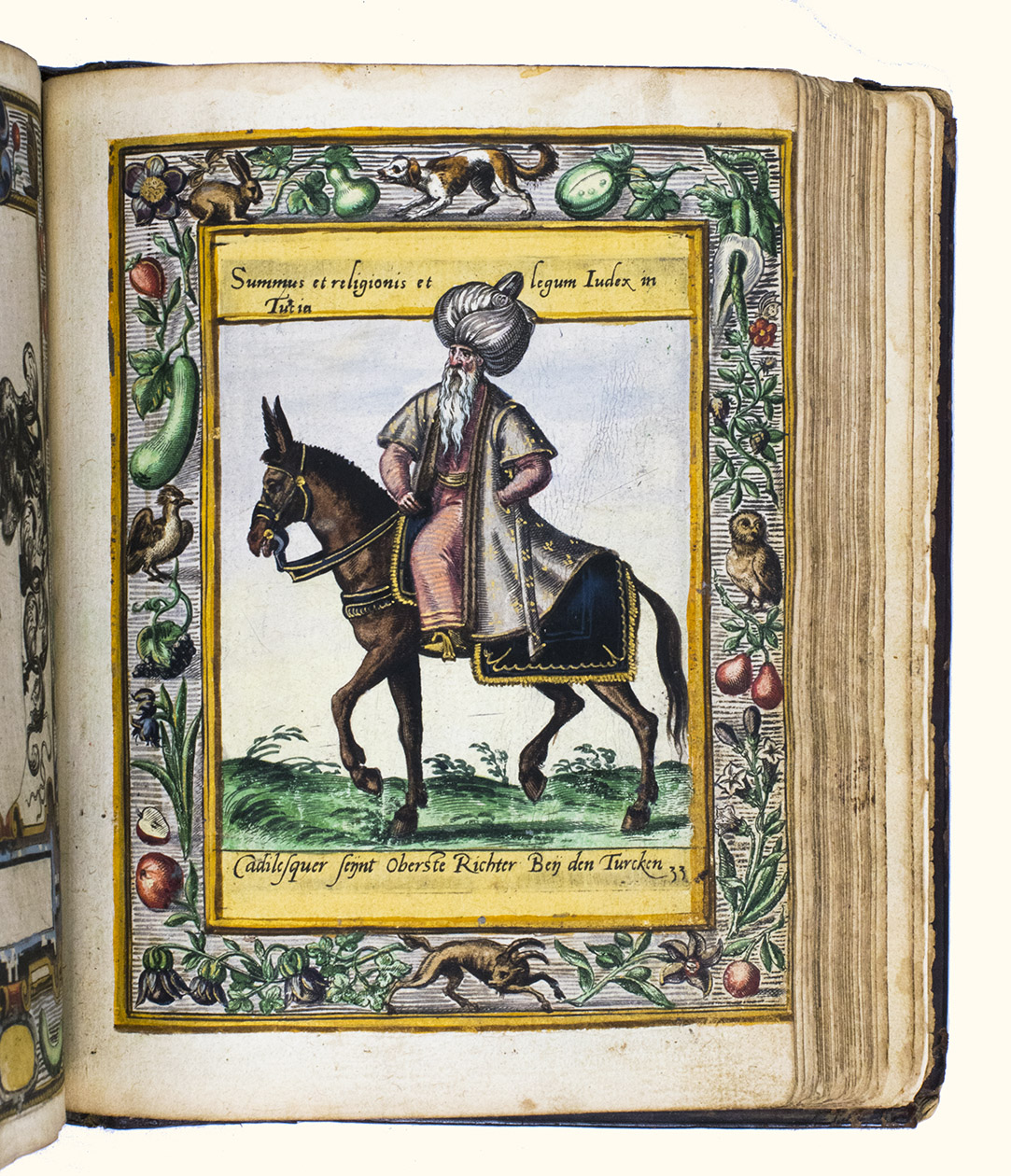 A remarkable album amicorum containing numerous late 16th- and early 17th-century inscriptions, bound in an elaborately decorated binding (dated 1590) and including more than 90 expertly hand-coloured and highlighted in gold engraved plates on equestrianism and heraldry. The engraved plates of horses (and in two cases dromedaries) and the nine pages of explanatory printed text at the beginning of the album were based on a late 16th-century work by the Flemish engraver Abraham de Bruyn (ca. 1539-1587), titled: Equitum descriptio, quomodo equestres... (ca. 1575/76). This work was published again in Cologne in 1577 with the following title Diversarum gentium armatura equestris; each engraving shows a horseman from a particular country or region, including Germany, the Low Countries, France, Ireland, Italy, Spain, Russia, Romania, Hungary, Poland, Turkey, Persia, Egypt, Arabia, and more. De Bruyn's set of engravings was altered and expanded by the Flemish artist, Caspar Ruts (1530-1607), who later moved to Germany. Ruts (or Rutz) added two different types of plates meant for drawing coats-of-arms and family crests: the first type shows a crest flanked by a woman and a man (signed in the plate "Caspar Ruts excudit") and the second shows a crest in an ornamental frame. This frame is present in several versions: one type contains fruit and insects; a second one contains parrots, squirrels and fruit; a third shows flowers, berries and butterflies.