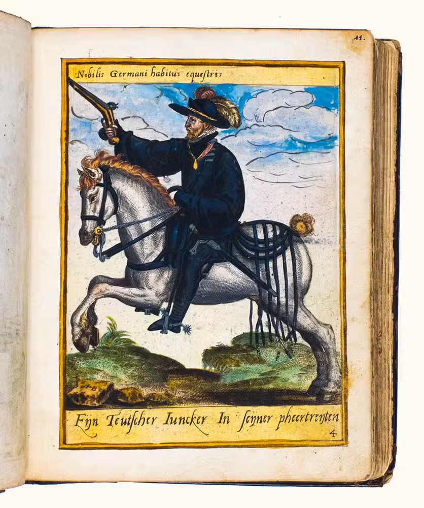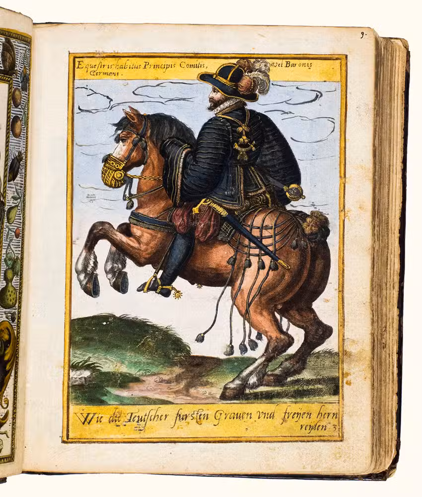 Curiously, the Bayerische Staatsbibliothek holds a very similar work (BSB Cod. icon. 320, 1575-1615), which also includes the equestrian and heraldic plates, but is described as a "studbook" or family book of Hans Lorenz von Trautskirchen and Hans Jörg von Elrichshausen, and their relations in and around Ingolstadt in Bavaria.