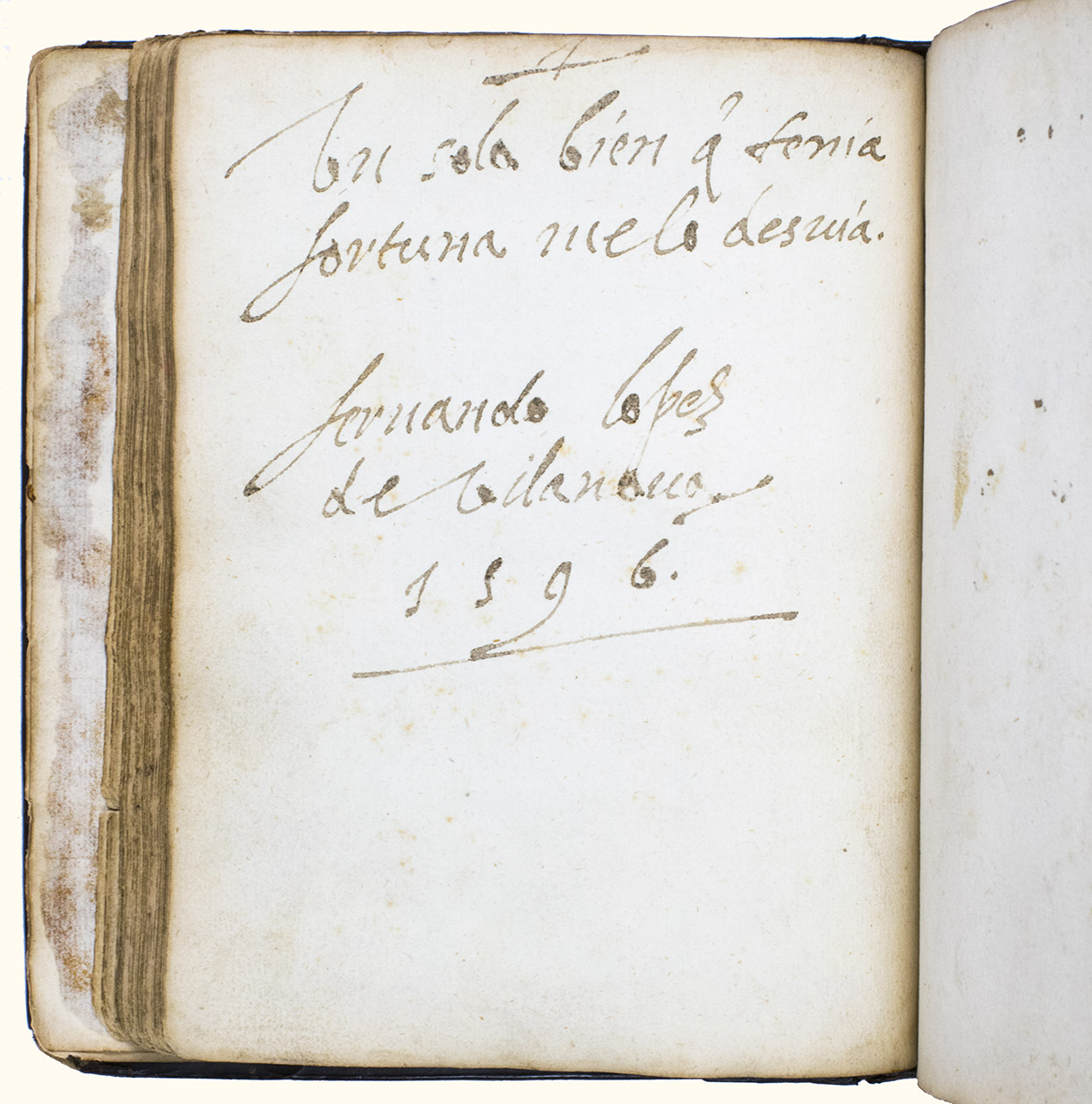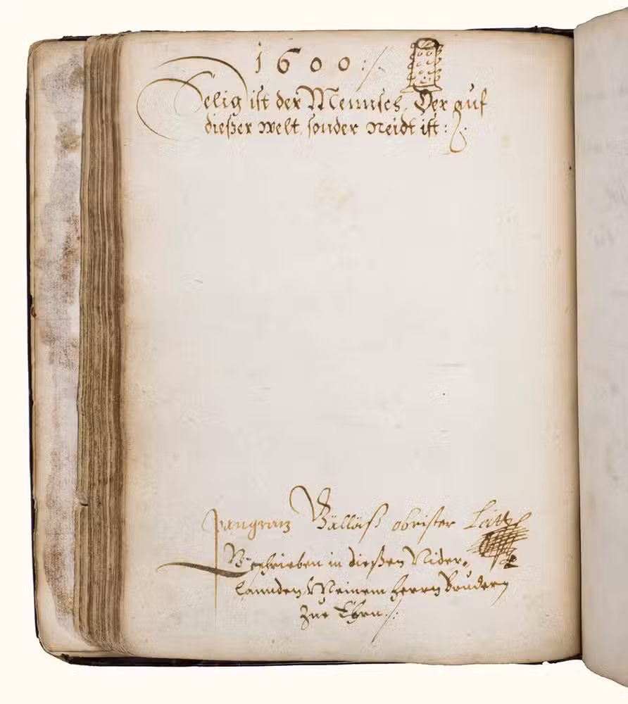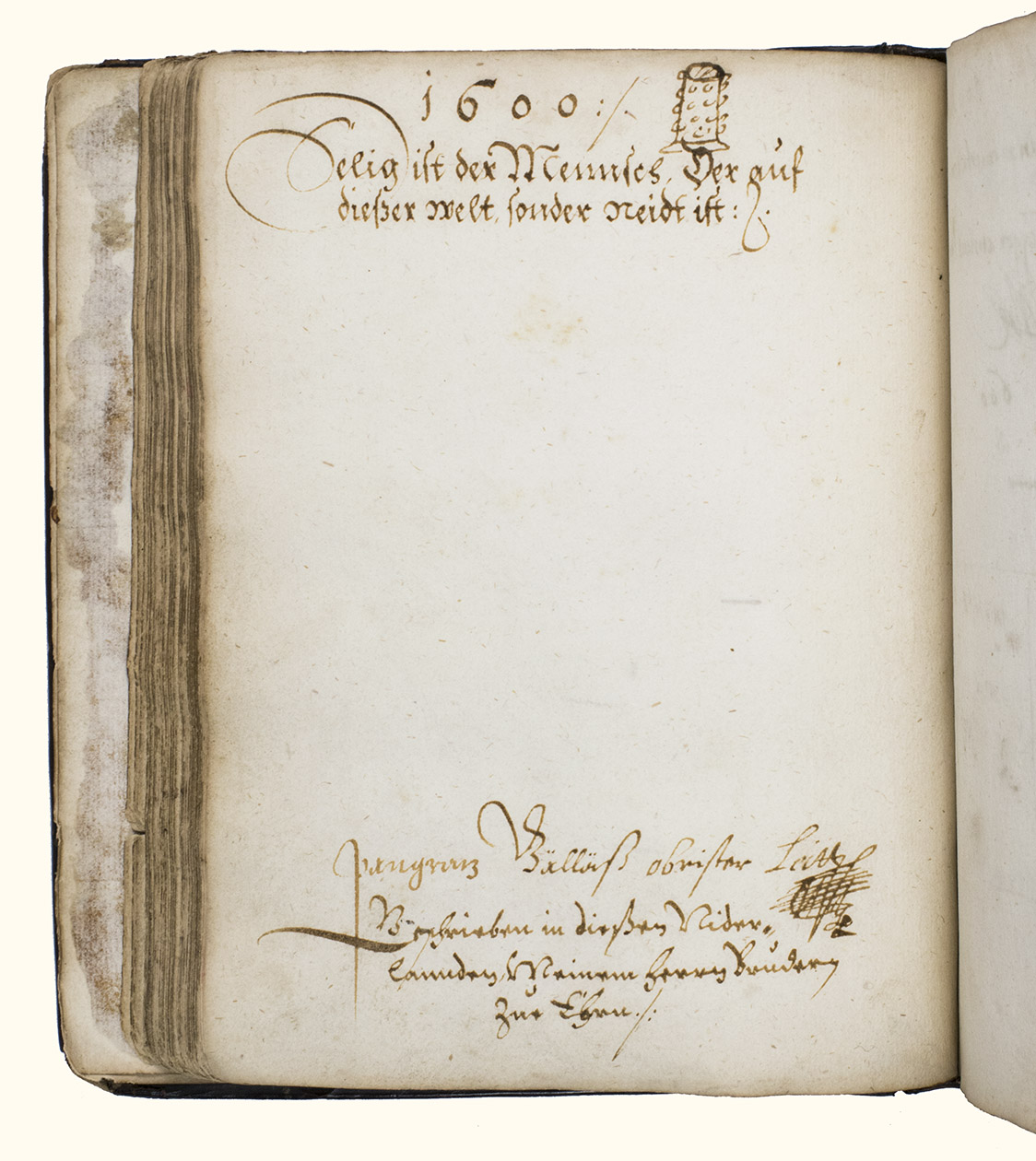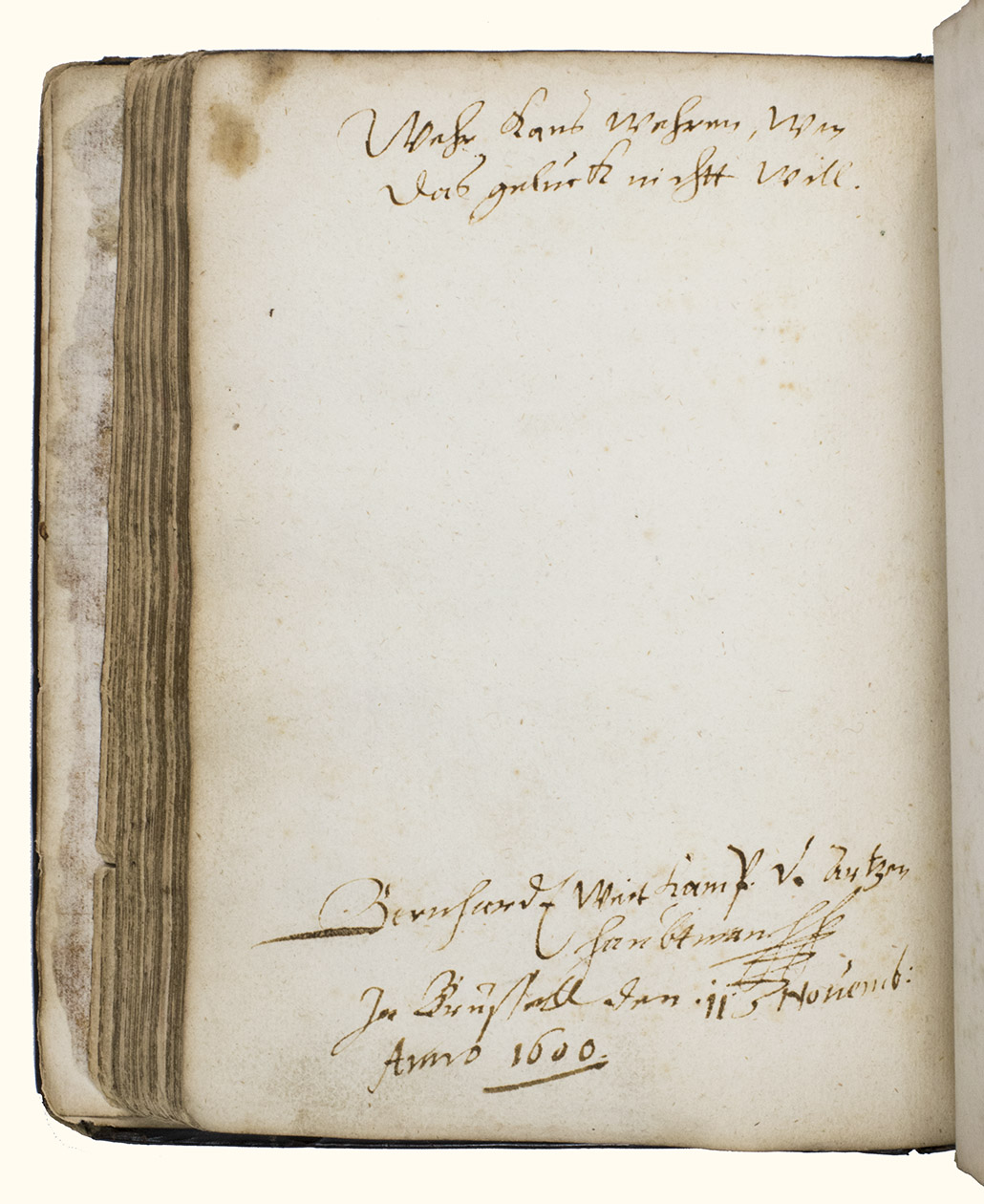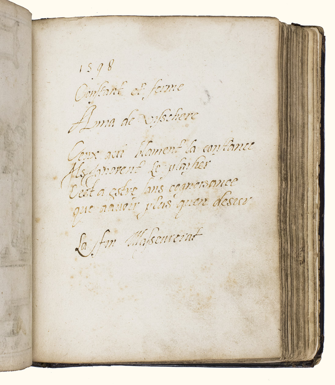 Many blank pages and several engravings are inscribed in ink. Several of these inscriptions are dated, mainly between 1585 and 1615. These inscriptions are made by, for example, Rene de Barnaige (an alderman from Kortrijk, or Courtroi), Jeane(?) Dontremont, Odile de Wilzt, Anne de Brecht, René de Chalon, Konstantin I, Freiherr Fugger, Herr zu Zinnenberg (1569-1627), Marguerite de Horion d'Ordenge and many more. Most of the contributors to the album are from Northwest Europe (the vicinity of Brussels, the Low Countries and Rhineland). Several belong to the bourgeoisie and minor nobility of the Southern Netherlands. René de Chalon (d. 1624) is a grandson of the first Prince of Orange, also named René de Chalon (1519-1544). René de Barnaige owned a fiefdom, his entry is a remembrance "tout se passe ... sans elle ne puis" of Lady Antoinette de Bourgogne (1529-1588). Odile (Marie) de Wiltz was a daughter of Johann Freiherr von und zu Wiltz (1535-1607). Little else is known about her, except that she married Charles de la Hamaïde (1580-1649) and that she was a descendent from Johann I von Nassau Dillenburg and Egbert I van Amstel, therefore, a distant relative of René de Chalon.