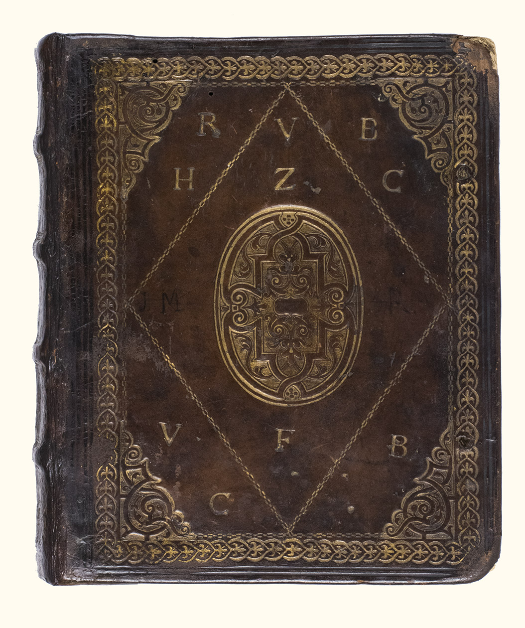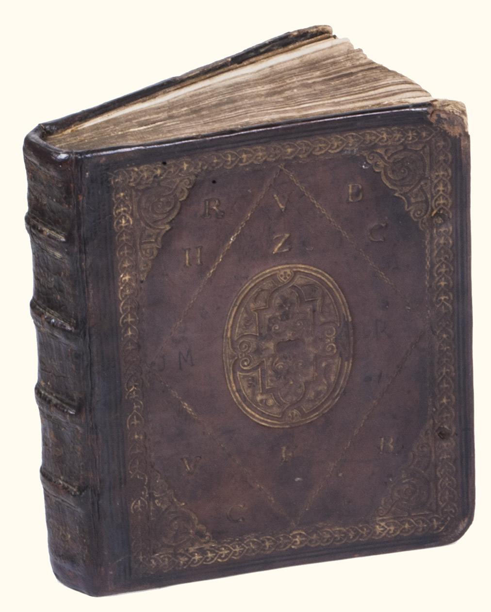 The corners of the boards are somewhat damaged, the binding shows some signs of wear and shows remnants of earlier fastenings. The flyleaves have been transformed into pastedowns, partially covering earlier owner's inscriptions, the flyleaves and pastedowns show some brown glue stains. Slightly browned and foxed throughout, but overall in good condition. A beautiful hand-coloured and highlighted in gold album amicorum with many late 16th- and early 17th-century inscriptions. For De Bruyn: Hollstein IV, p. 7; the BSB copy: urn:nbn:de:bvb:12-bsb00007211-1 (WorldCat 162418399).