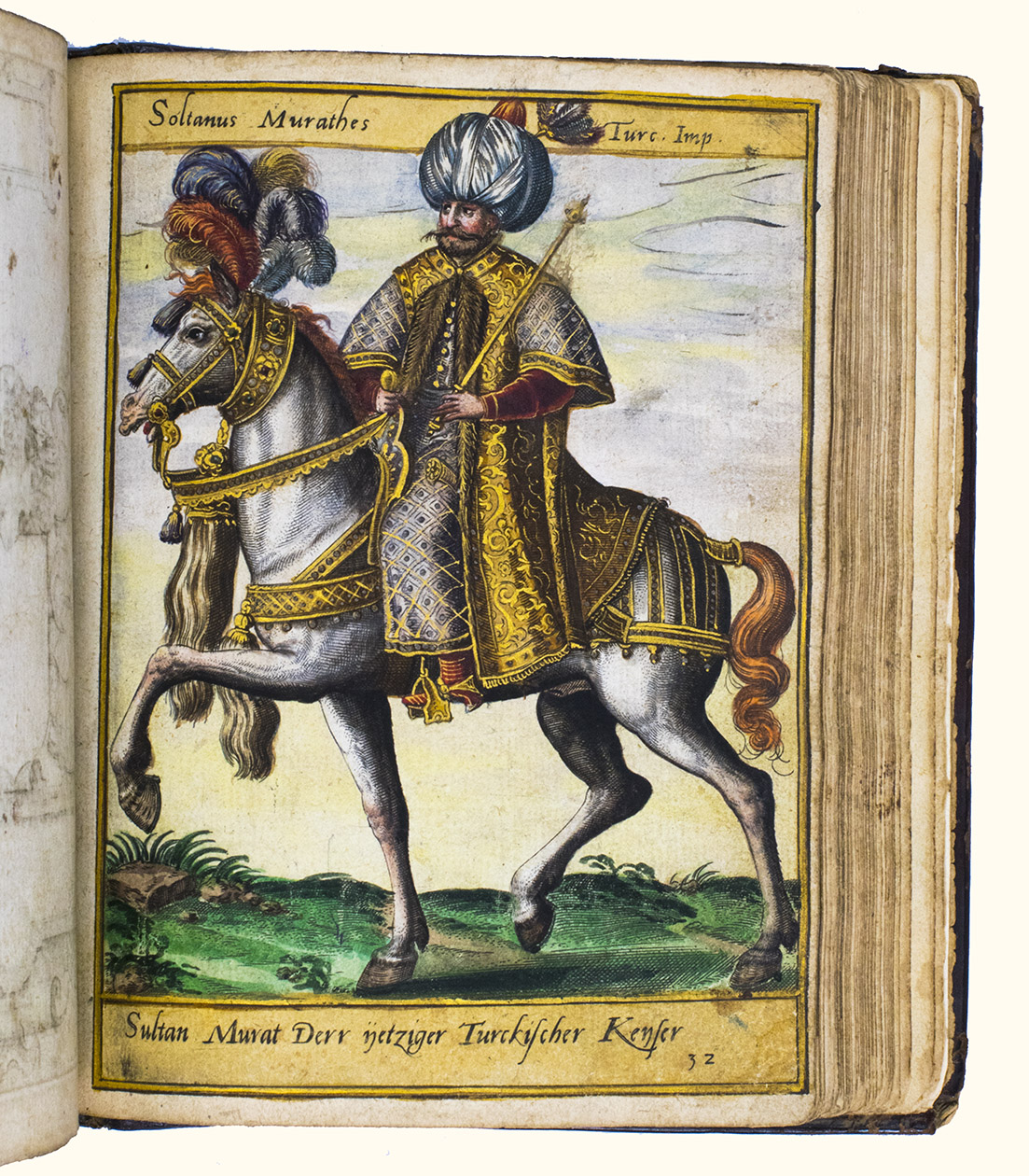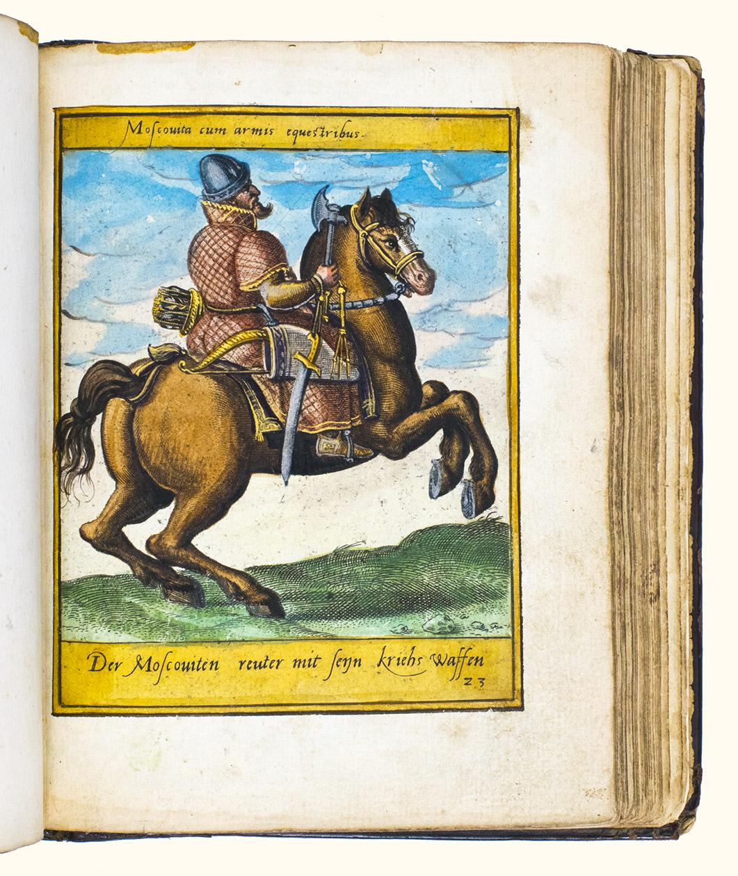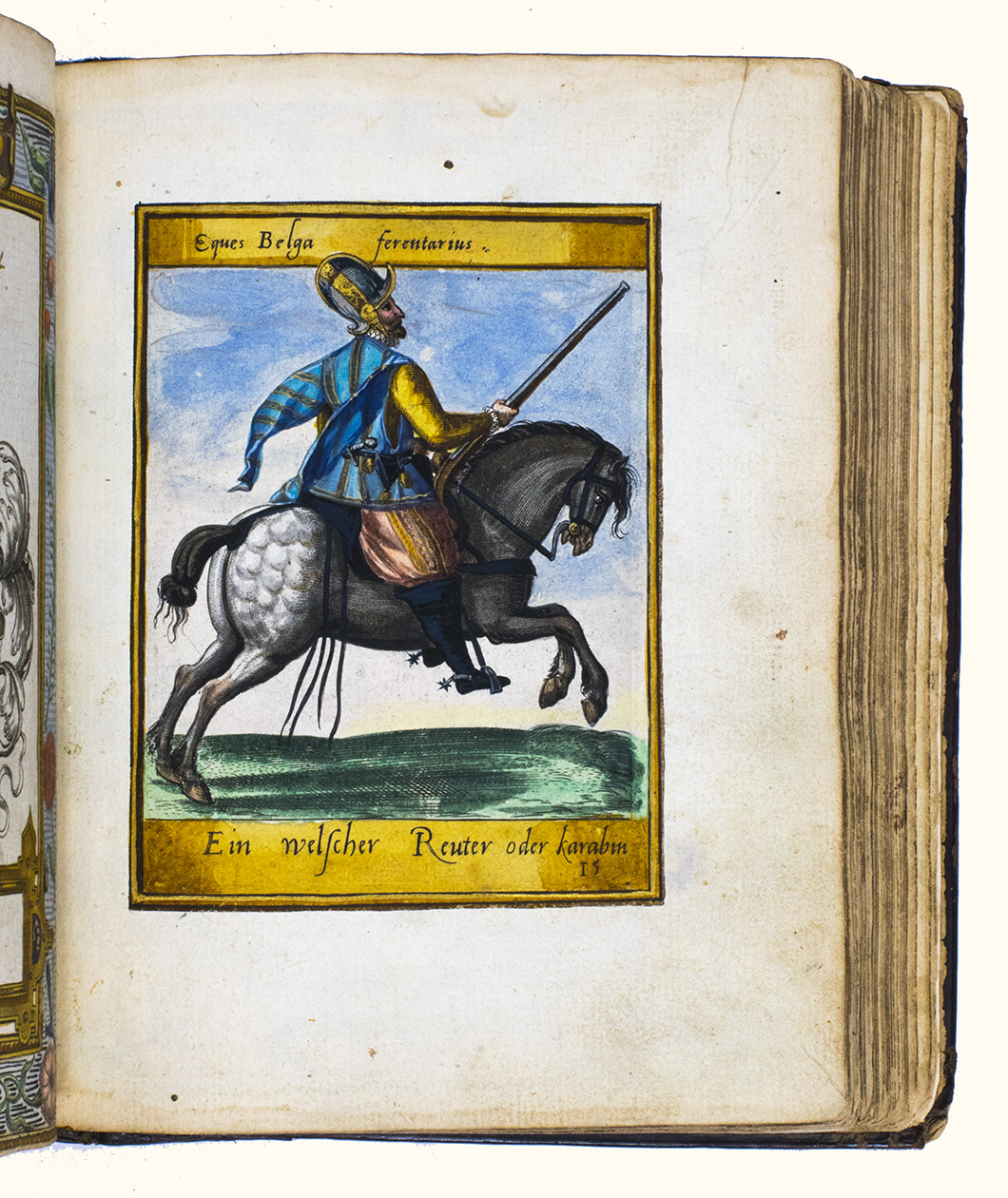 [North-western Europe (specifically the vicinity of Brussels?)], [1585-1615]. 4to. With 45 hand-coloured and highlighted in gold engraved plates of horses and their riders from Europe, North Africa, and the Near and Middle East, numbered 1-50 (skipping nos. 2, 21, 27, 35, and 36), 46 hand-coloured and highlighted in gold engraved heraldic plates (sometimes filled in with manuscript notes), 2 hand-coloured manuscript coats of arms on l. 15v, and 1 black and gold hand-coloured manuscript coat of arms on the back paste-down. Contemporary elaborately gold- and blind-tooled mottled calf, with gold lettering on both boards (front: RVB HZC VFB C.) (back: 1590). 164 ll.