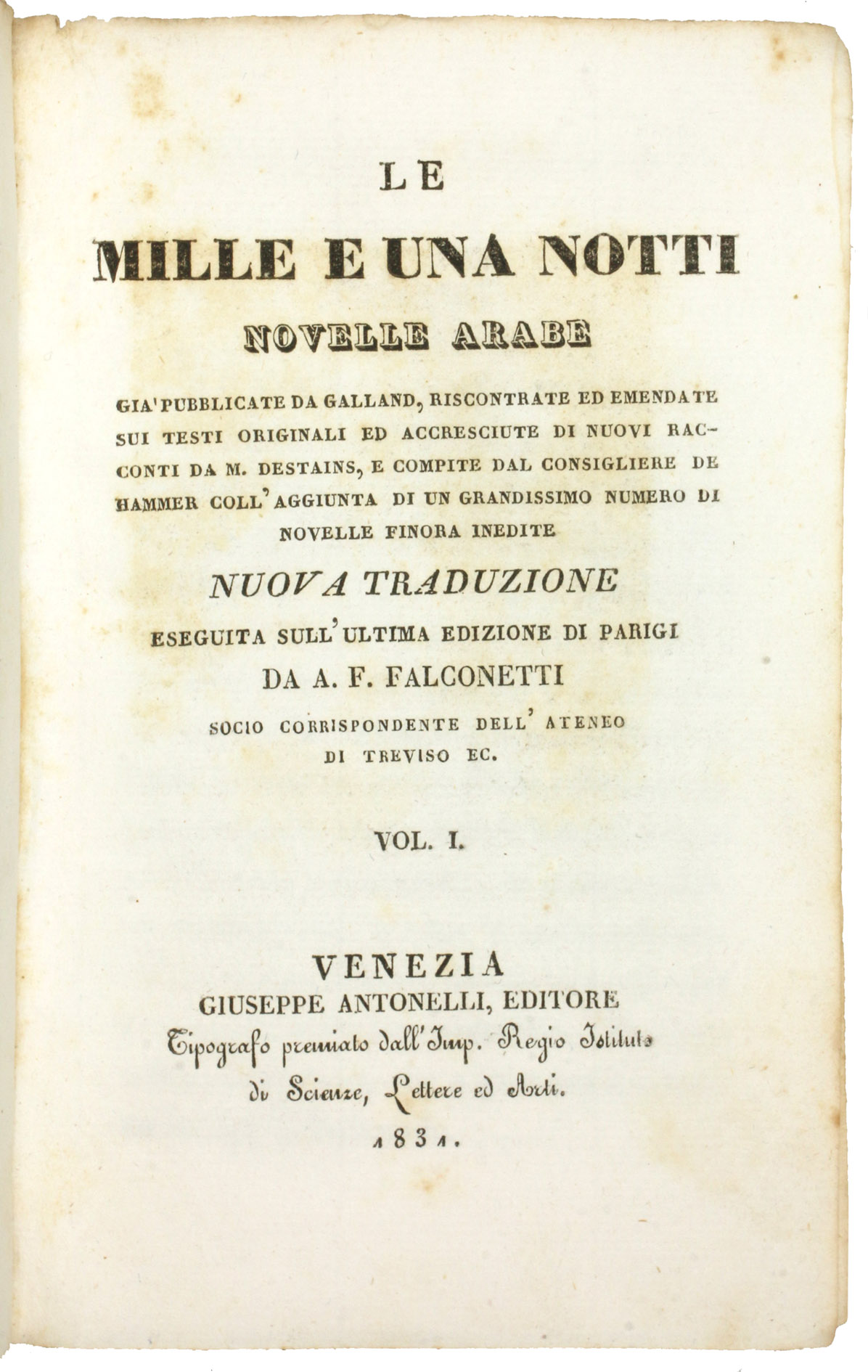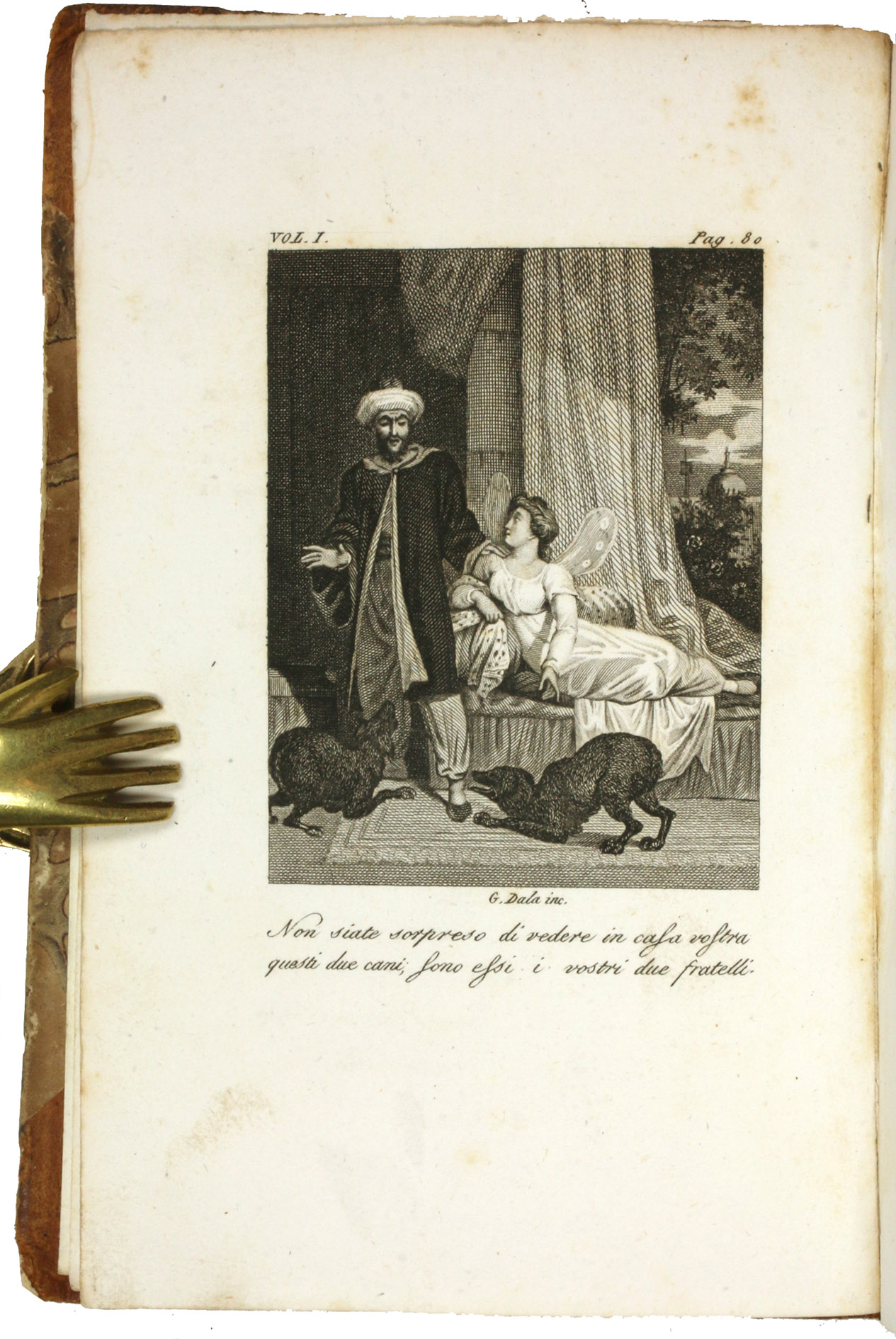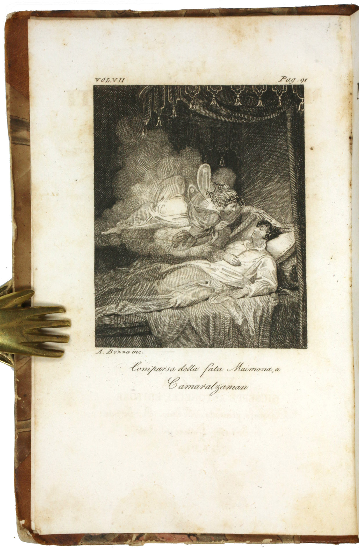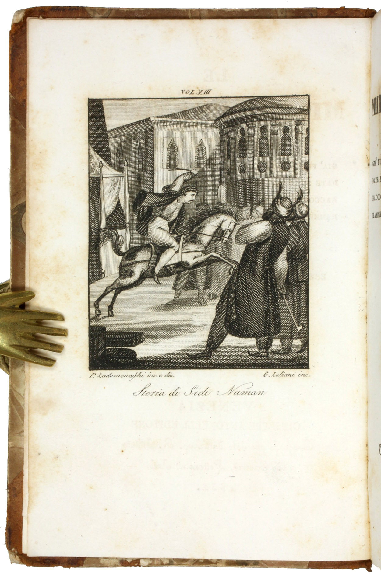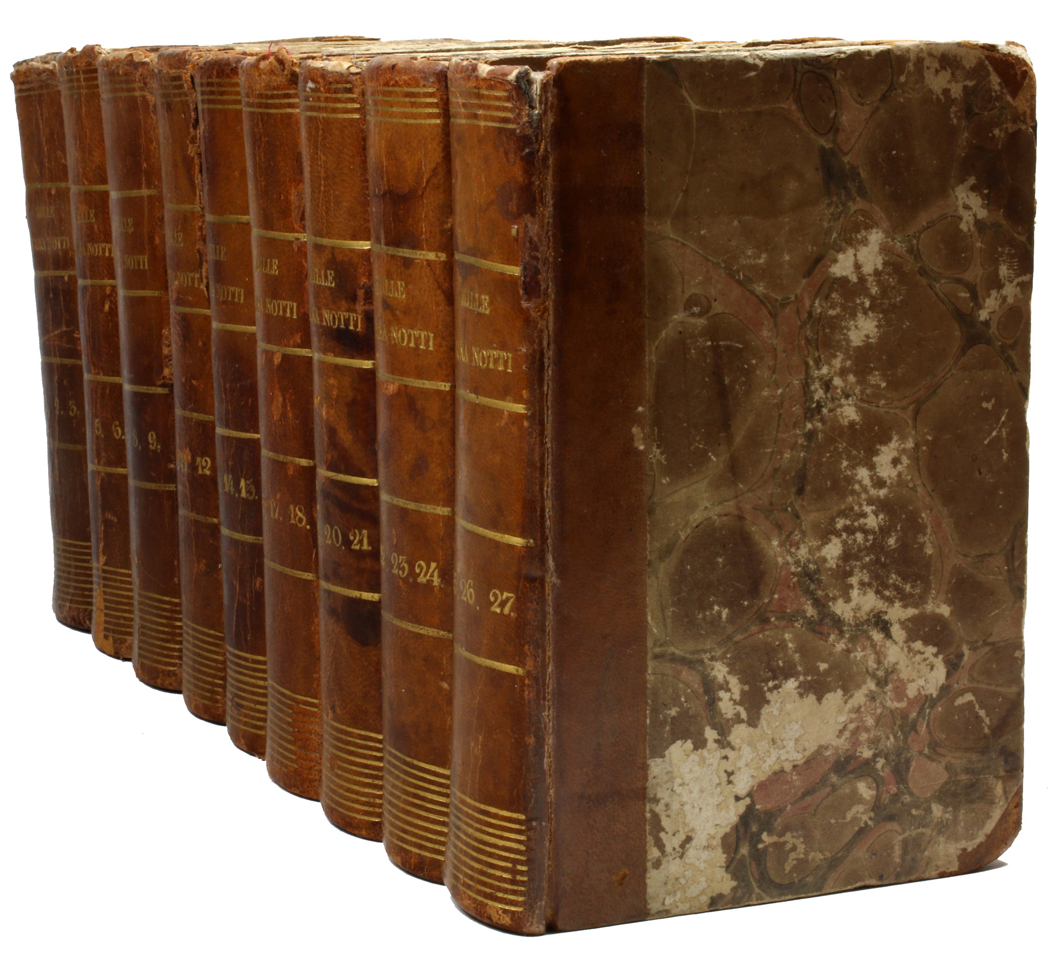Rare first illustrated Italian edition of the Arabian Nights, the first new translation after Coletis. This is one of the finest Italian editions of the Nights, both for its impressive set of plates and for its translation. The editor and translator Antonio Francesco Falconetti had worked on a greatly expanded French corpus that is considered one of the most complete versions of the work: "The translation, entirely new, is based on the latest Paris edition, found, for the part already made public by Galland, on original texts, amended and enlarged with new stories by M. Destains, and then completed with the addition of a very large number of previously unpublished novellas discovered by M. Hammer, which form a good third of the entire series" (editors preface, vol. I, p. XI).