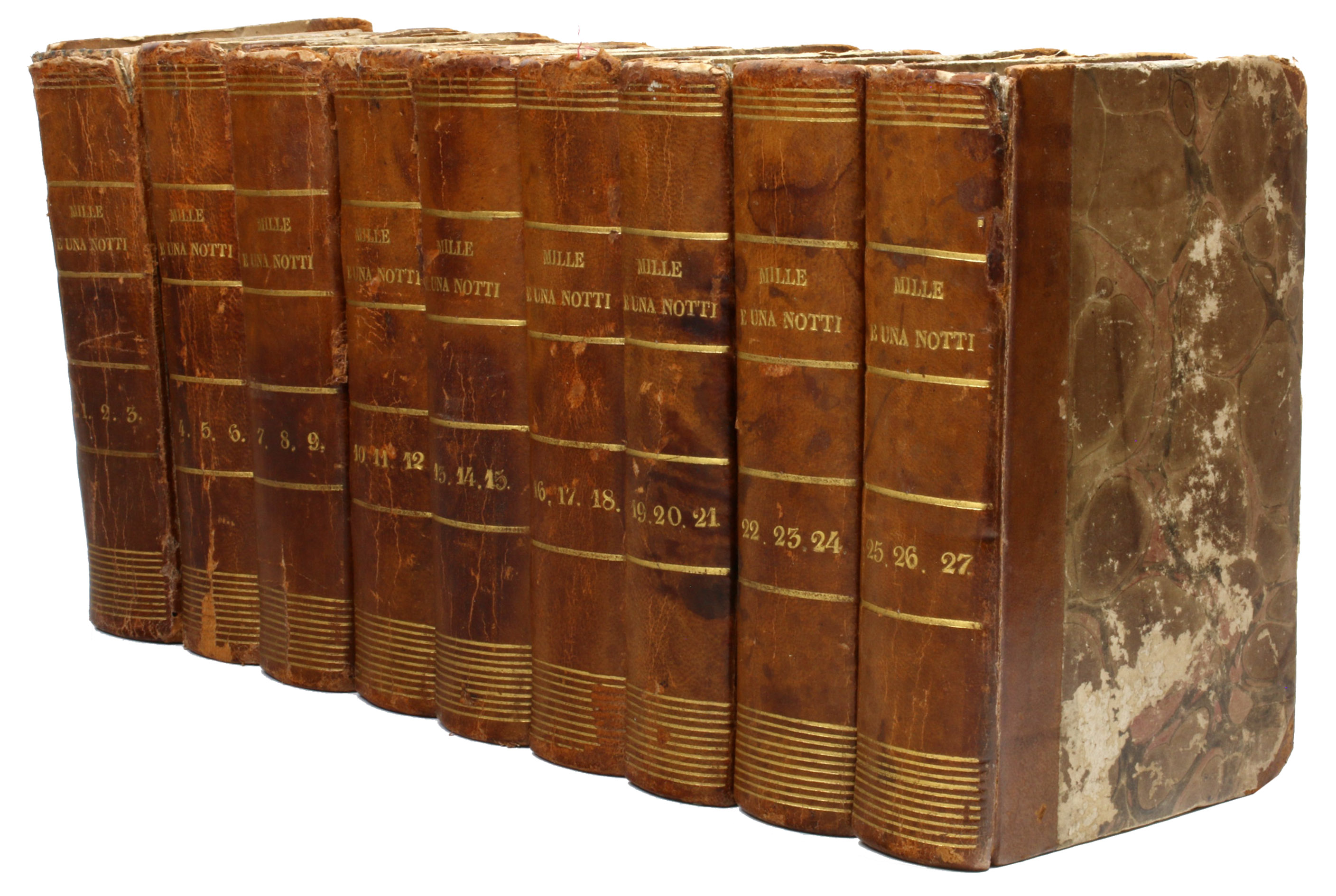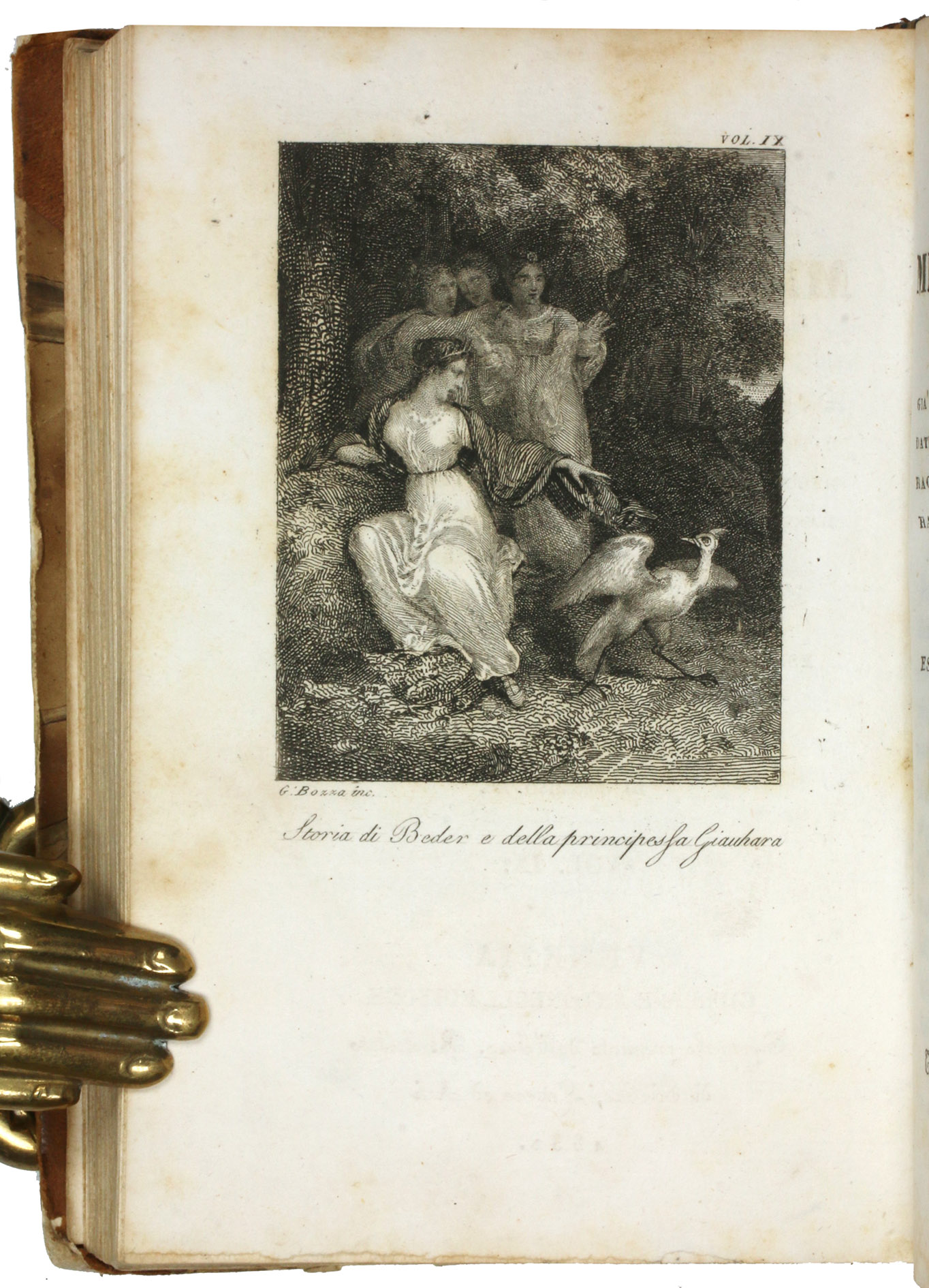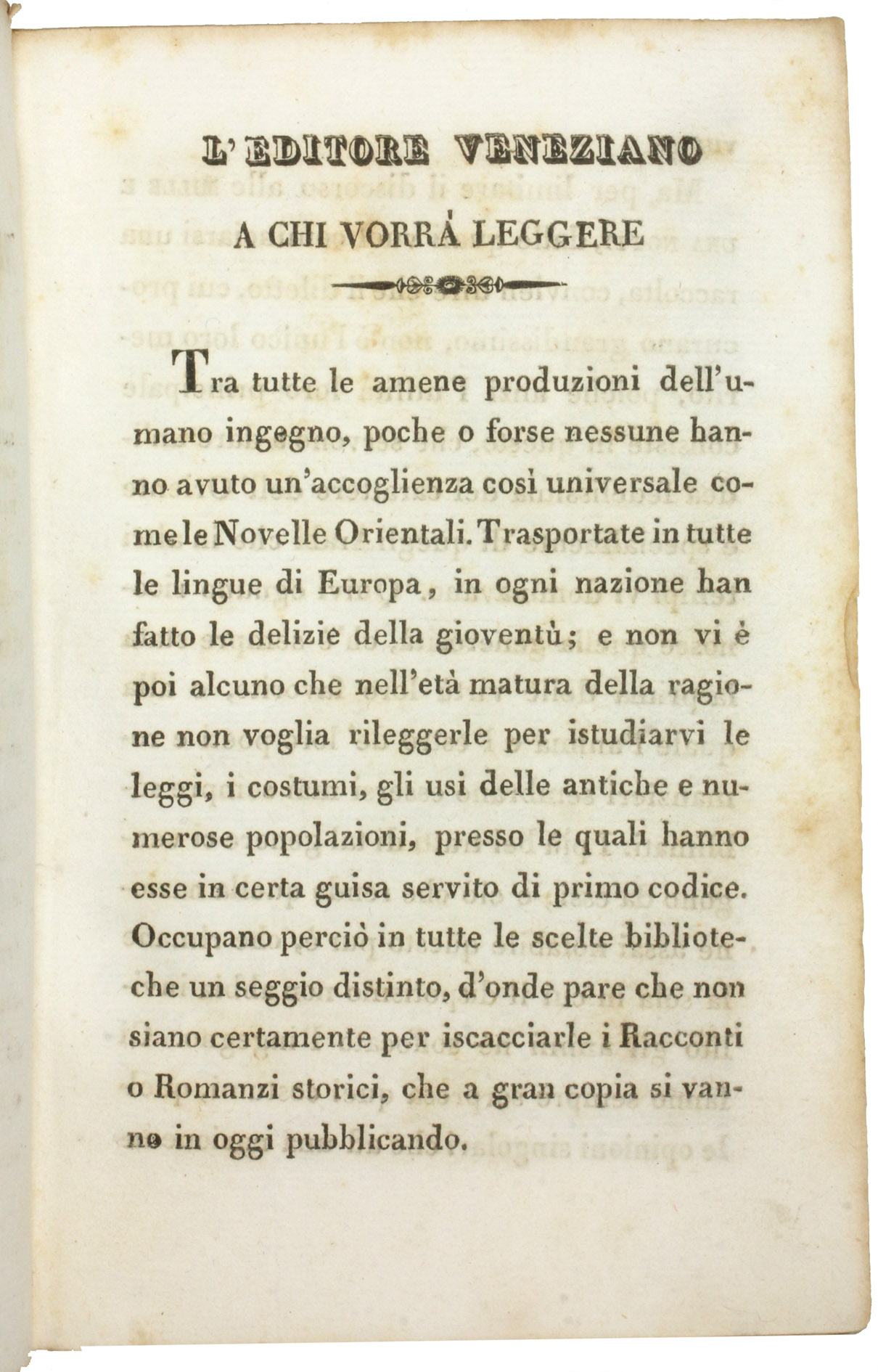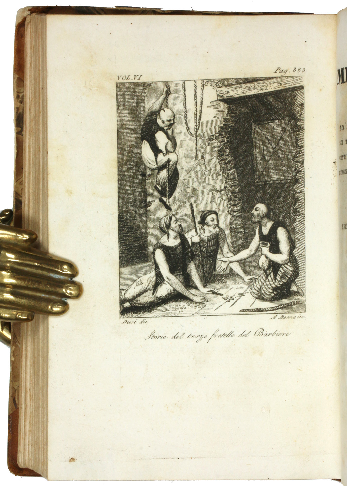 Rare first illustrated Italian edition of the Arabian Nights, the first new translation after Coletis. This is one of the finest Italian editions of the Nights, both for its impressive set of plates and for its translation. The editor and translator Antonio Francesco Falconetti had worked on a greatly expanded French corpus that is considered one of the most complete versions of the work: "The translation, entirely new, is based on the latest Paris edition, found, for the part already made public by Galland, on original texts, amended and enlarged with new stories by M. Destains, and then completed with the addition of a very large number of previously unpublished novellas discovered by M. Hammer, which form a good third of the entire series" (editors preface, vol. I, p. XI).