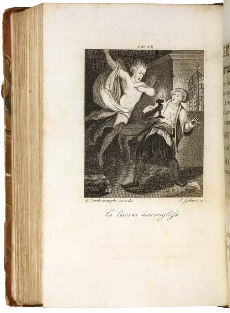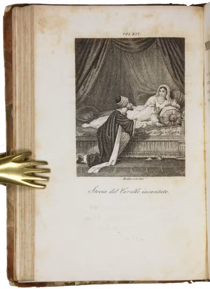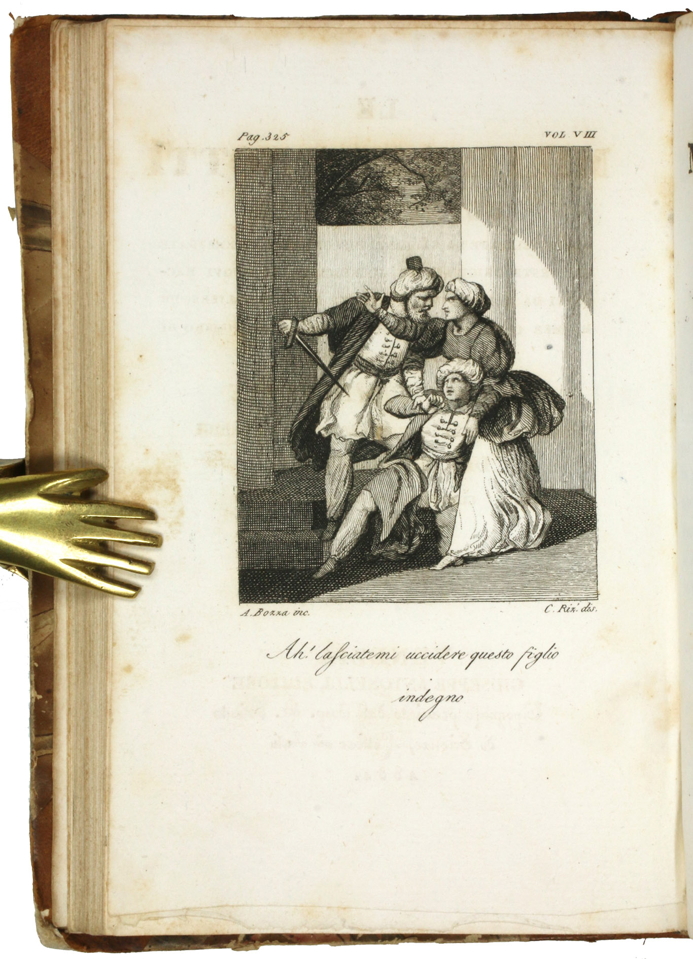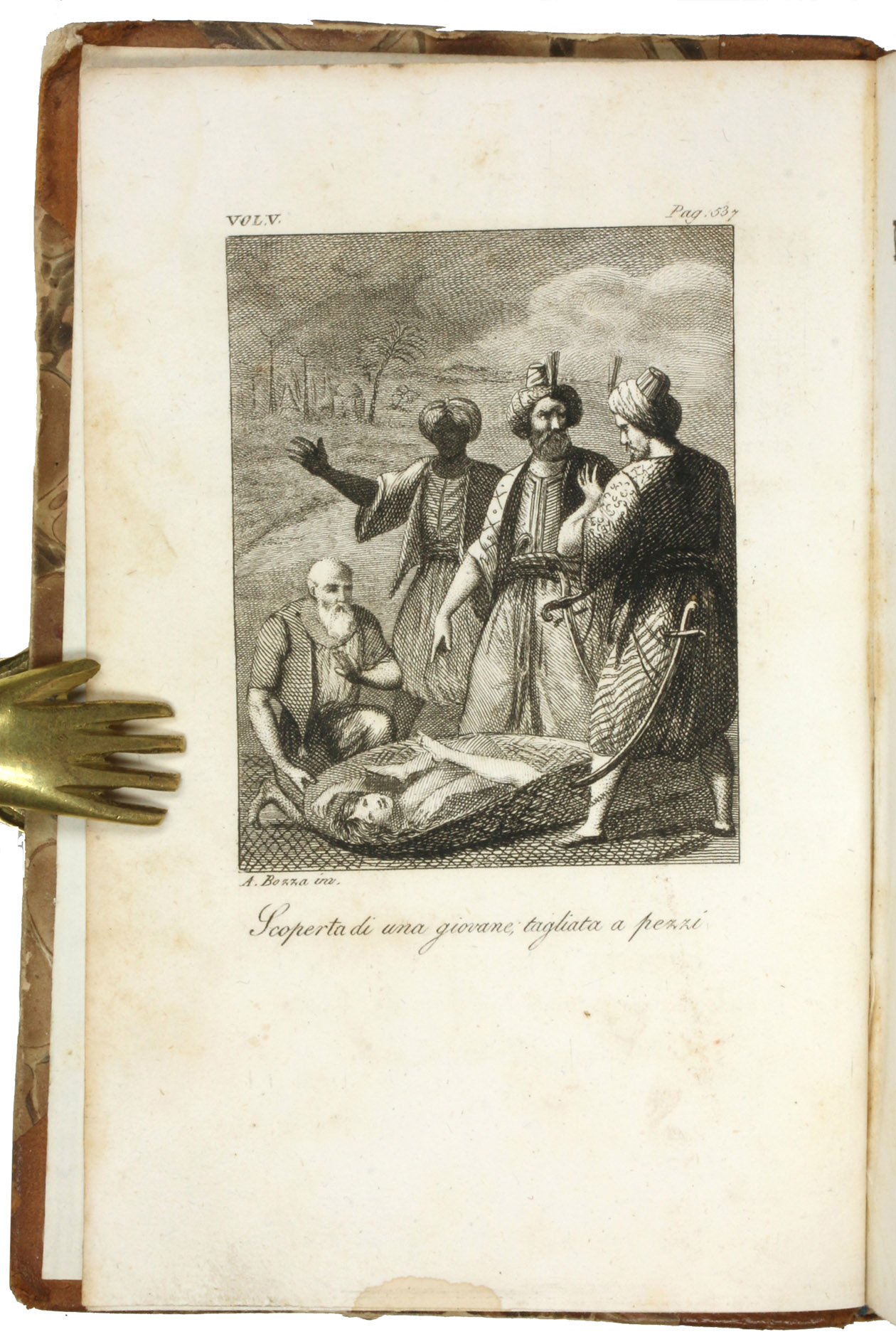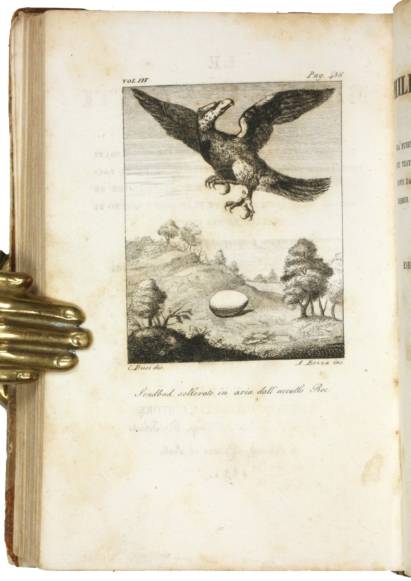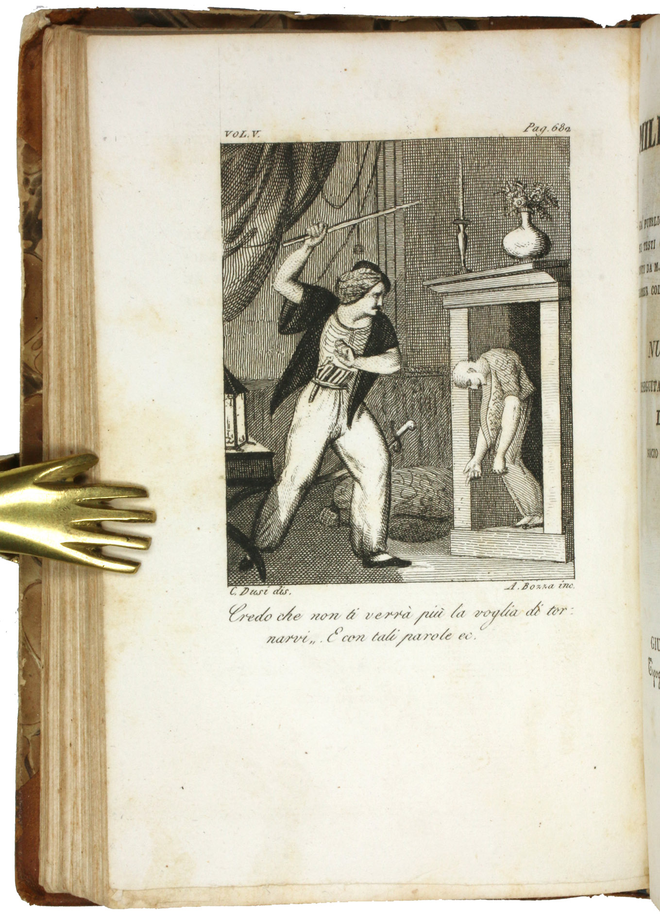 Rare first illustrated Italian edition of the Arabian Nights, the first new translation after Coletis. This is one of the finest Italian editions of the Nights, both for its impressive set of plates and for its translation. The editor and translator Antonio Francesco Falconetti had worked on a greatly expanded French corpus that is considered one of the most complete versions of the work: "The translation, entirely new, is based on the latest Paris edition, found, for the part already made public by Galland, on original texts, amended and enlarged with new stories by M. Destains, and then completed with the addition of a very large number of previously unpublished novellas discovered by M. Hammer, which form a good third of the entire series" (editors preface, vol. I, p. XI).