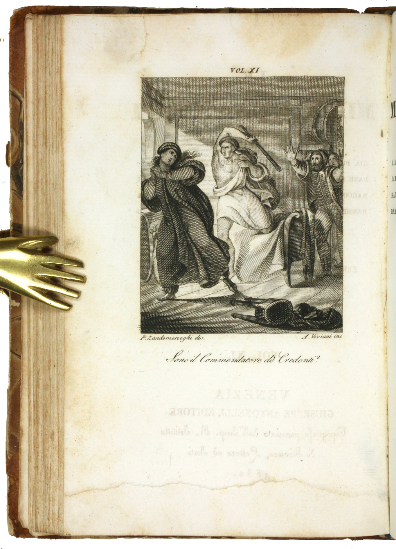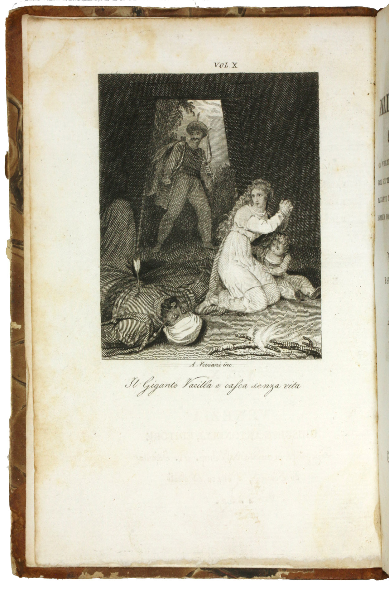 Venice, Giuseppe Antonelli, 1831-1832. 27 parts in 9 volumes. 12mo. With 26 (of 27) engraved plates, drawn by Pietro Zandomeneghi and engraved by Giorgio Buttazzon. Contemporary half calf with the title and volume numbers in gold on the spine. Vols. I-VI: 1035 pp.; vols. VII-XII: 1060 pp.; vols. XIII-XV: 560 pp.; vols. XVI-XVIII: 574 pp.; vols. XIX-XXIV: 1046 pp.; vols. XXV-XXVII: 521 pp.