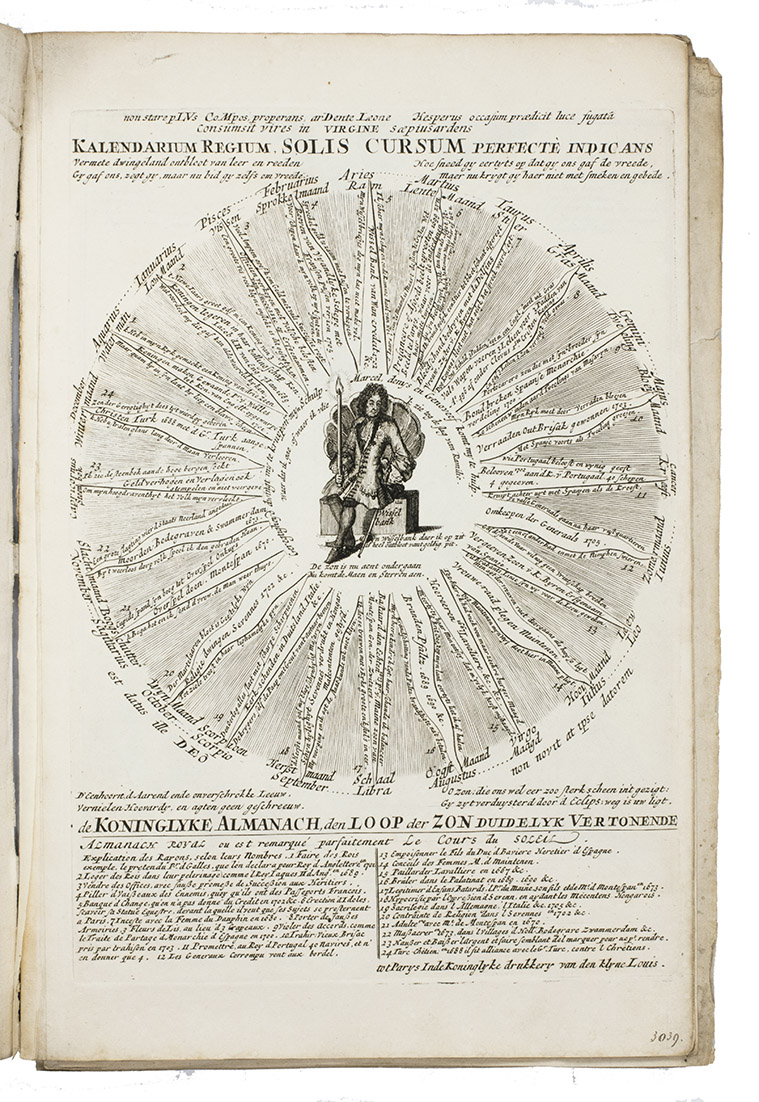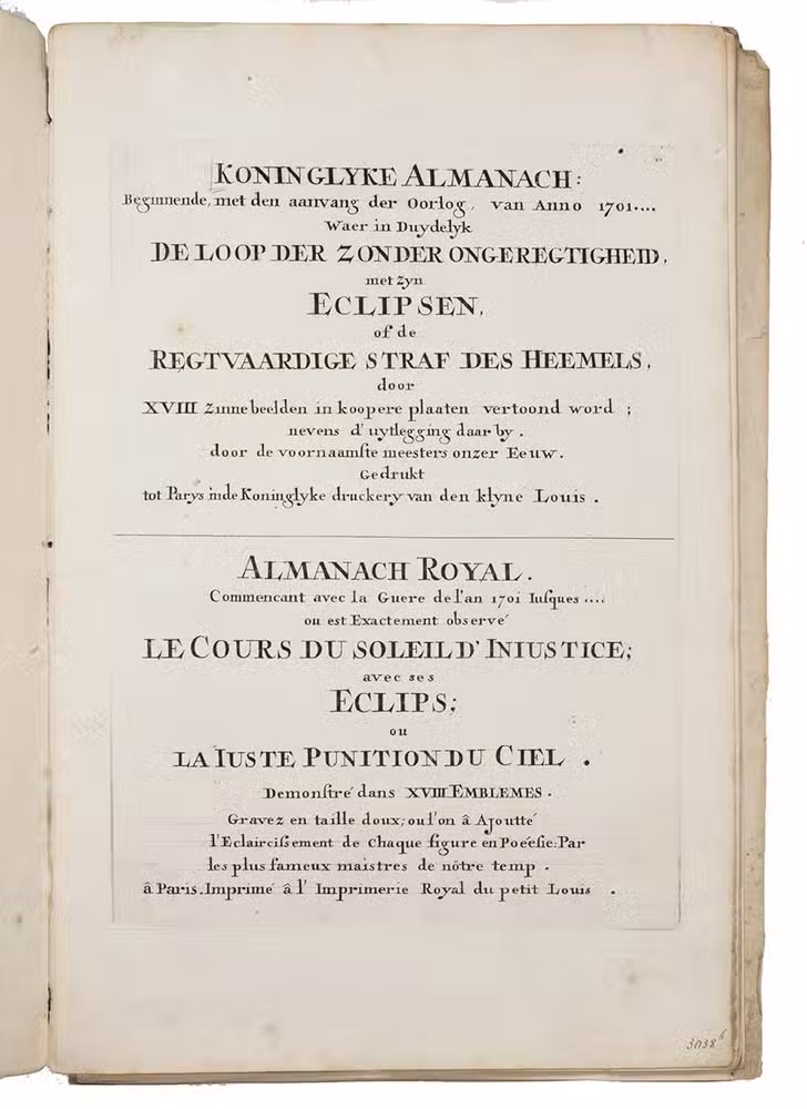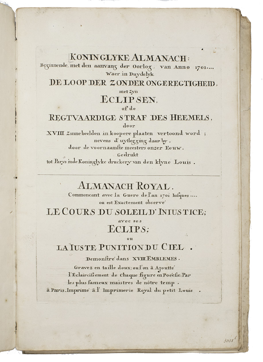 Koninglyke almanach: beginnende met den aanvang der oorlog, van anno 1701 .... Waer in duydelijk de loop der zon der ongeregtigheid, met zyn eclipsen, of de regtvaardige straf des heemels, door XVIII zinnbeelden in koopere plaaten vertoond word; ... | Almanach royal. Commencant[!] avec la guere de l'an 1701 jusques .... ou est exactement observé le cours du soleil d'injustice; avec ses eclips; ou la juste punition du ciel. Demonstré dans XVIII emblemes. ...