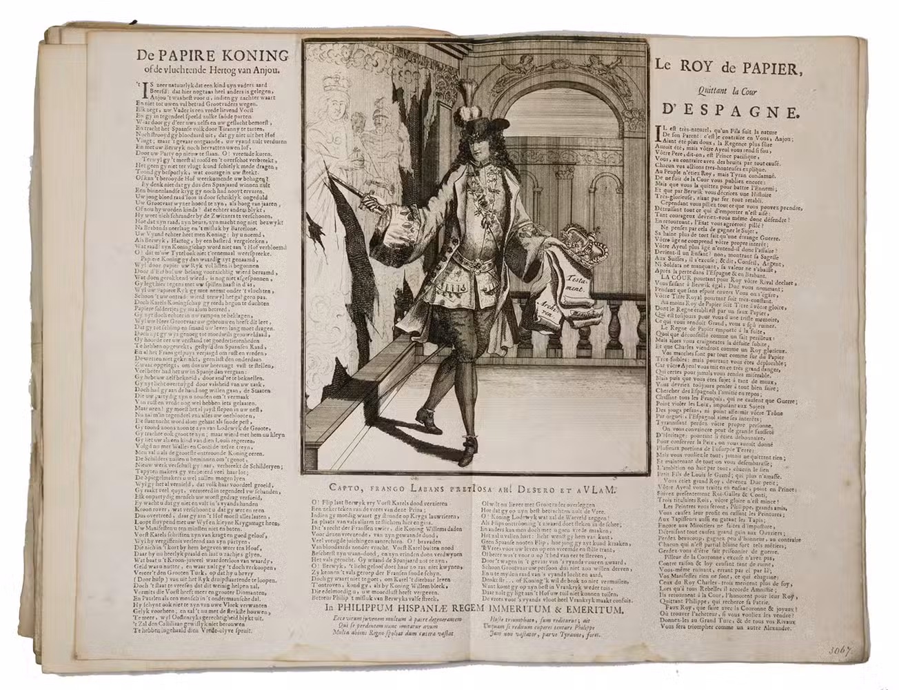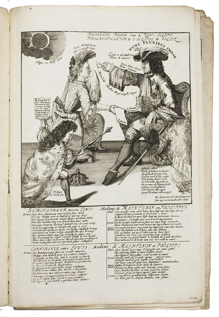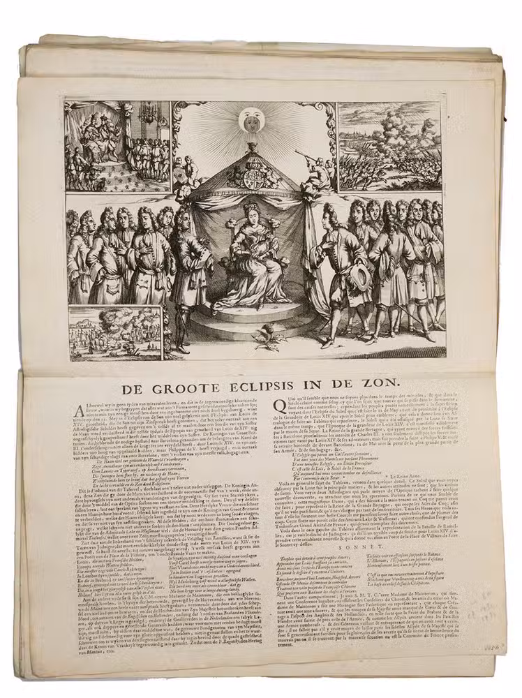 Extremely rare complete emblematic print series (plus alternative versions of several prints) mercilessly satirizing and ridiculing King Louis XIV of France, his grandson King Philip V of Spain, the Marquise de Maintenon (whom Louis XIV had secretly married after she had been his mistress for years), many others in Louis XIV's court and his allies in the War of the Spanish Succession (1700/01-1714). Most prints, like the title-page, have texts in both Dutch and French. The title and many of the prints gleefully note the total eclipse of the sun that occurred on 12 May 1706, supposedly the day Philip V abandoned his siege of Barcelona (which had been taken by the British six months earlier), presenting it as the total eclipse of the Sun King.