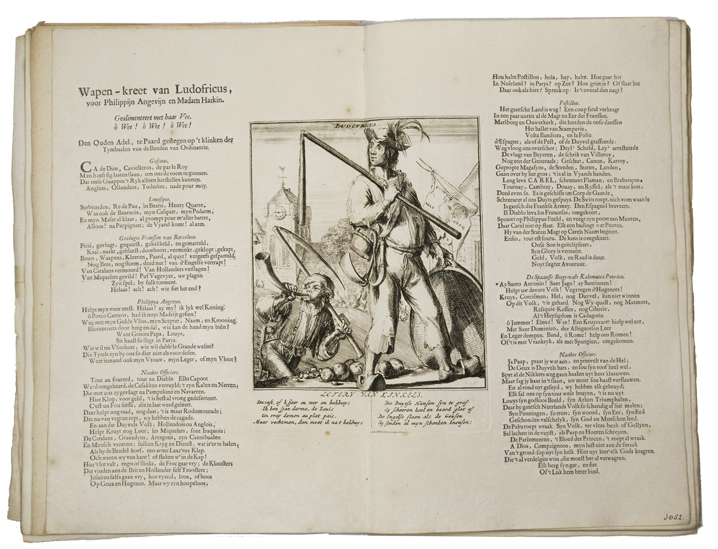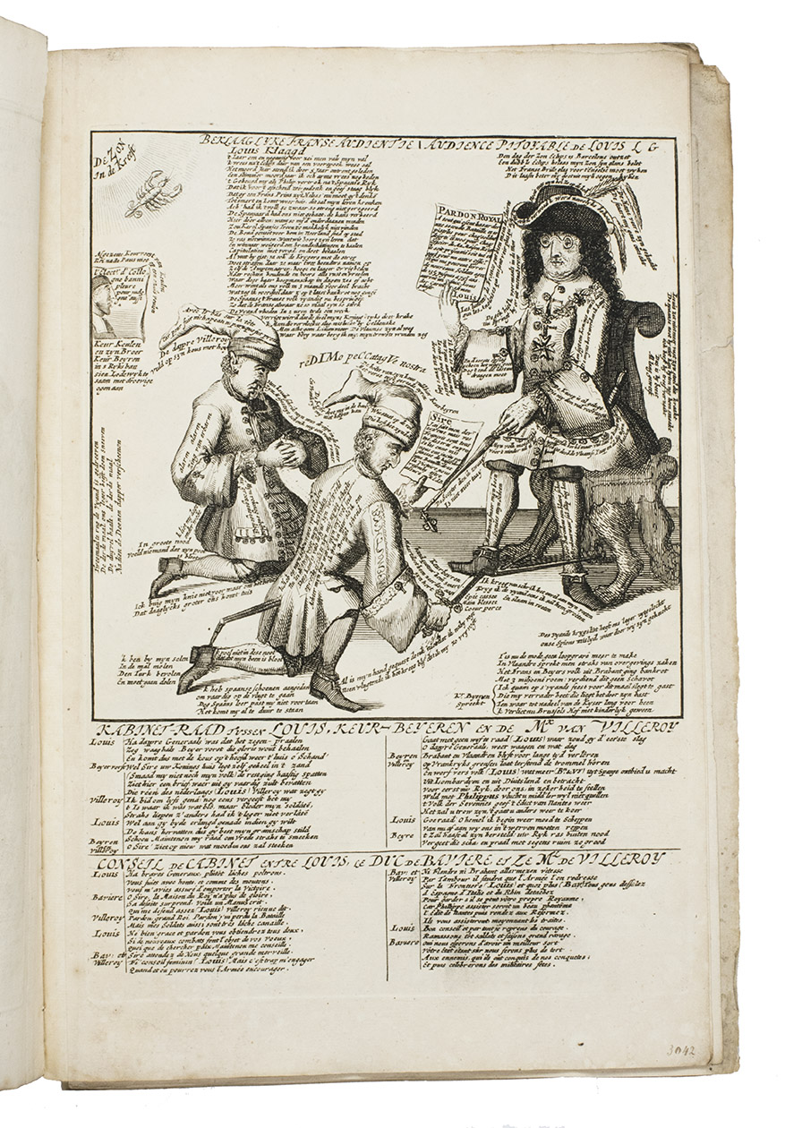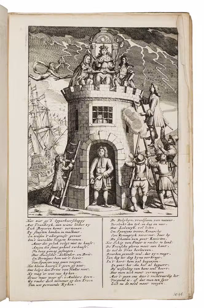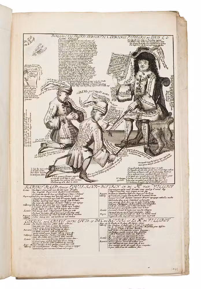 Extremely rare complete emblematic print series (plus alternative versions of several prints) mercilessly satirizing and ridiculing King Louis XIV of France, his grandson King Philip V of Spain, the Marquise de Maintenon (whom Louis XIV had secretly married after she had been his mistress for years), many others in Louis XIV's court and his allies in the War of the Spanish Succession (1700/01-1714). Most prints, like the title-page, have texts in both Dutch and French. The title and many of the prints gleefully note the total eclipse of the sun that occurred on 12 May 1706, supposedly the day Philip V abandoned his siege of Barcelona (which had been taken by the British six months earlier), presenting it as the total eclipse of the Sun King.