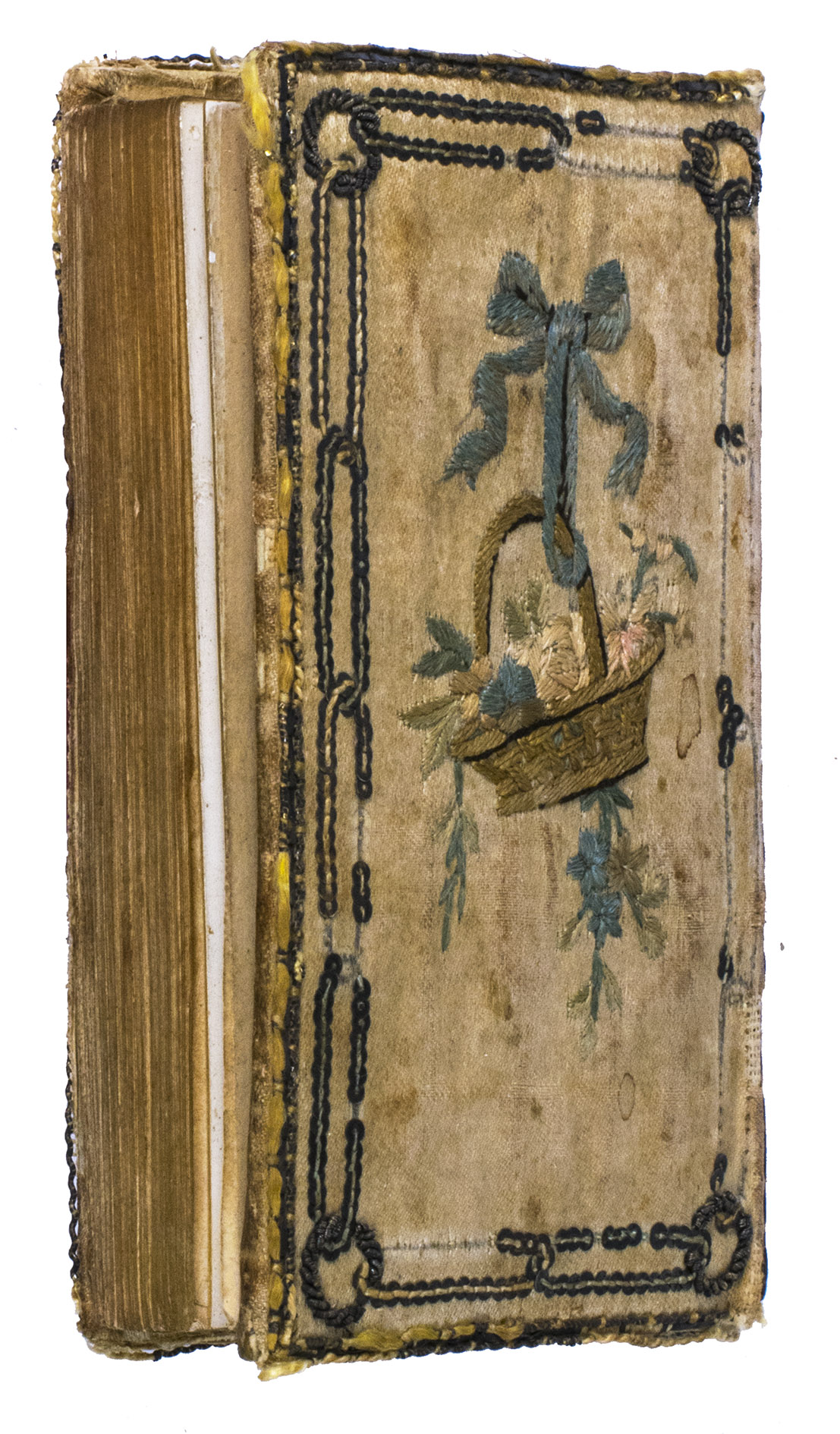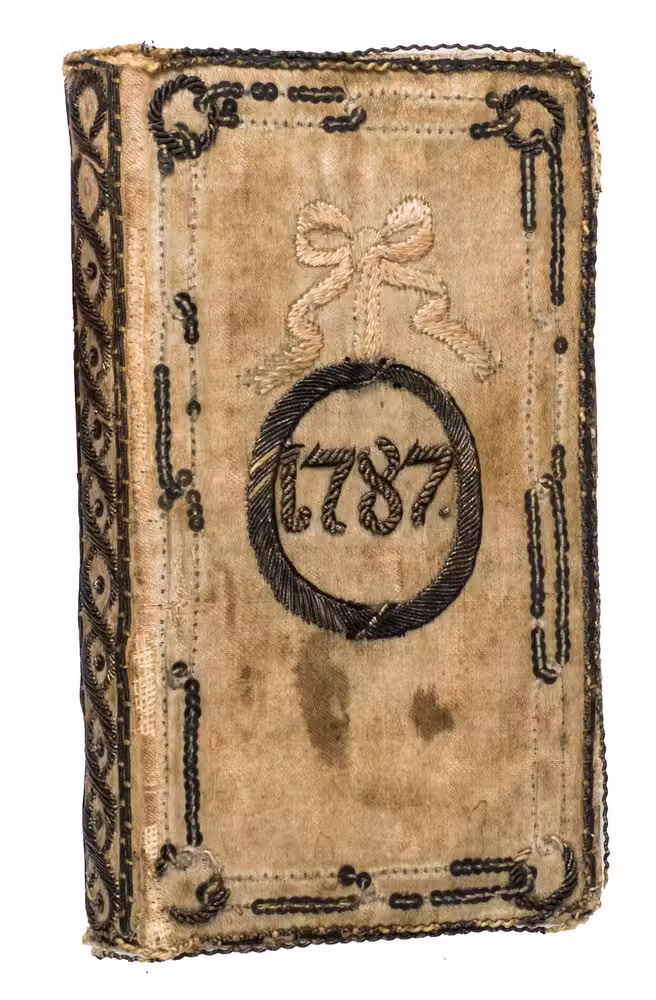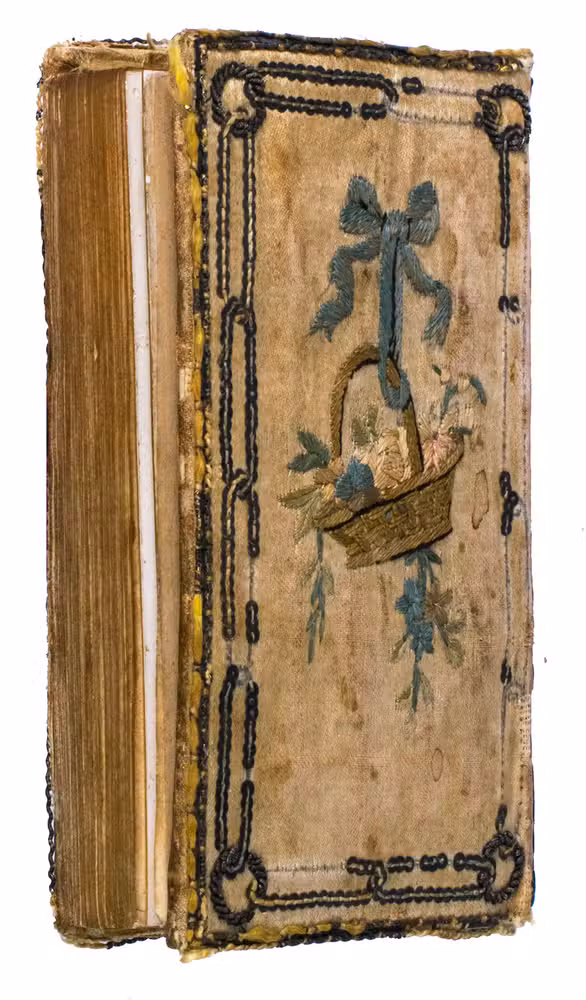 Berlin, George Jacques Decker, [1786]. 24mo (10.7 x 6.2 cm). With an engraved portrait of Princess Frederique of Prussia by C. Tounley after Cuningham, dated 1786 as a frontispiece. This is printed on one double-leaf with the engraved title page. Further with a folding engraved map (13 x 18.2 cm) by D.F. Soltzmann after C.L. Oesfeld (1785) showing the projected Kiel Canal, 12 numbered etchings illustrating the 12 months of the calendar by Daniel Chodowiecki. Text of all pages printed within a frame with small corner pieces. Contemporary German embroidered binding: ivory silk over boards, sides purled with (blackened) silver threat, a double row of silver sequins enclosing on the front cover the embroidered year "1787" within a wreath of silver thread hanging on an embroidered knot and on the back cover a basket with colored flowers also hanging on a knot, spine ornamented with silver thread, gilt edges. [240] pp.