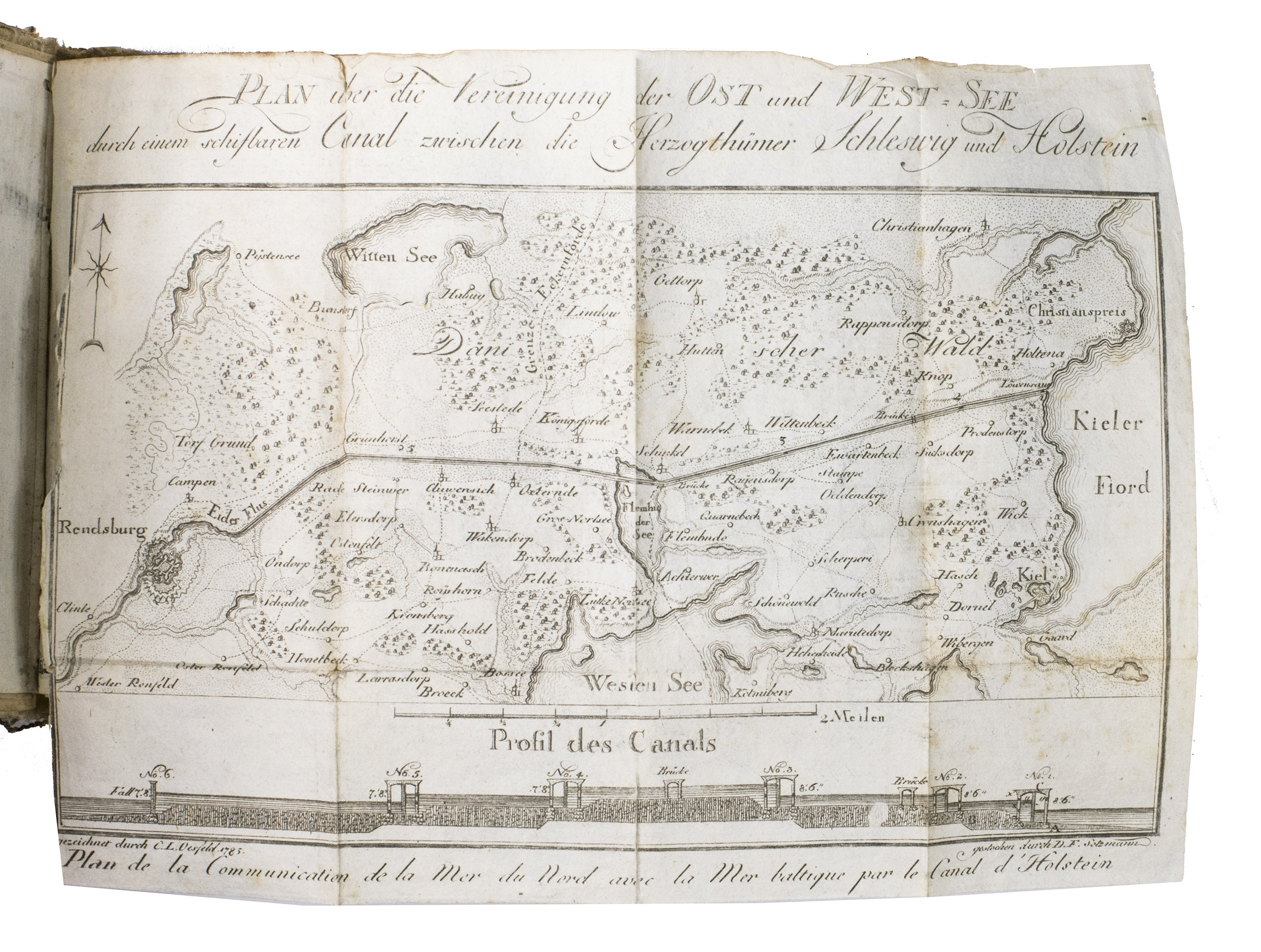 Rare almanac for 1787, from a series of Berlin almanacs that appeared under various titles from 1769 to 1813. The almanacs could be acquired with etched plates illustrating the 12 months by the greatest German book illustrator of the 18th century Daniel Chodowiecki. He was director of the Berlin Academy of Art and worked for the Berlin Genealogischer Kalender, or Almanac Généalogique from 1770 until his death in 1801, as well as for other almanac publishers. Chodowiecki was given free rein to choose the subjects of the 12 plates, always in the calendar section of the annual almanacs. He often chose popular plays; in the present work his 12 illustrations depict scenes from the play Die Jäger (Chasseurs) by the German actor and playwright August Wilhelm Iffland (1759-1814), published in 1785. The subject of each illustration is explained in a 7-page "Explication des estampes". Also included is an engraved portrait of the young Princess Frederique Charlotte Ulrique Catharine of Prussia (1767-1820), who would become Duchess of York and Albany through her marriage to Prince Frederick, King Georges second son in 1791. The folding map depicts the projected route of what is today known as the Kiel canal, completed in 1784, which joints the North Sea to the Baltic.