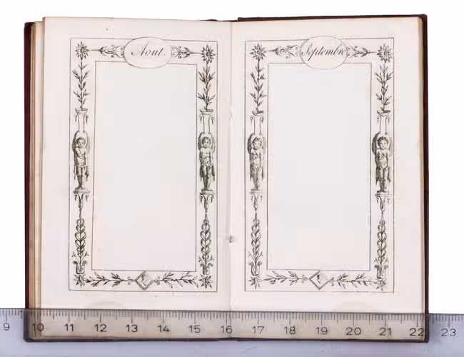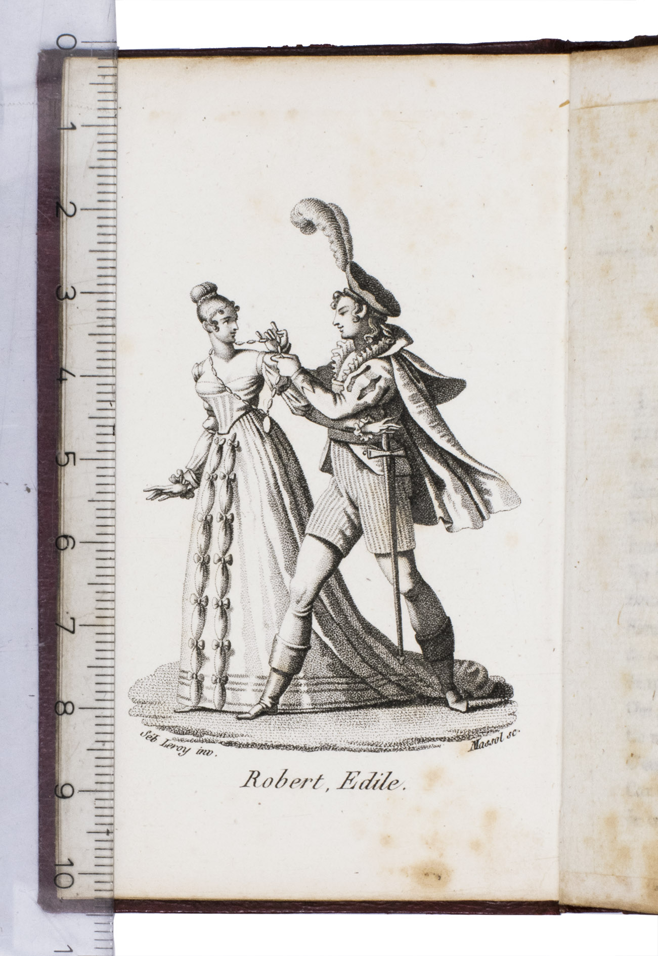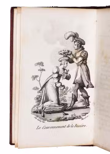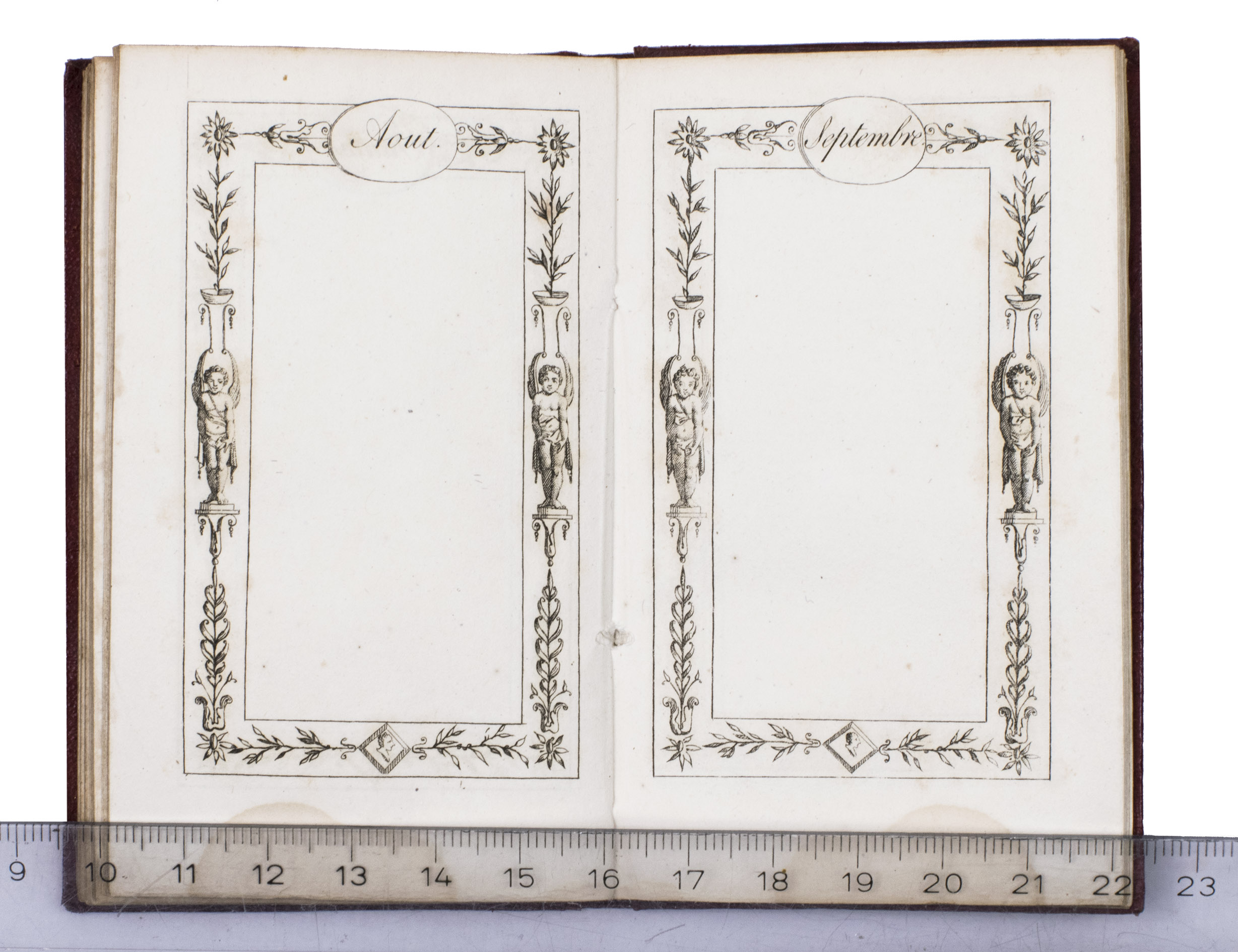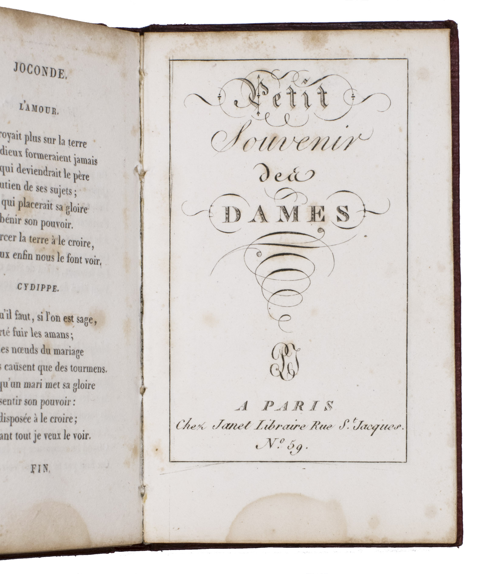 Beautiful almanac for ladies, here published for the first time, inspired by the great success of the Paris opéra comique of the same name, written by Nicolas Isouard (1775-1818). Consequently, Joconde contains a collection of the most popular songs from the musical, beautifully illustrated with engraved plates mostly of stage characters singing duets. The second part, Petit souvenir, consists of the calendar and blank leaves for each day of the week and each month, for annotations. Grand-Carteret lists only this one volume of the almanac, but he mentions that a Monsieur Weckerlin (possibly the composer Jean-Baptise Weckerlin) possessed a copy that was dated 1821.