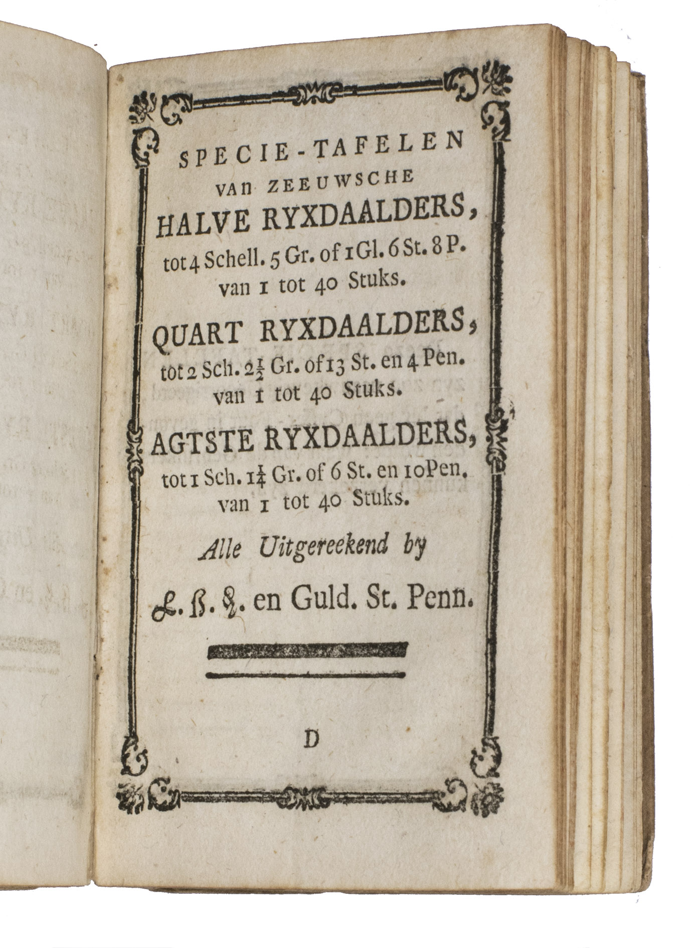 Separate volume of the famous Zeeland almanac teaching children the history of their province in a playful way, by means of questions and answers. Zeelands chronyk-almanach was published from 1777 to 1792, with each volume focussing on a separate aspect of Zeeland. The present volume describes the coins, which are depicted on the folding plates. It further includes the calendar, information on the tides, and the times of the closing of the gates in the various towns of the province, the dates of holidays and markets, the times of departure of the ferries, and an illustrated description of the Middelburg town hall. It also contains the fifth instalment of a chronicle of the history of Zeeland, which was published in parts in each volume.