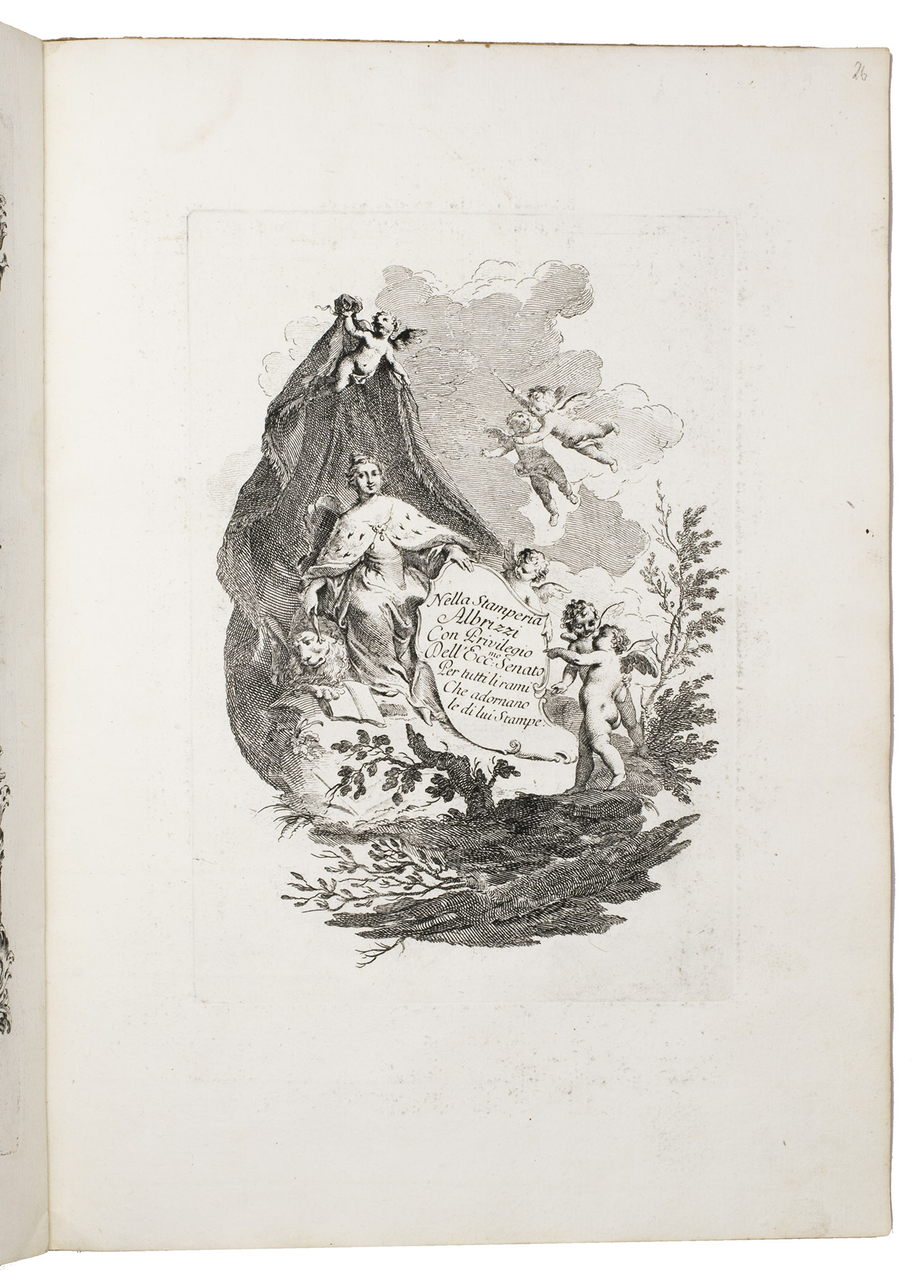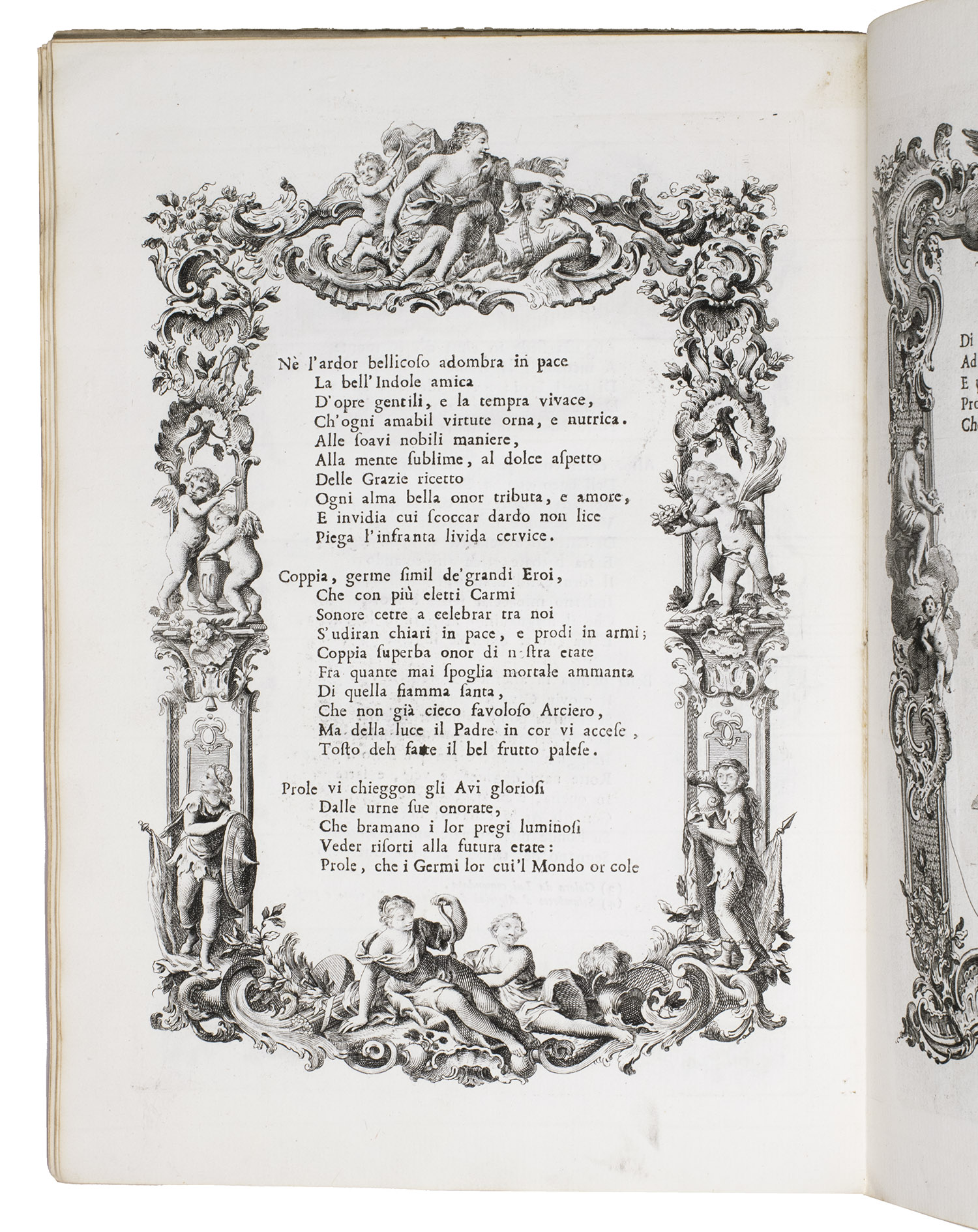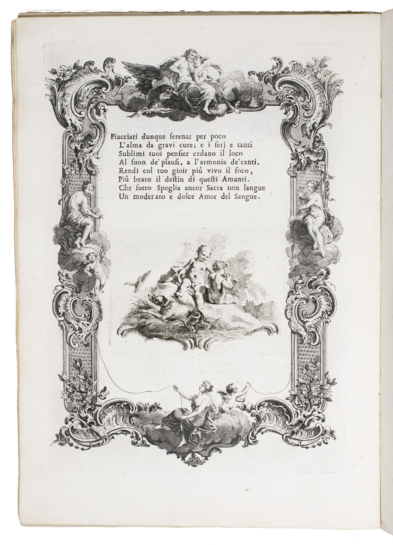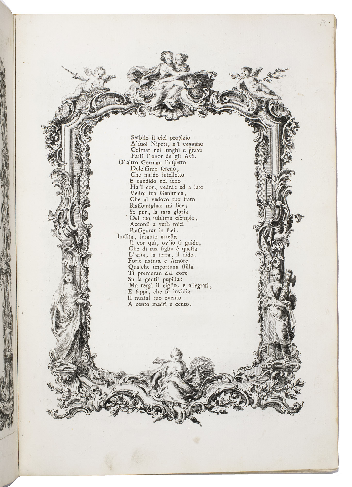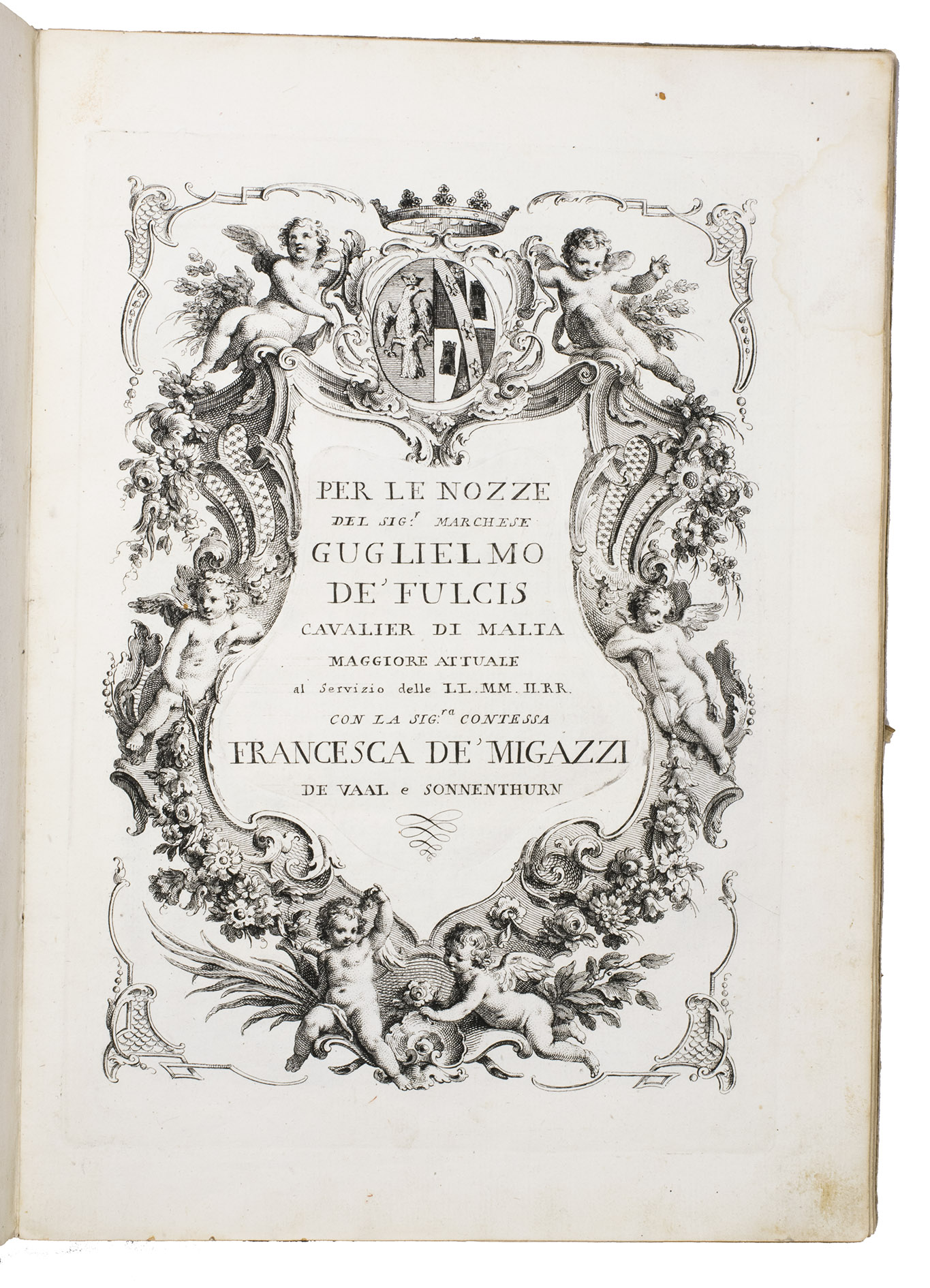 [Venice], (colophon: nella stamperia Albrizzi con privilegio dell' Ecc.mo Senato per tutti li rami che adornano le di lui stampe, 1776). Folio (35 x 25 cm). Engraved frontispiece with a decorative rococo border, engraved title in a rococo border incorporating the coat-of-arms of Guglielmo de' Fulcis, engraved full-page colophon on the last leaf; 7 pp. with additional engraved allegorical vignettes, one on C3 signed ''Piazzetta inv.''. Contemporary light green paper wrappers with gold rococo ornamental borders and a gold centre piece with allegorical seated figure on the front and back side of the wrappers, probably made for presentation to the bride, groom or an important person who attended the wedding. [57], [1 blank] pp.