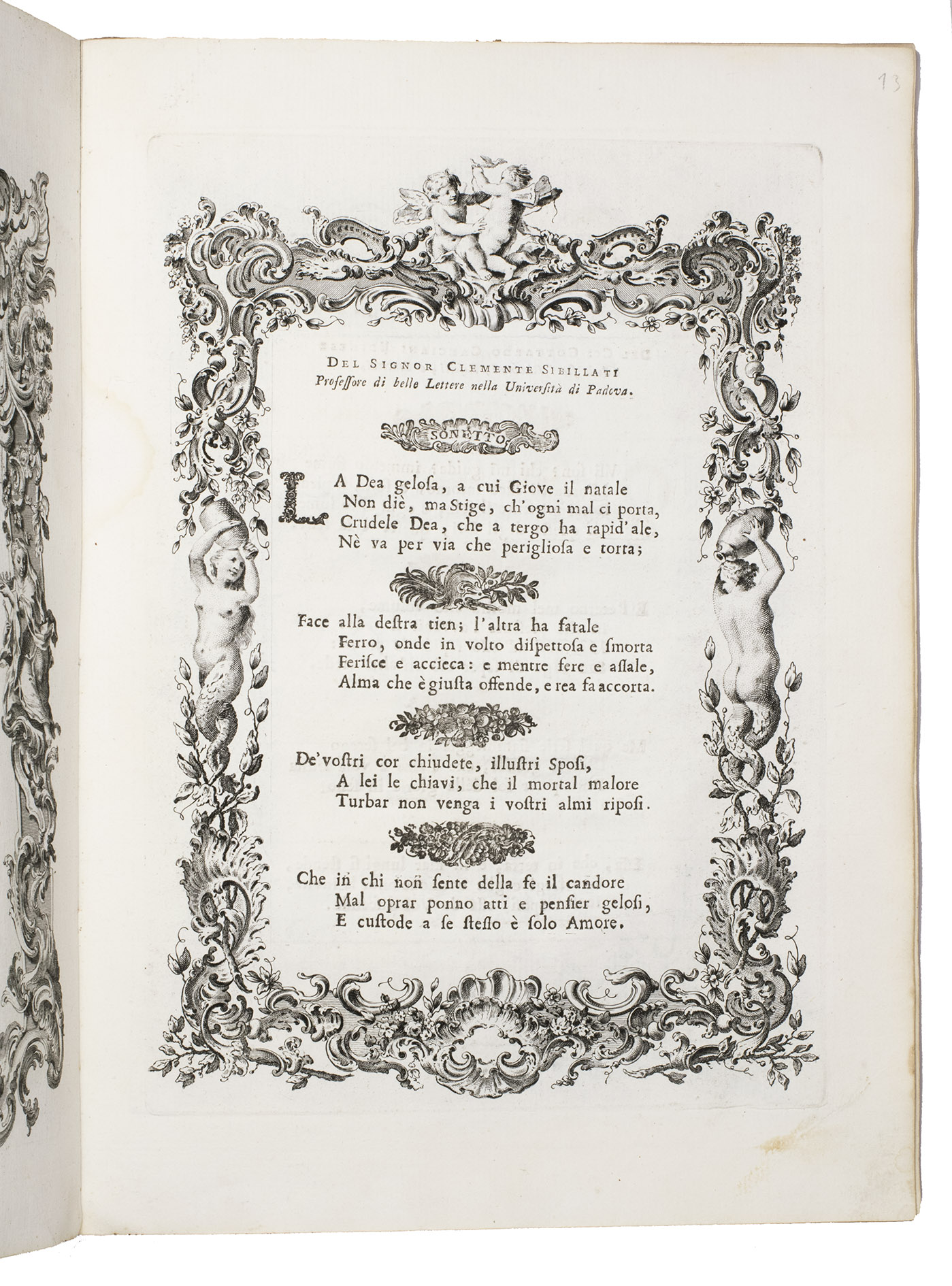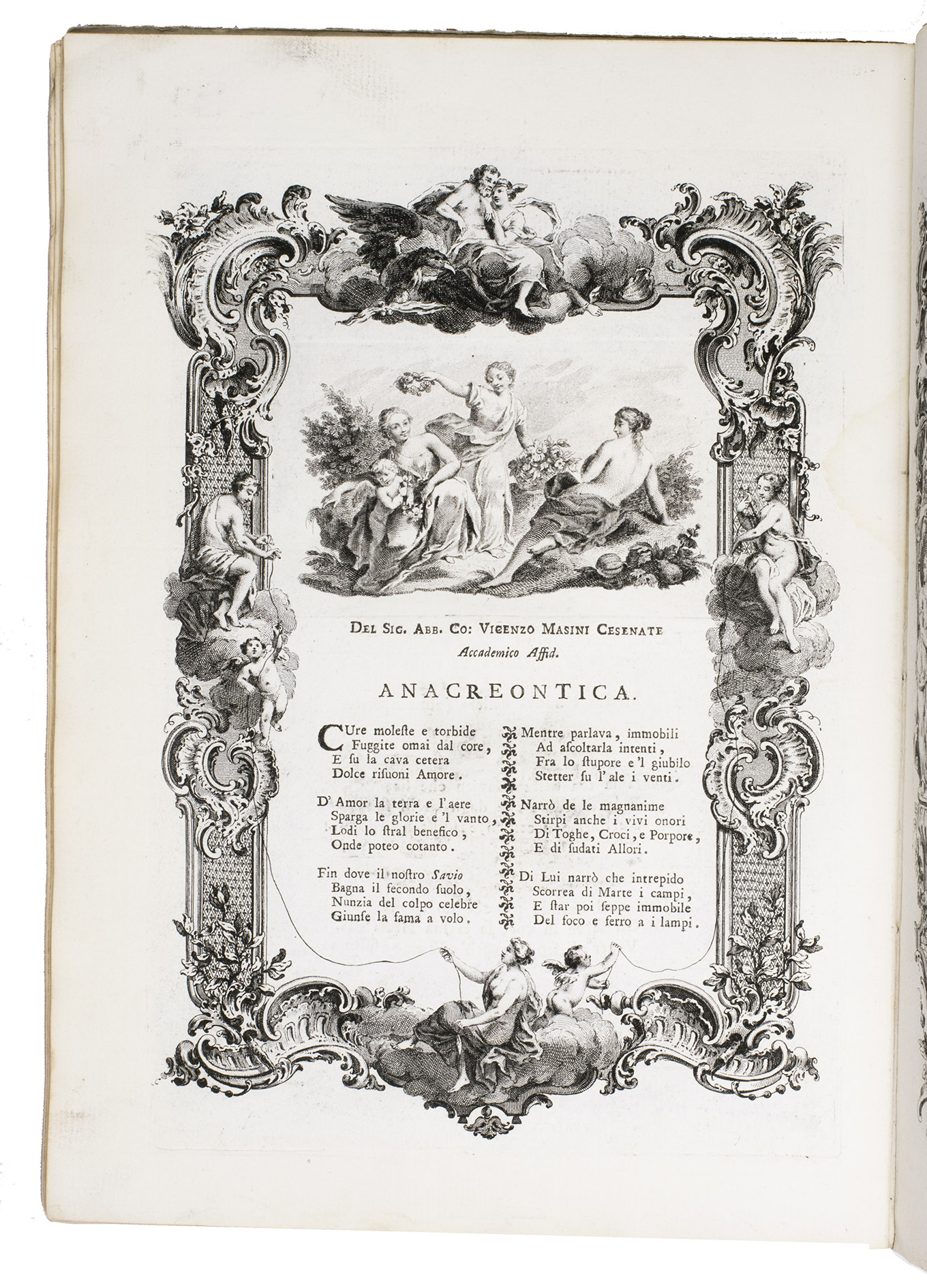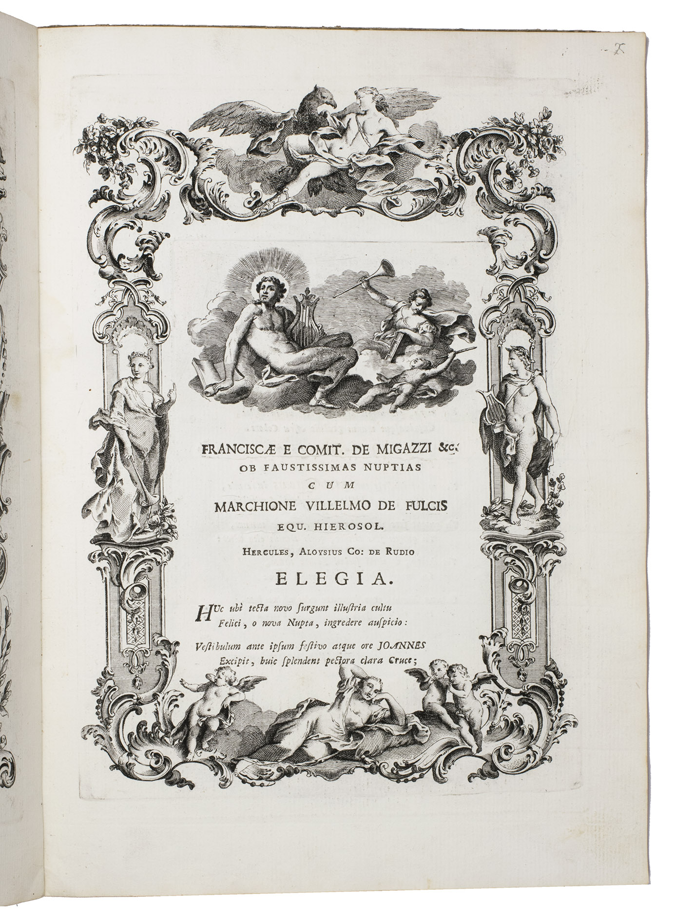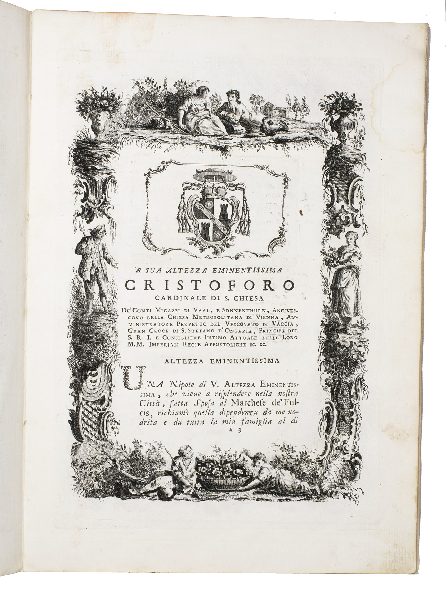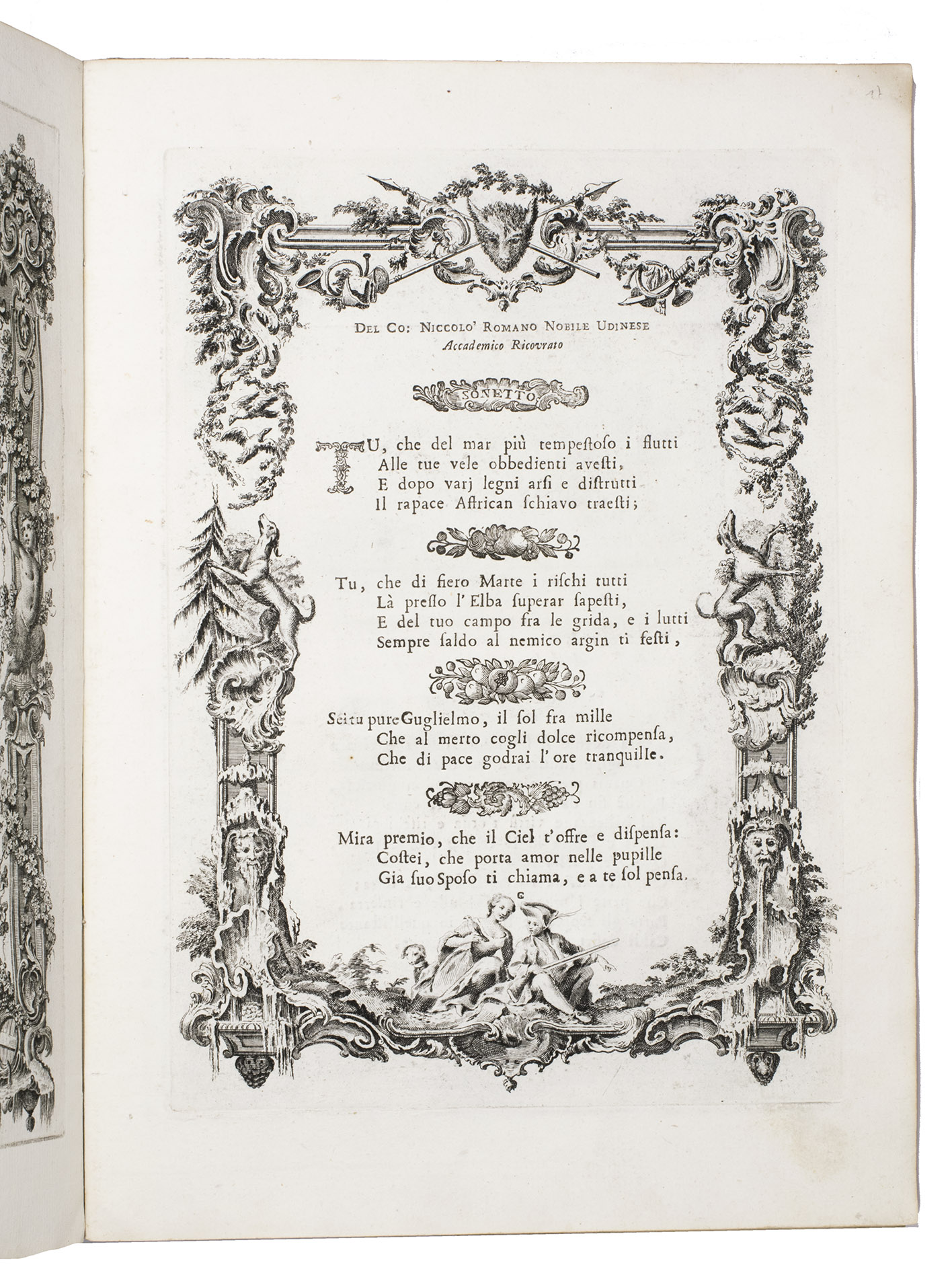 [Venice], (colophon: nella stamperia Albrizzi con privilegio dell' Ecc.mo Senato per tutti li rami che adornano le di lui stampe, 1776). Folio (35 x 25 cm). Engraved frontispiece with a decorative rococo border, engraved title in a rococo border incorporating the coat-of-arms of Guglielmo de' Fulcis, engraved full-page colophon on the last leaf; 7 pp. with additional engraved allegorical vignettes, one on C3 signed ''Piazzetta inv.''. Contemporary light green paper wrappers with gold rococo ornamental borders and a gold centre piece with allegorical seated figure on the front and back side of the wrappers, probably made for presentation to the bride, groom or an important person who attended the wedding. [57], [1 blank] pp.