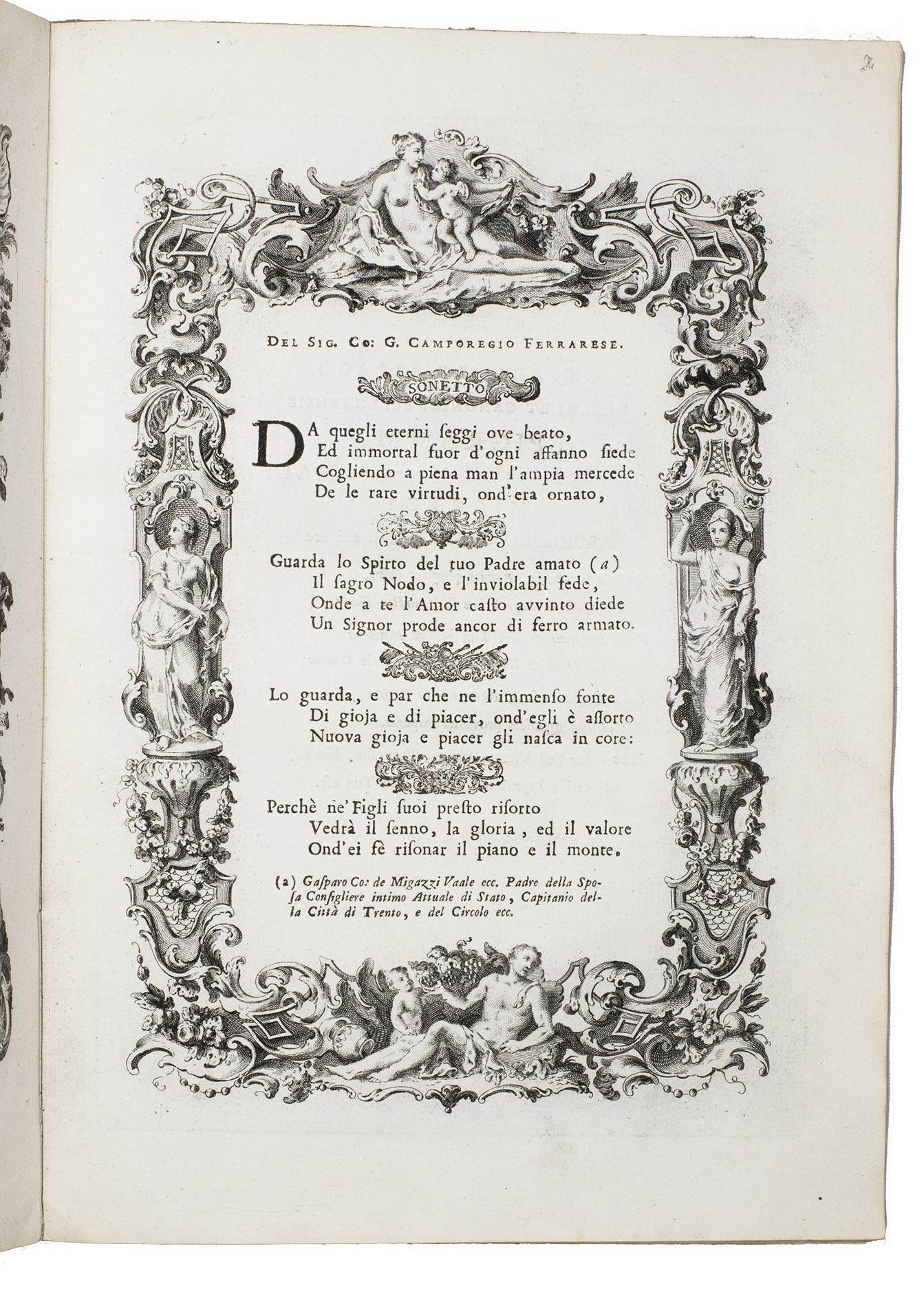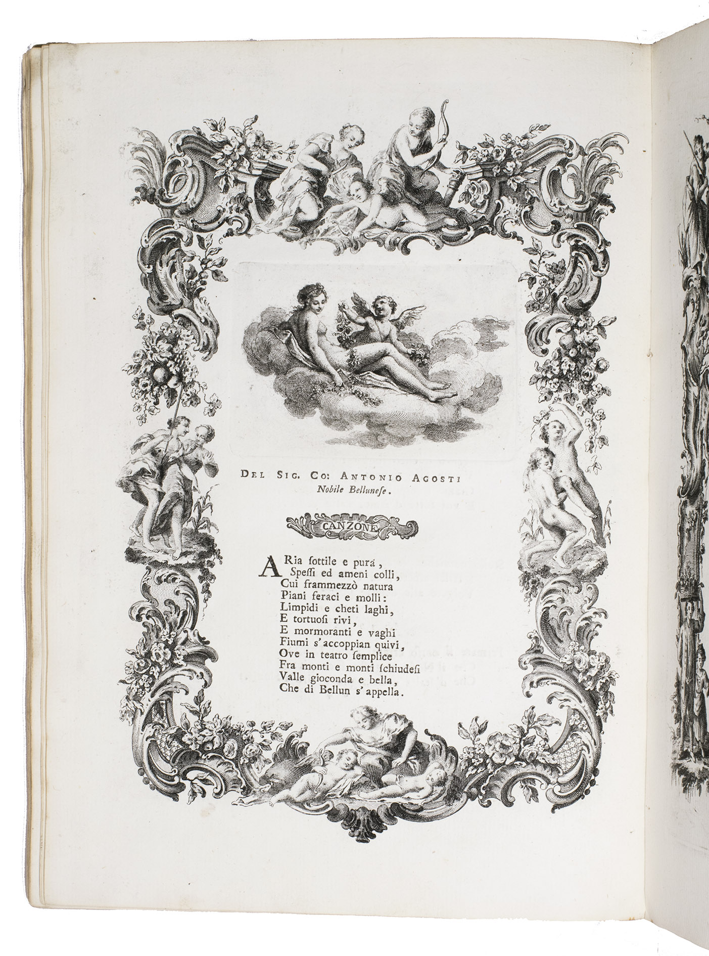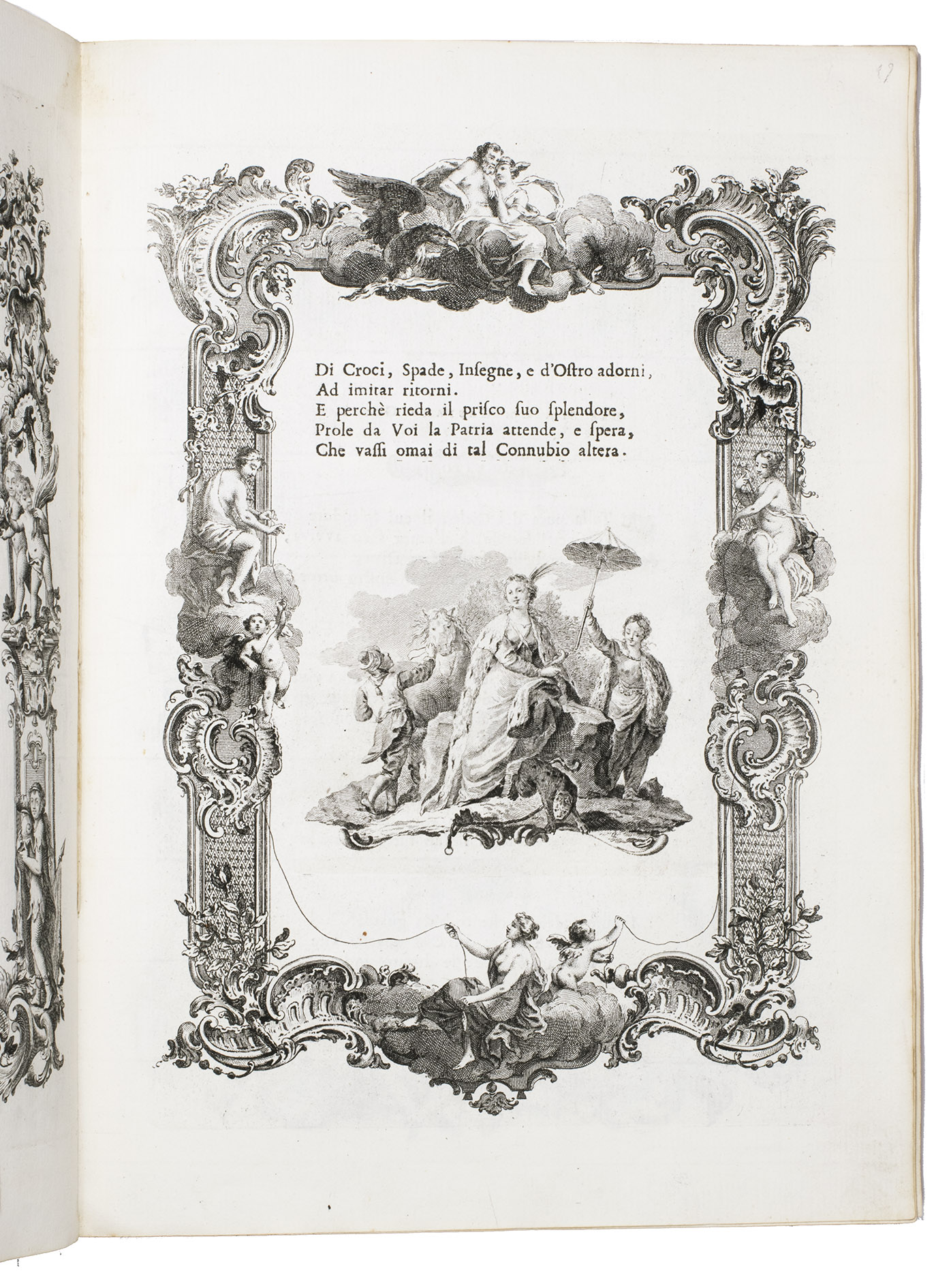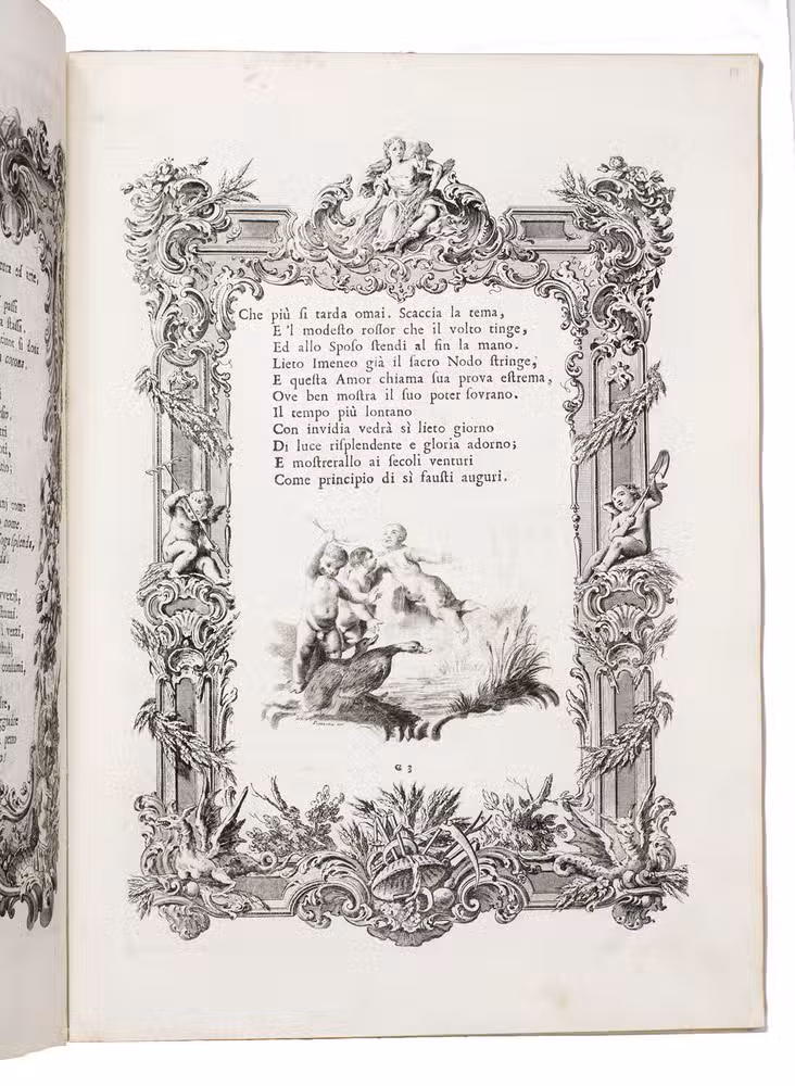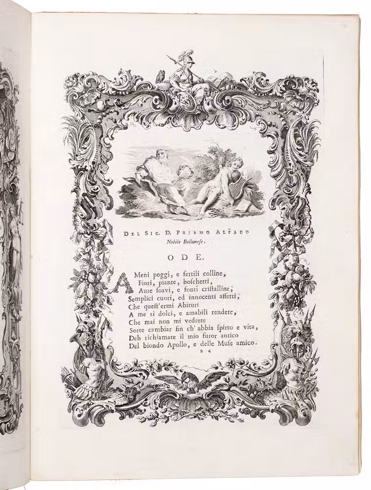 [Venice], (colophon: nella stamperia Albrizzi con privilegio dell' Ecc.mo Senato per tutti li rami che adornano le di lui stampe, 1776). Folio (35 x 25 cm). Engraved frontispiece with a decorative rococo border, engraved title in a rococo border incorporating the coat-of-arms of Guglielmo de' Fulcis, engraved full-page colophon on the last leaf; 7 pp. with additional engraved allegorical vignettes, one on C3 signed ''Piazzetta inv.''. Contemporary light green paper wrappers with gold rococo ornamental borders and a gold centre piece with allegorical seated figure on the front and back side of the wrappers, probably made for presentation to the bride, groom or an important person who attended the wedding. [57], [1 blank] pp.