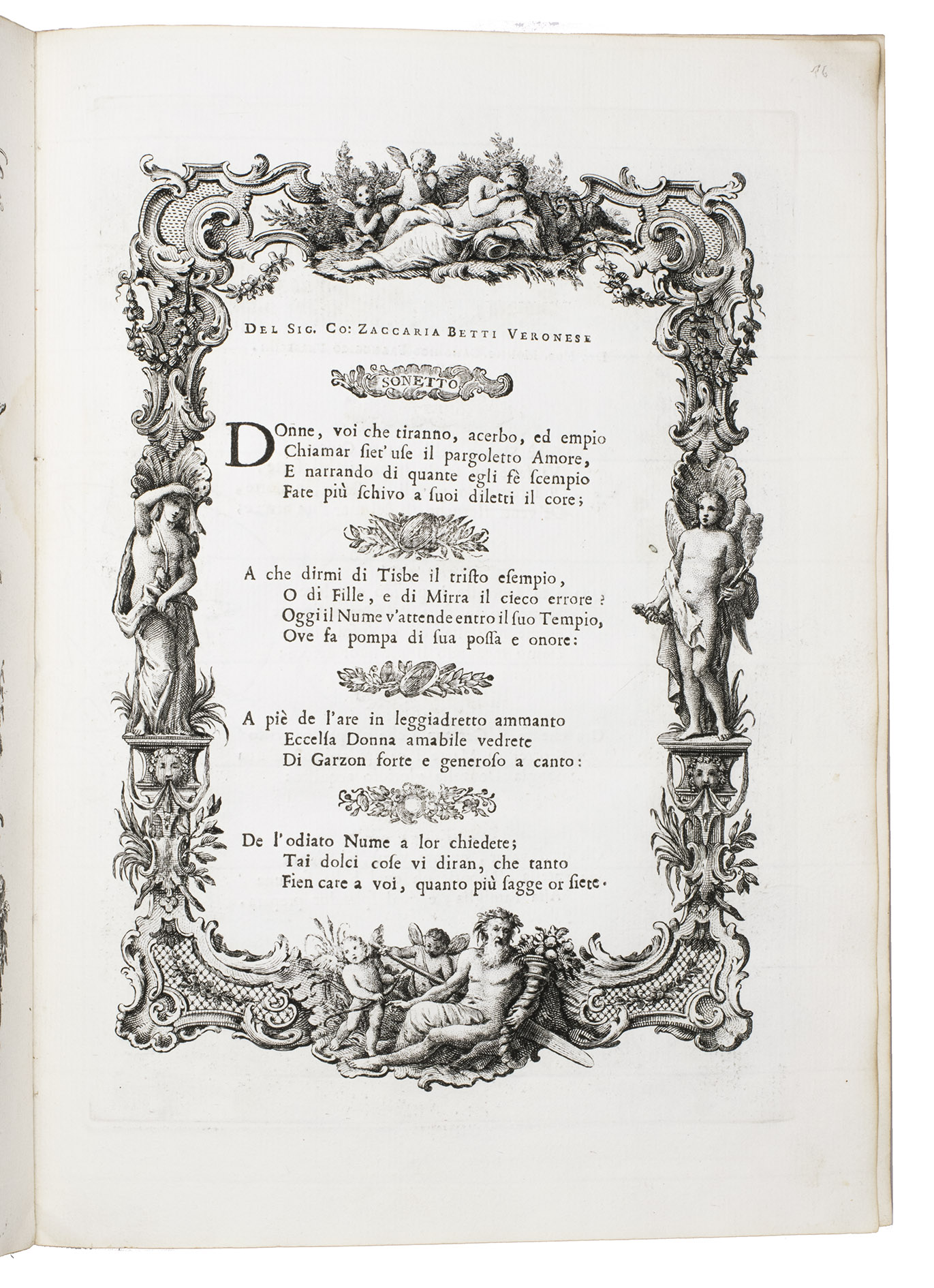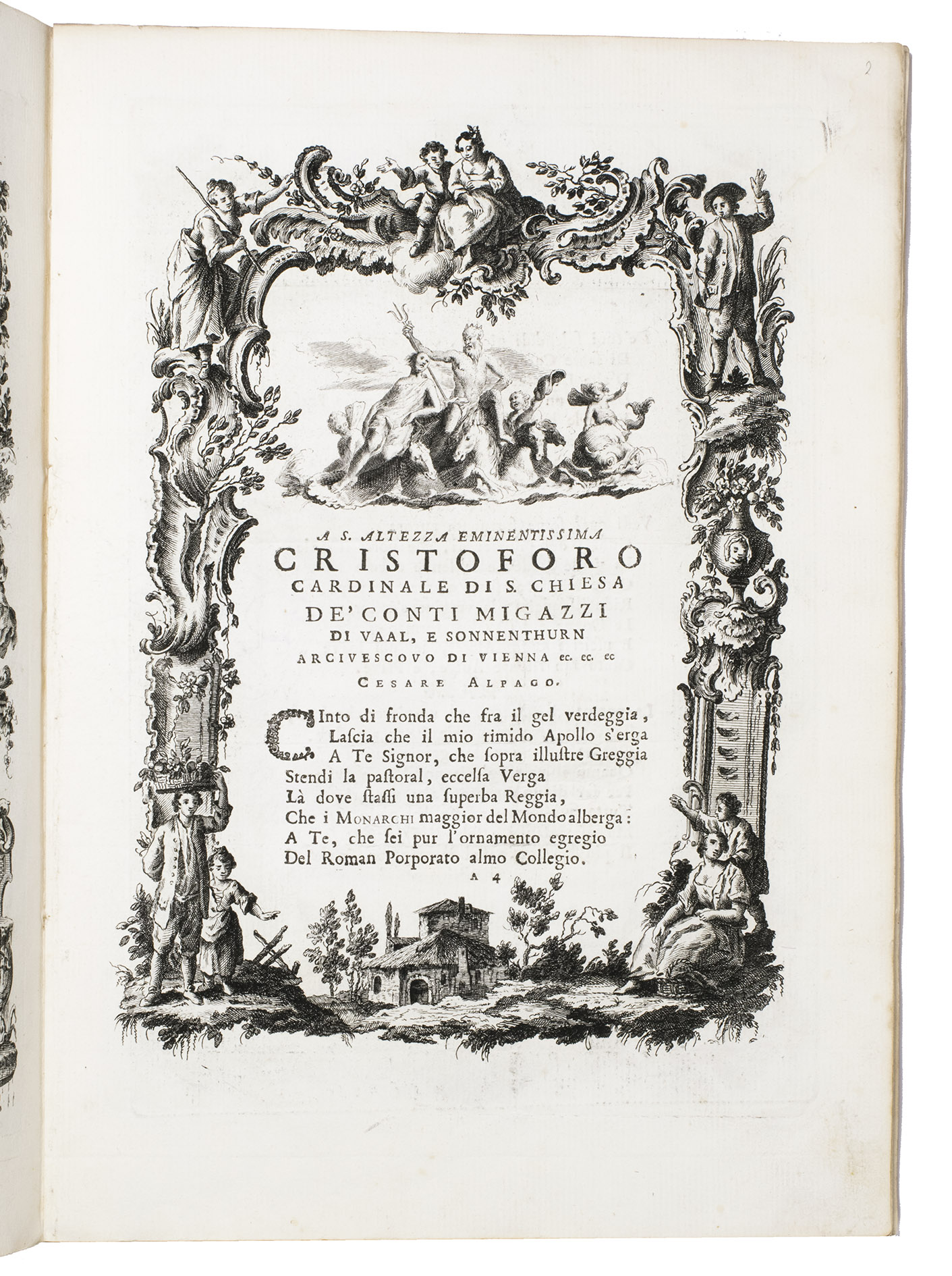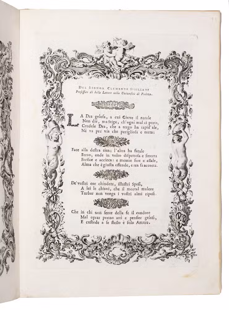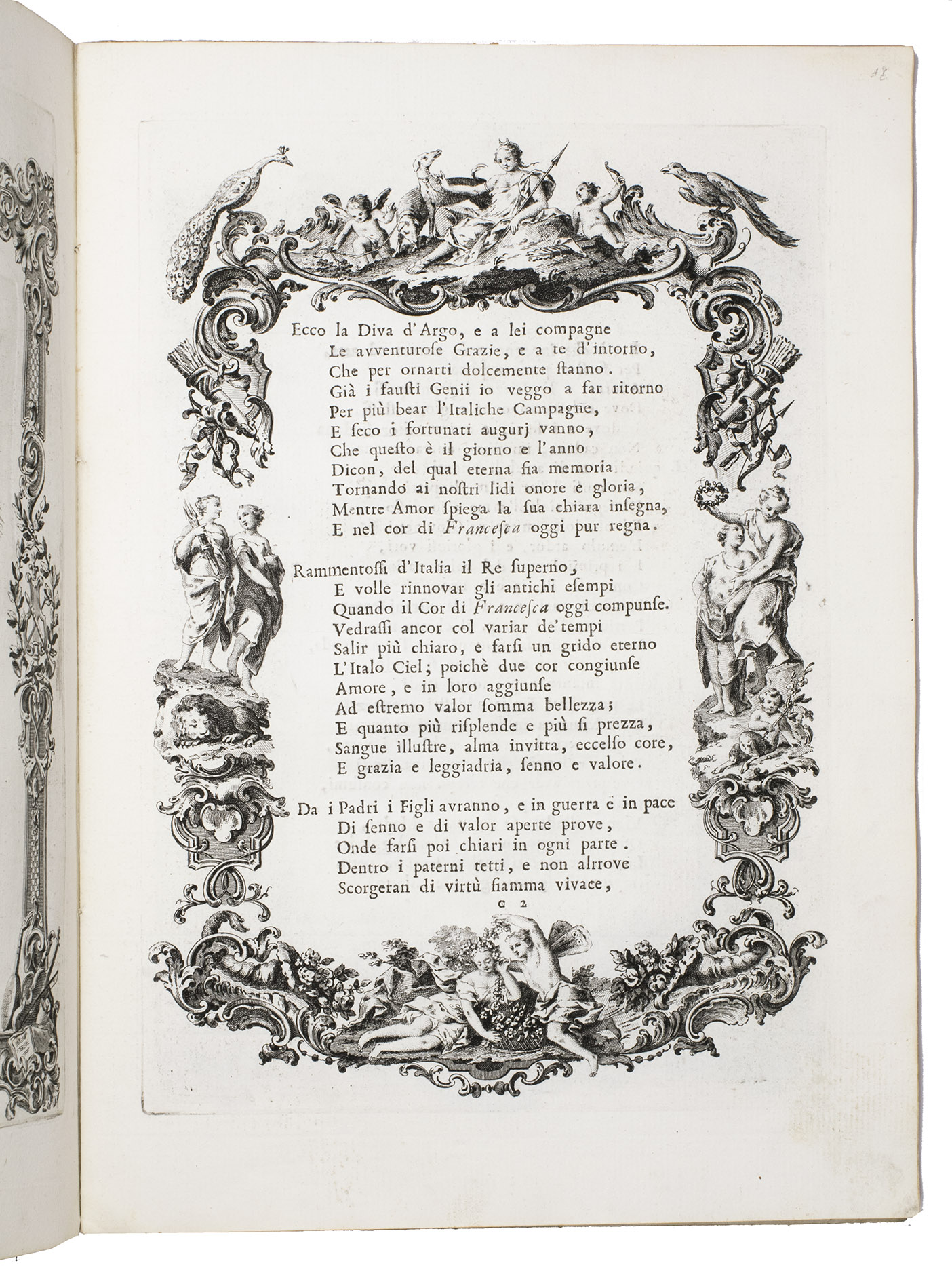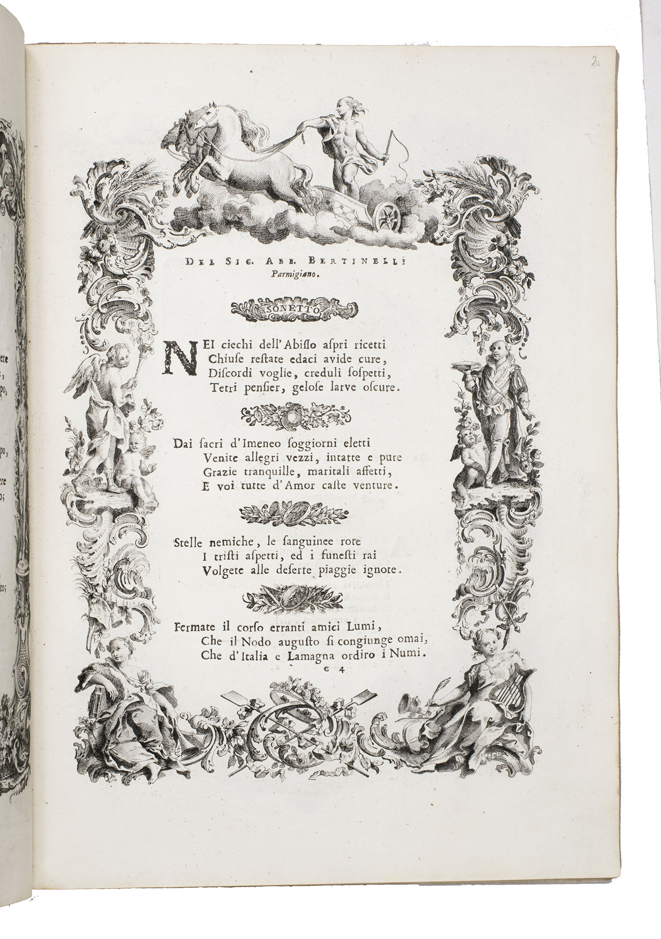 [Venice], (colophon: nella stamperia Albrizzi con privilegio dell' Ecc.mo Senato per tutti li rami che adornano le di lui stampe, 1776). Folio (35 x 25 cm). Engraved frontispiece with a decorative rococo border, engraved title in a rococo border incorporating the coat-of-arms of Guglielmo de' Fulcis, engraved full-page colophon on the last leaf; 7 pp. with additional engraved allegorical vignettes, one on C3 signed ''Piazzetta inv.''. Contemporary light green paper wrappers with gold rococo ornamental borders and a gold centre piece with allegorical seated figure on the front and back side of the wrappers, probably made for presentation to the bride, groom or an important person who attended the wedding. [57], [1 blank] pp.
