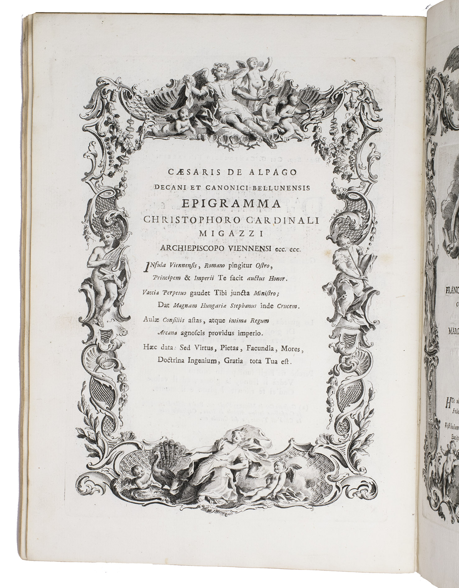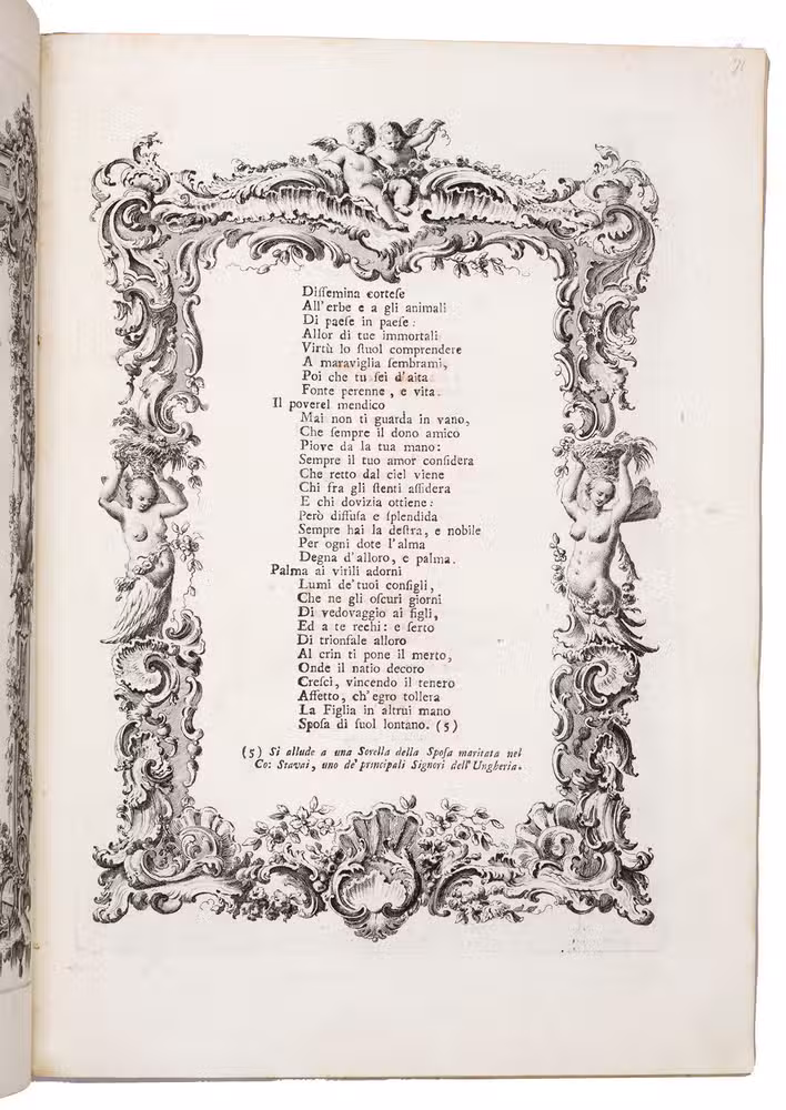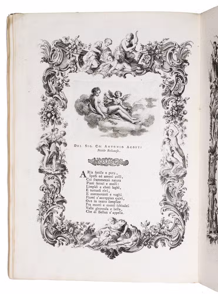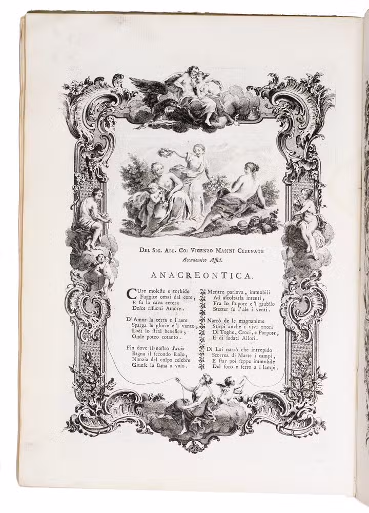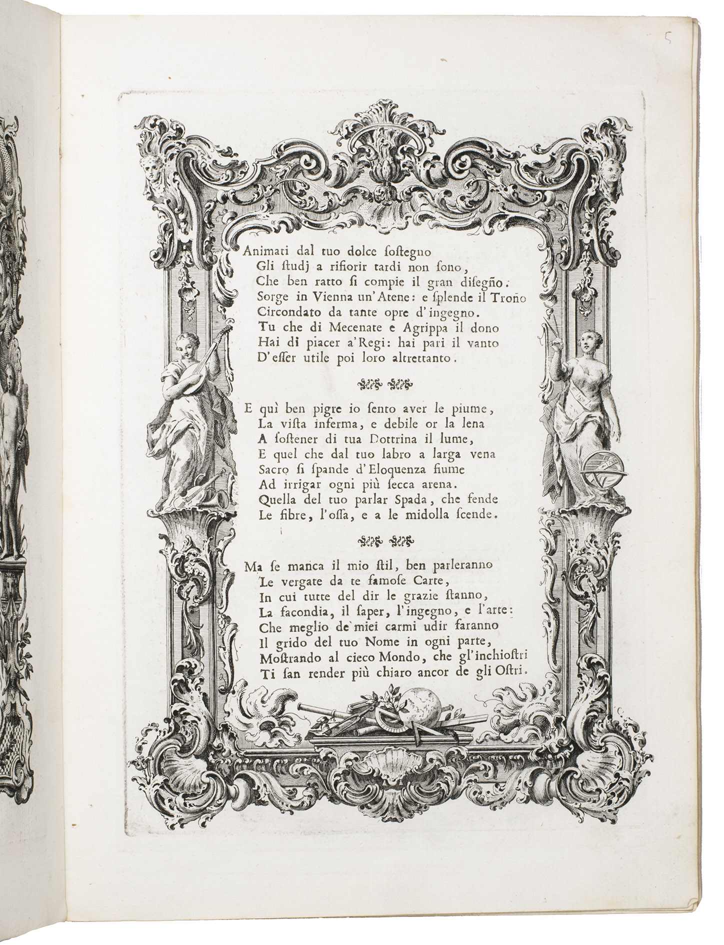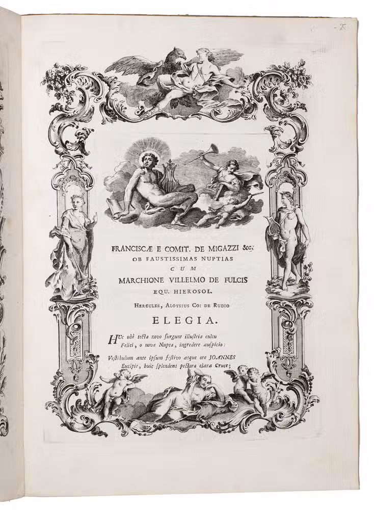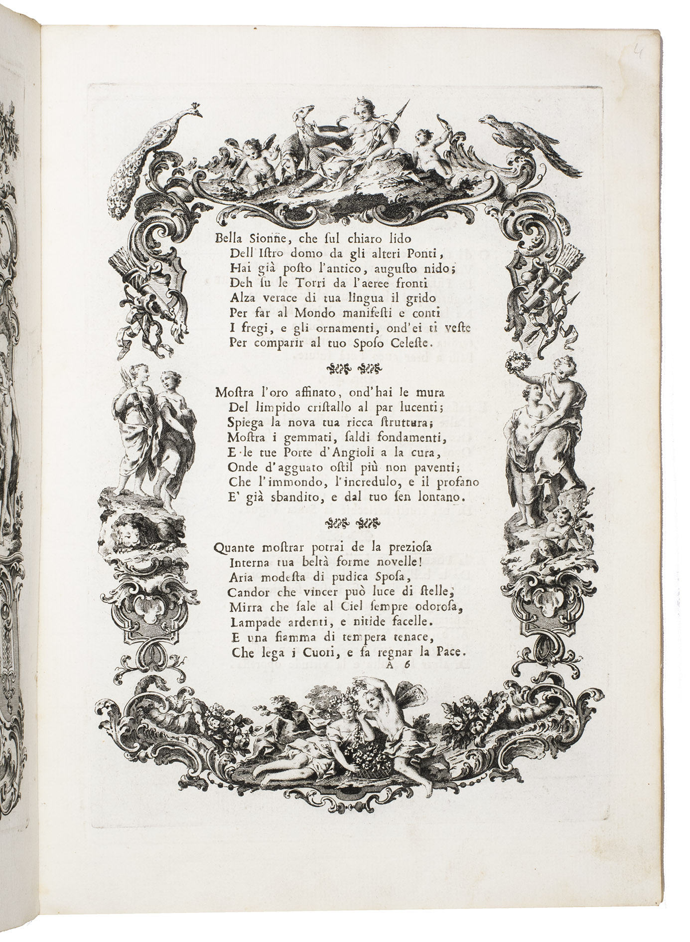 [Venice], (colophon: nella stamperia Albrizzi con privilegio dell' Ecc.mo Senato per tutti li rami che adornano le di lui stampe, 1776). Folio (35 x 25 cm). Engraved frontispiece with a decorative rococo border, engraved title in a rococo border incorporating the coat-of-arms of Guglielmo de' Fulcis, engraved full-page colophon on the last leaf; 7 pp. with additional engraved allegorical vignettes, one on C3 signed ''Piazzetta inv.''. Contemporary light green paper wrappers with gold rococo ornamental borders and a gold centre piece with allegorical seated figure on the front and back side of the wrappers, probably made for presentation to the bride, groom or an important person who attended the wedding. [57], [1 blank] pp.