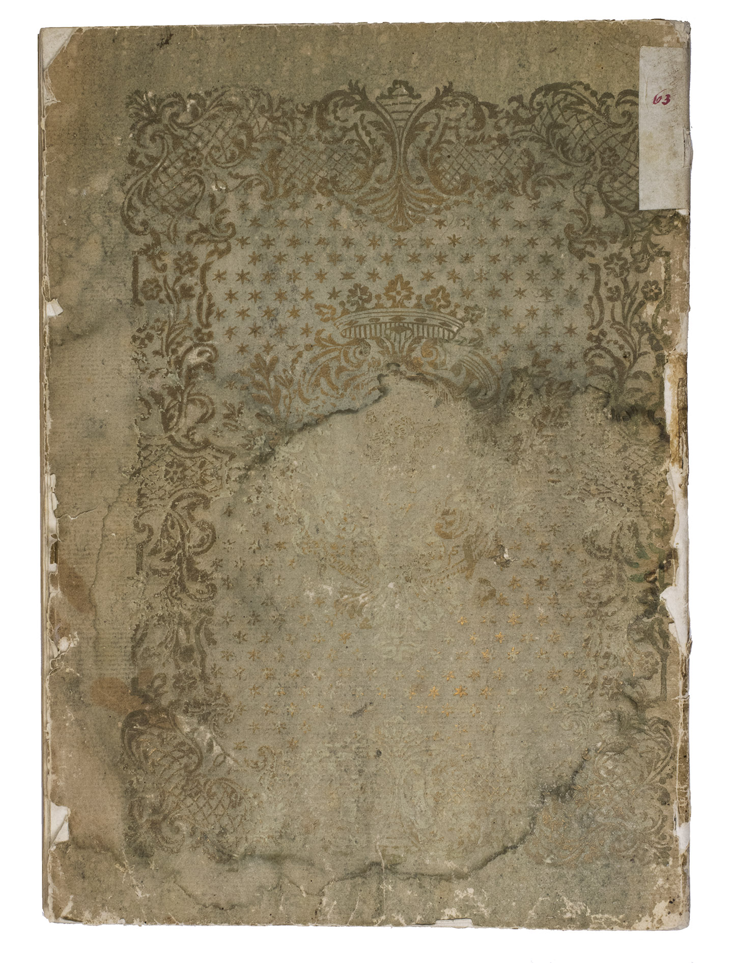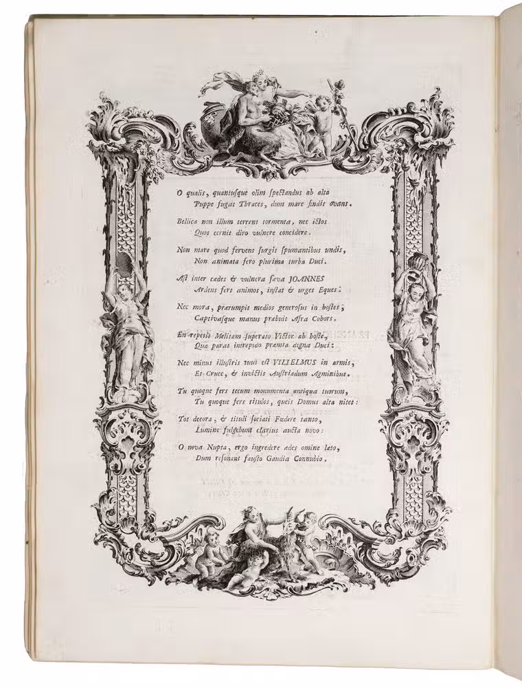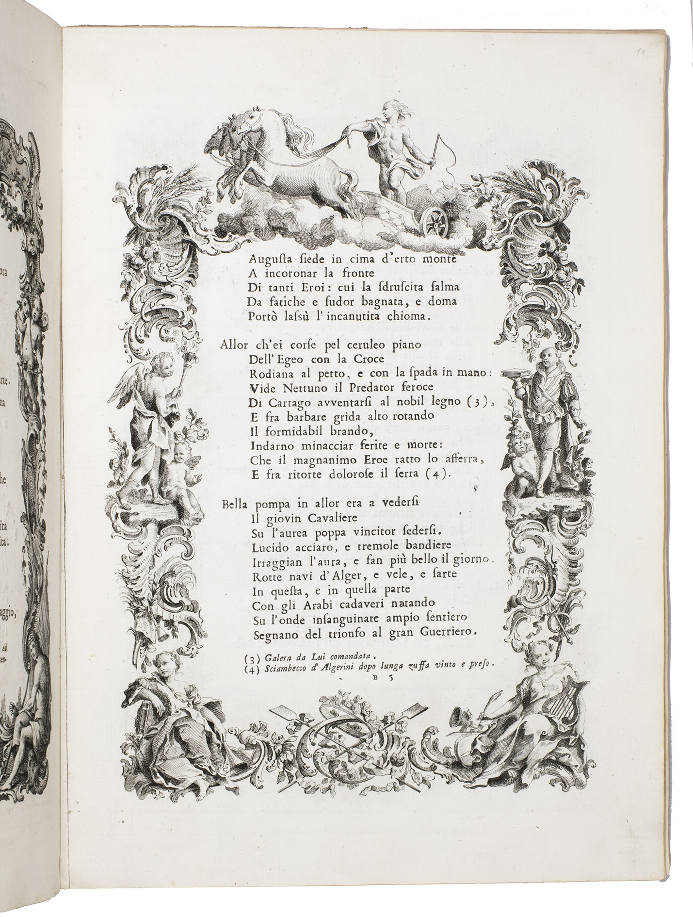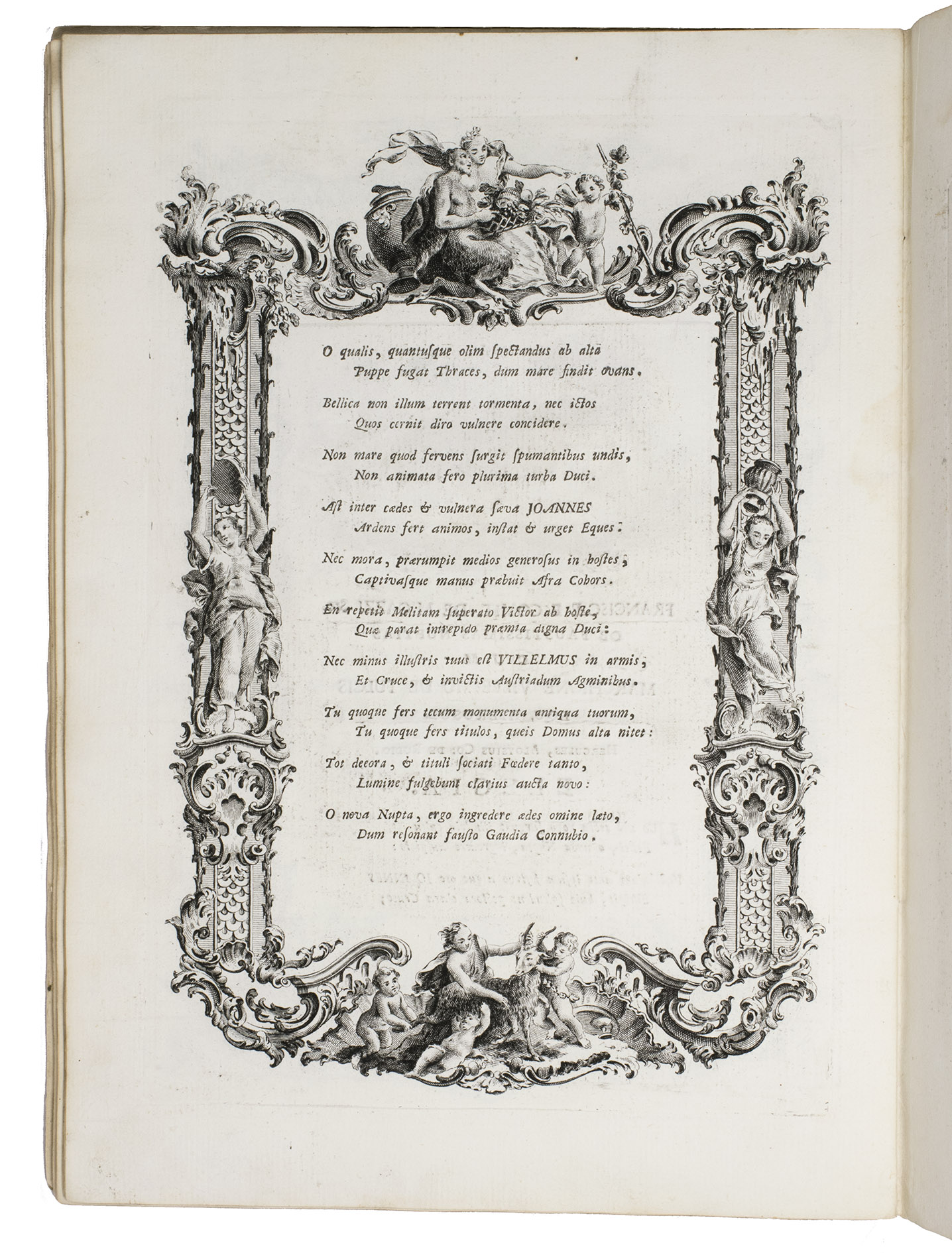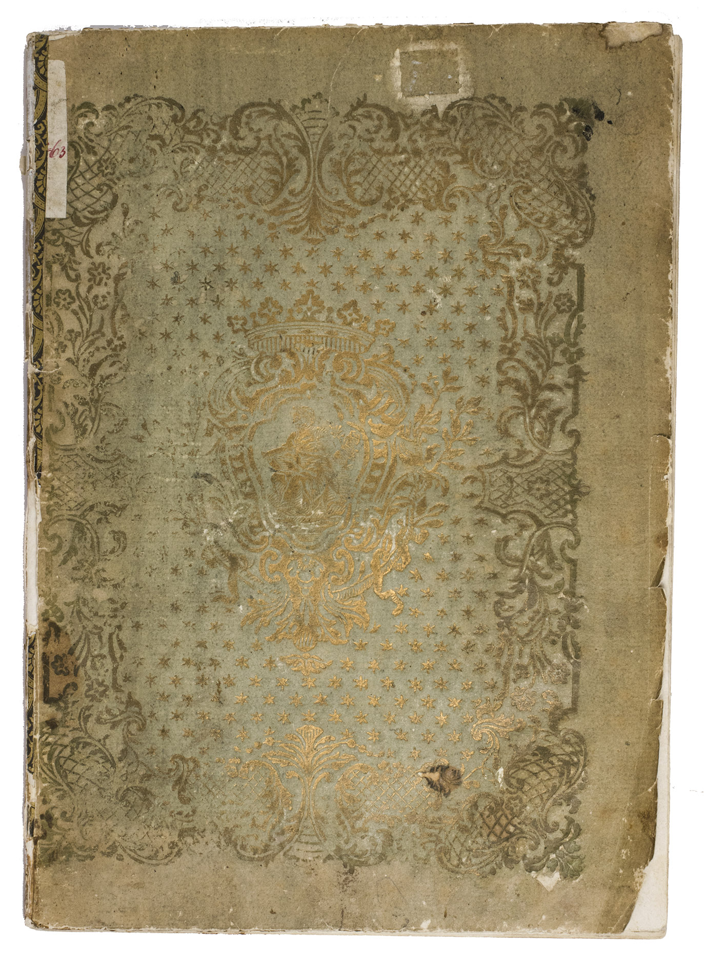 [Venice], (colophon: nella stamperia Albrizzi con privilegio dell' Ecc.mo Senato per tutti li rami che adornano le di lui stampe, 1776). Folio (35 x 25 cm). Engraved frontispiece with a decorative rococo border, engraved title in a rococo border incorporating the coat-of-arms of Guglielmo de' Fulcis, engraved full-page colophon on the last leaf; 7 pp. with additional engraved allegorical vignettes, one on C3 signed ''Piazzetta inv.''. Contemporary light green paper wrappers with gold rococo ornamental borders and a gold centre piece with allegorical seated figure on the front and back side of the wrappers, probably made for presentation to the bride, groom or an important person who attended the wedding. [57], [1 blank] pp.