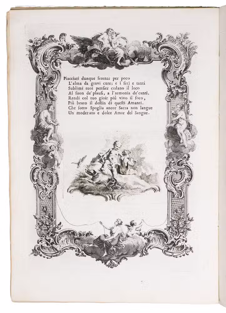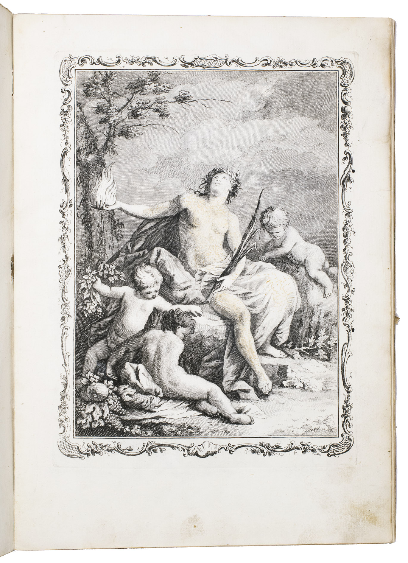 Binding a bit faded and frayed, spine partly gone, but overall in good condition. A fine example of 18th-century rococo Venetian book illustration. Morazzoni, Il libro illustrato veneziano del settecento, p. 297; WorldCat 26903707 & 797442254 (2 copies); not in Berlin Kat.