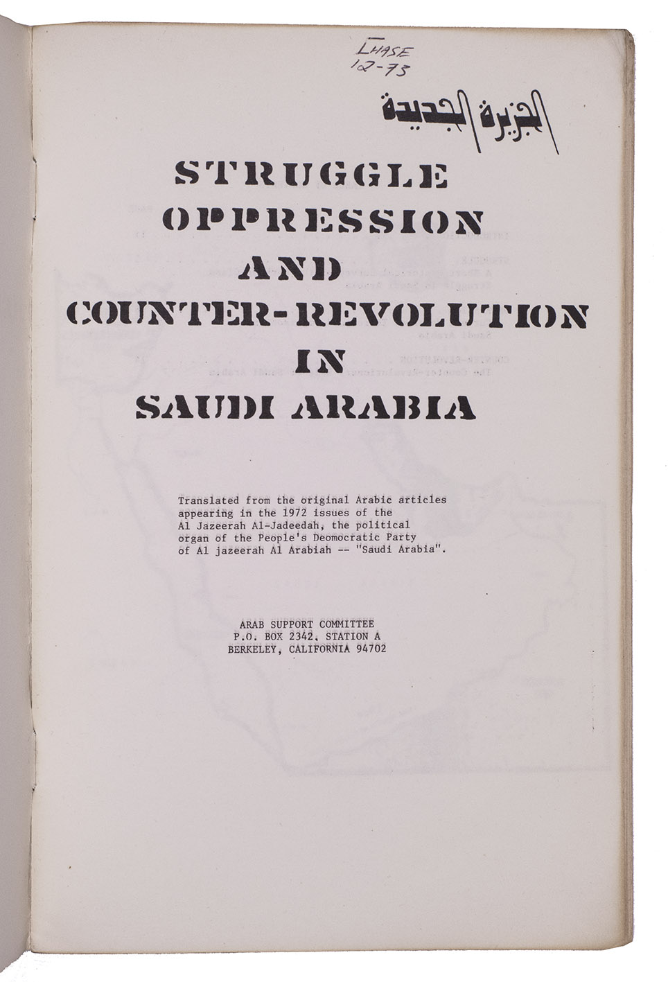 Berkeley, CA, Arab Support Committee, [ca. 1973]. With a map of the Arabian peninsula. Original publisher's wrappers. [5], 25 pp.