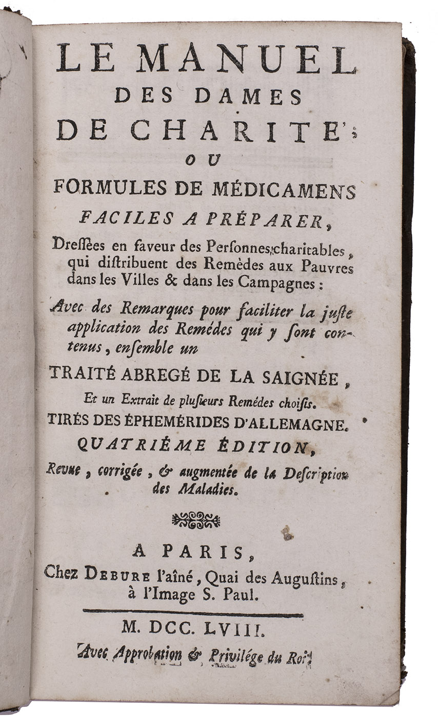 Le manuel des dames de charité, ou, formules de médicamens faciles a préparer, dressées en faveur des personnes charitables, qui distribuent des remèdes aux pauvres dans les villes & dans les campagnes: avec des remarques pour faciliter la juste application des remèdes qui y sont contenus, ensemble un traité abregé de la saignée, et un extrait de plusieurs remèdes choisis. Tirés des éphemérides d'Allemagne.
