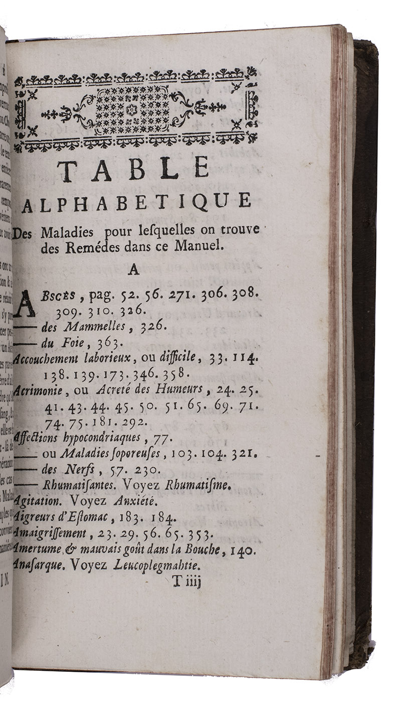 With a 1777 owner's inscription on the fly-leaf. Binding worn at the extremities; spine damaged at the head and tail. With a few spots on the title page; otherwise internally in very good condition. Ramsey, "The popularization of medicine in France, 1650-1900", in: Porter, The popularization of medicine, pp. 97-133; Wellcome II, p. 58; Weston, Medical consulting by letter in France, 1665-1789, p. 193; not in Krivatsy.