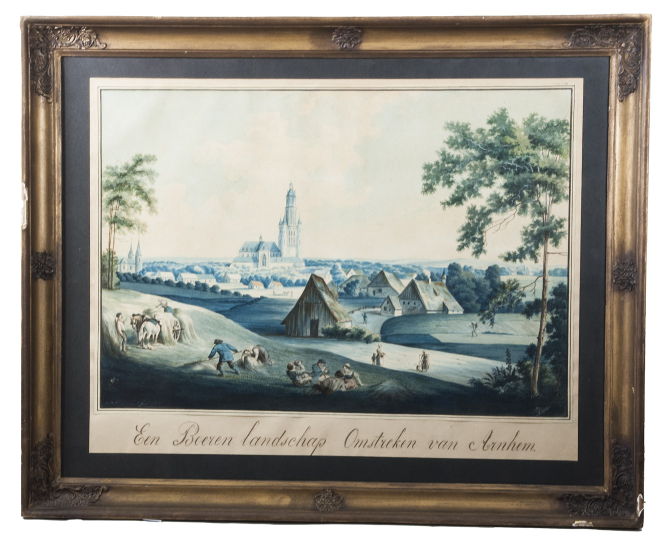 Beautiful watercolour by Jacobus Wilhelmus Adrianus Hilverdink (1809-1864), showing a charming scenery with houses and farm houses in the outskirts of the city of Arnhem, with the famous Late Gothic Eusebius Church in the centre of the back ground; farmers are working and harvesting in the fields, some of them eating and drinking in front.