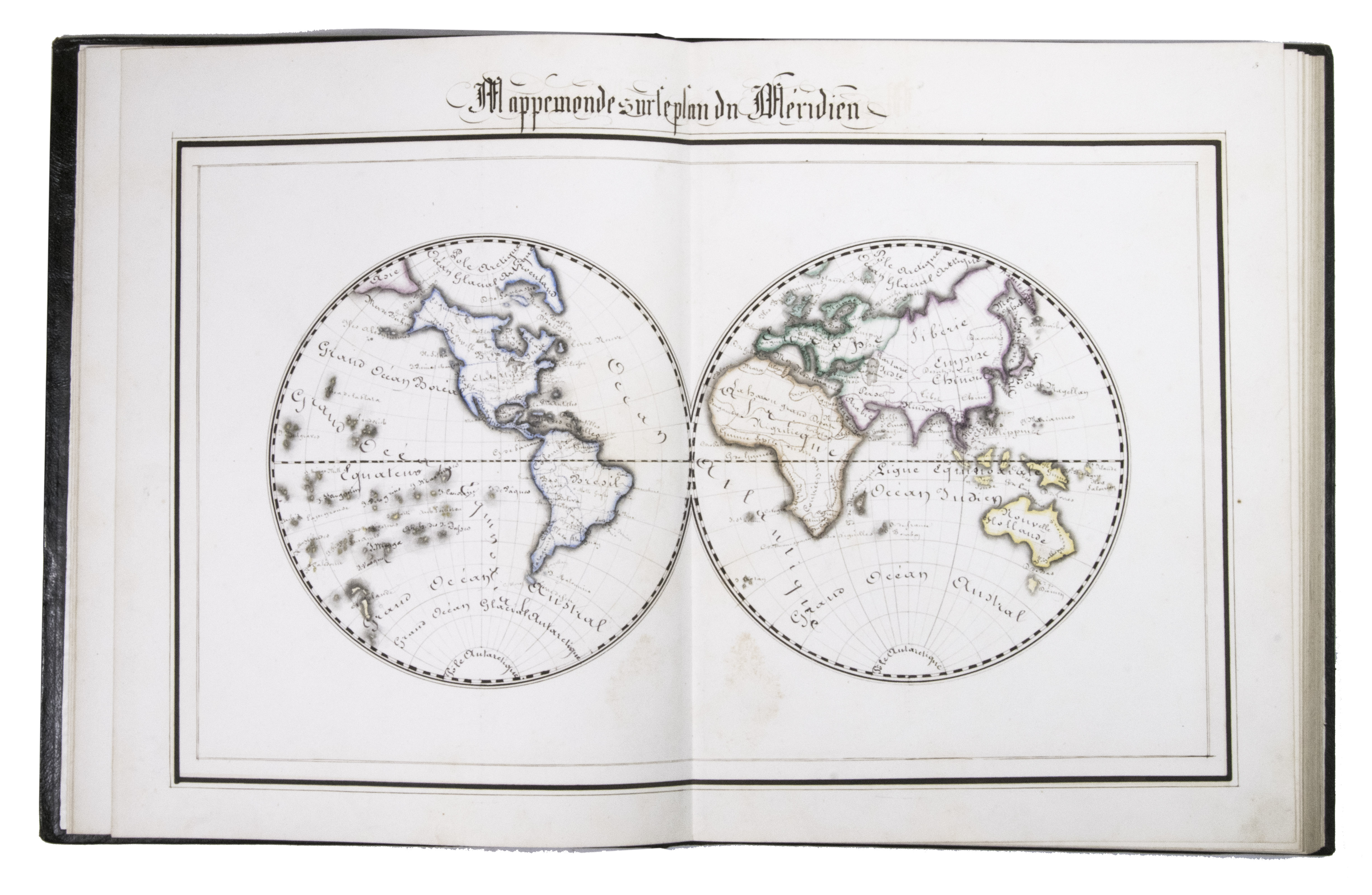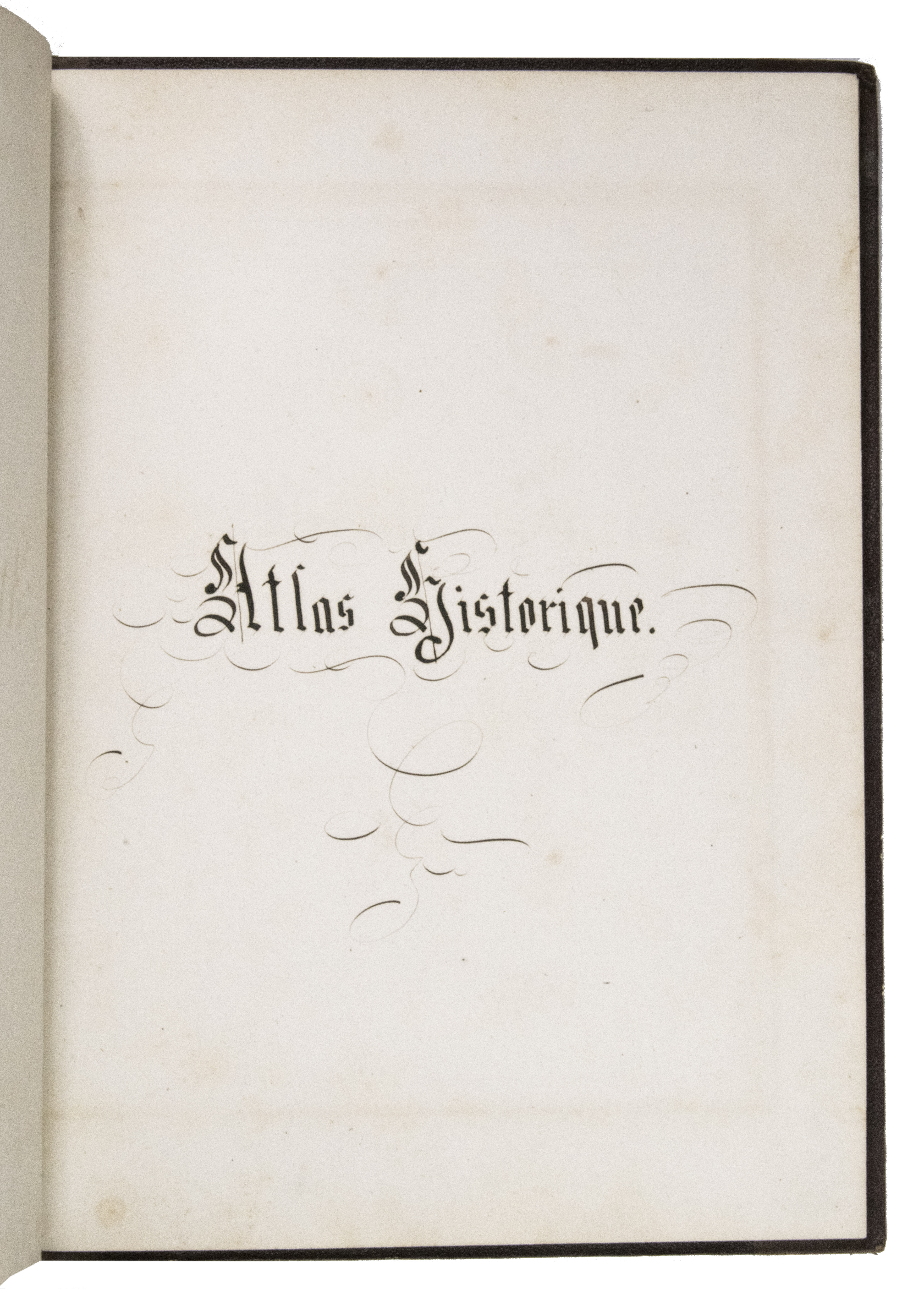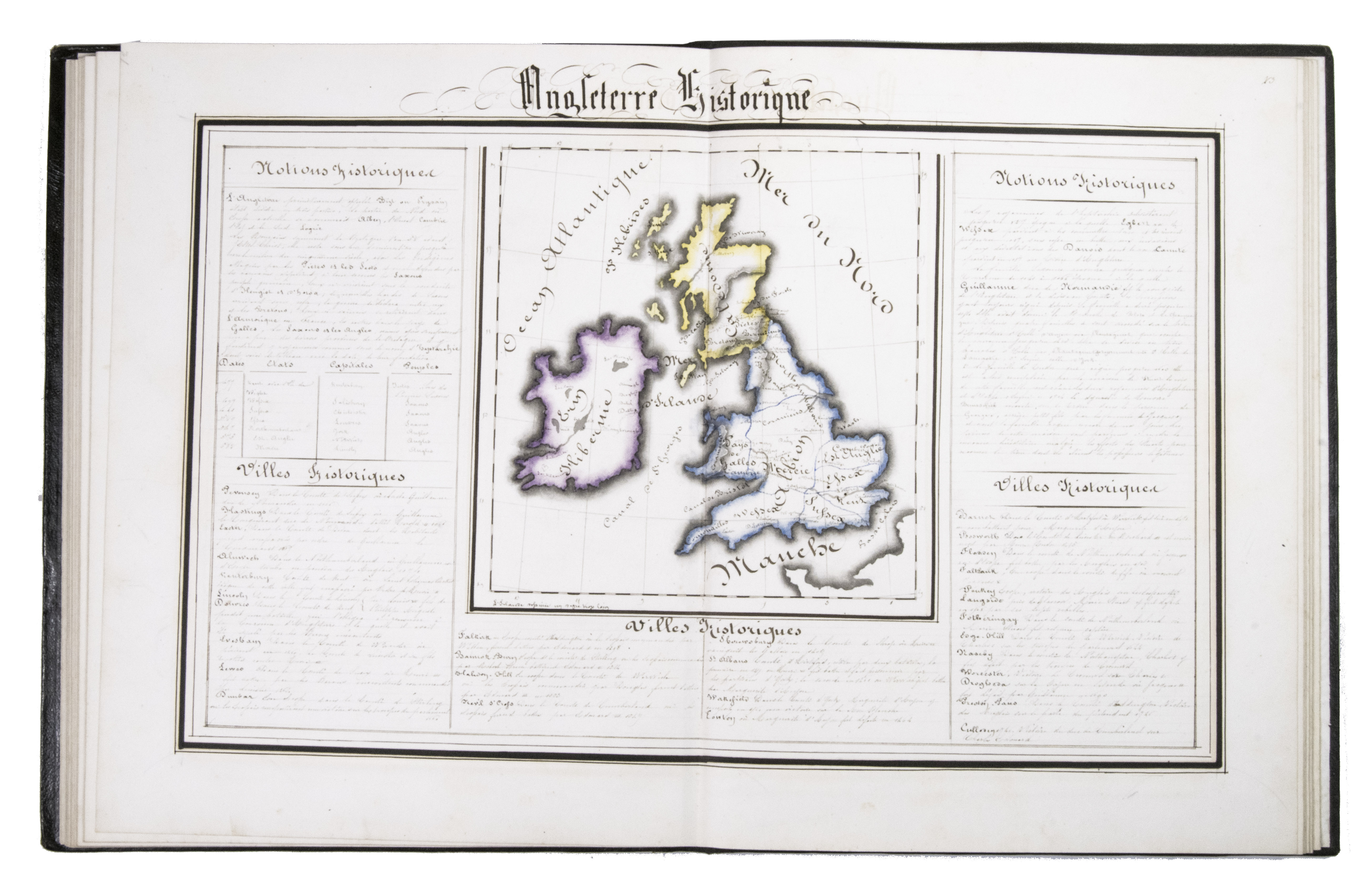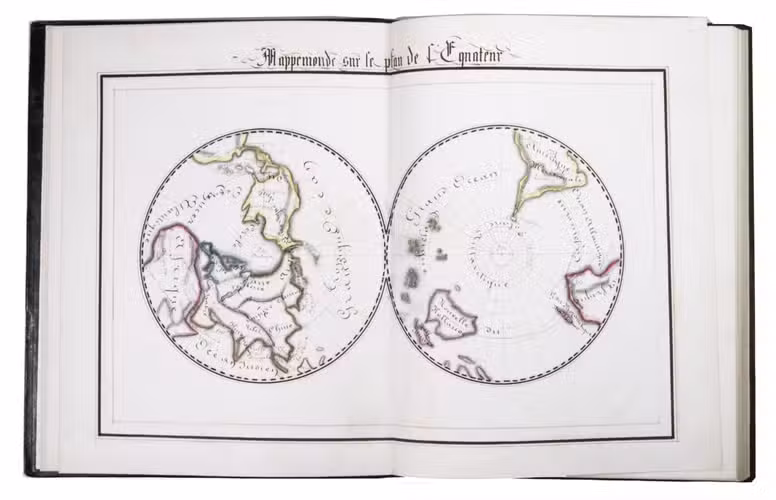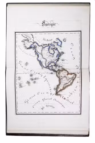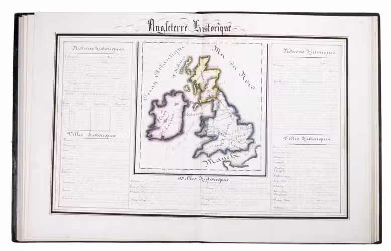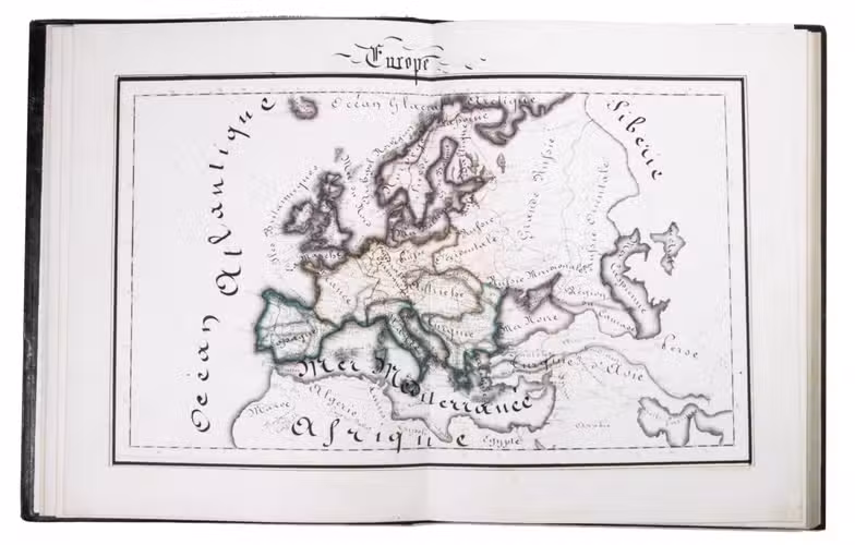A 3-volume historical manuscript atlas with beautiful manuscript maps, the volumes titled: Atlas historique, Souvenirs historiques and Tableaux et cartes. The Atlas historique contains finely calligraphed chronological tables displaying events in ecclesiastical history, the history of the Roman Empire and France, from the first century to 1850, followed by coloured double-page maps of France, the Ottoman Empire, Europe and the Roman Empire. The Souvenir historiques has the same structure, but is solely devoted to the history of England, Spain, Germany and Italy, covering the period from the fifth century to 1850, with coloured double-page maps of the British Isles, the Iberian Peninsula, the German states, and Italy. The Cartes et tableaux is the most ambitious volume, containing no fewer than 14 coloured double-page maps, including two world maps, maps of Africa, Asia, America, Oceania, Europe, etc., and numerous chronological tables.