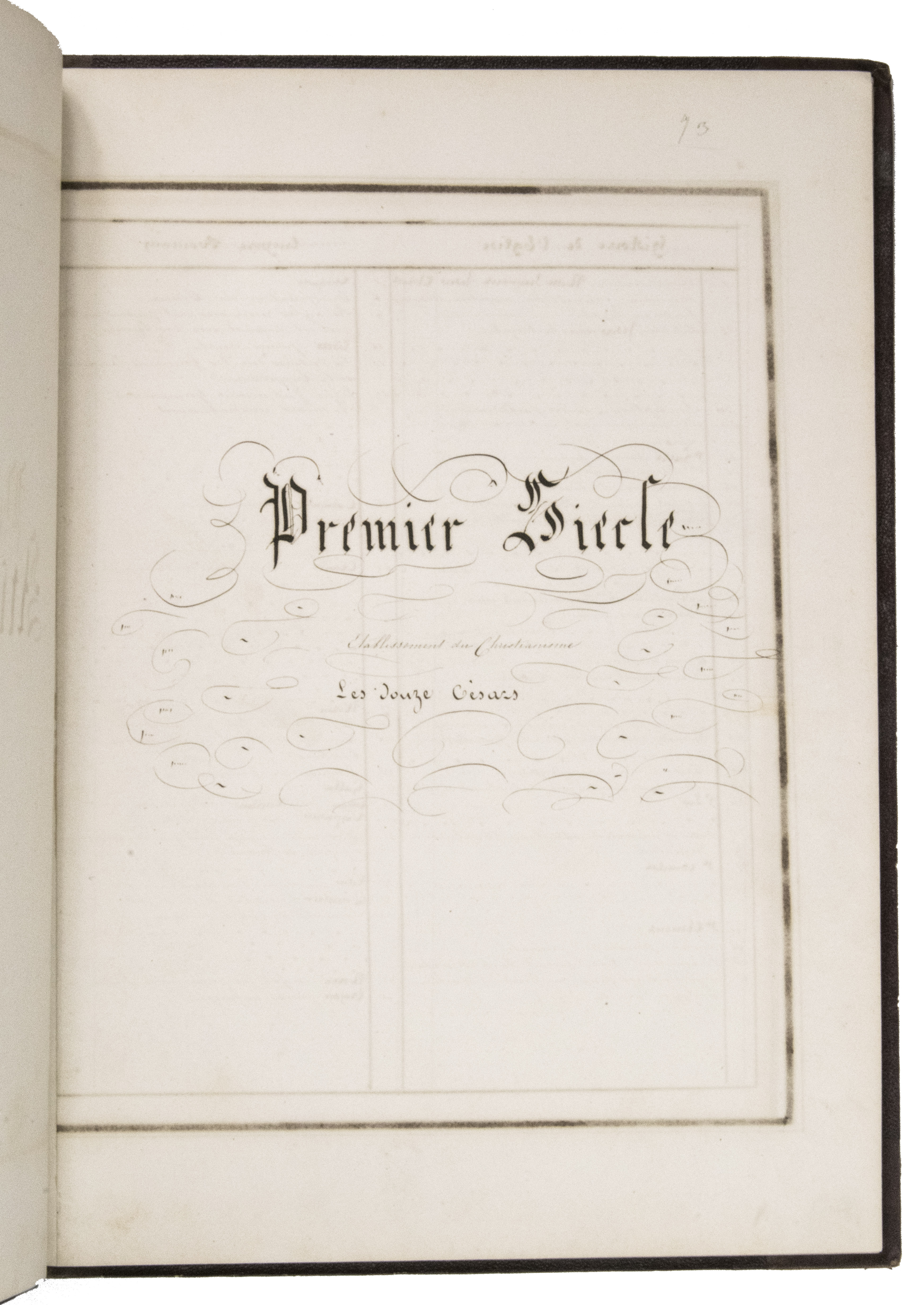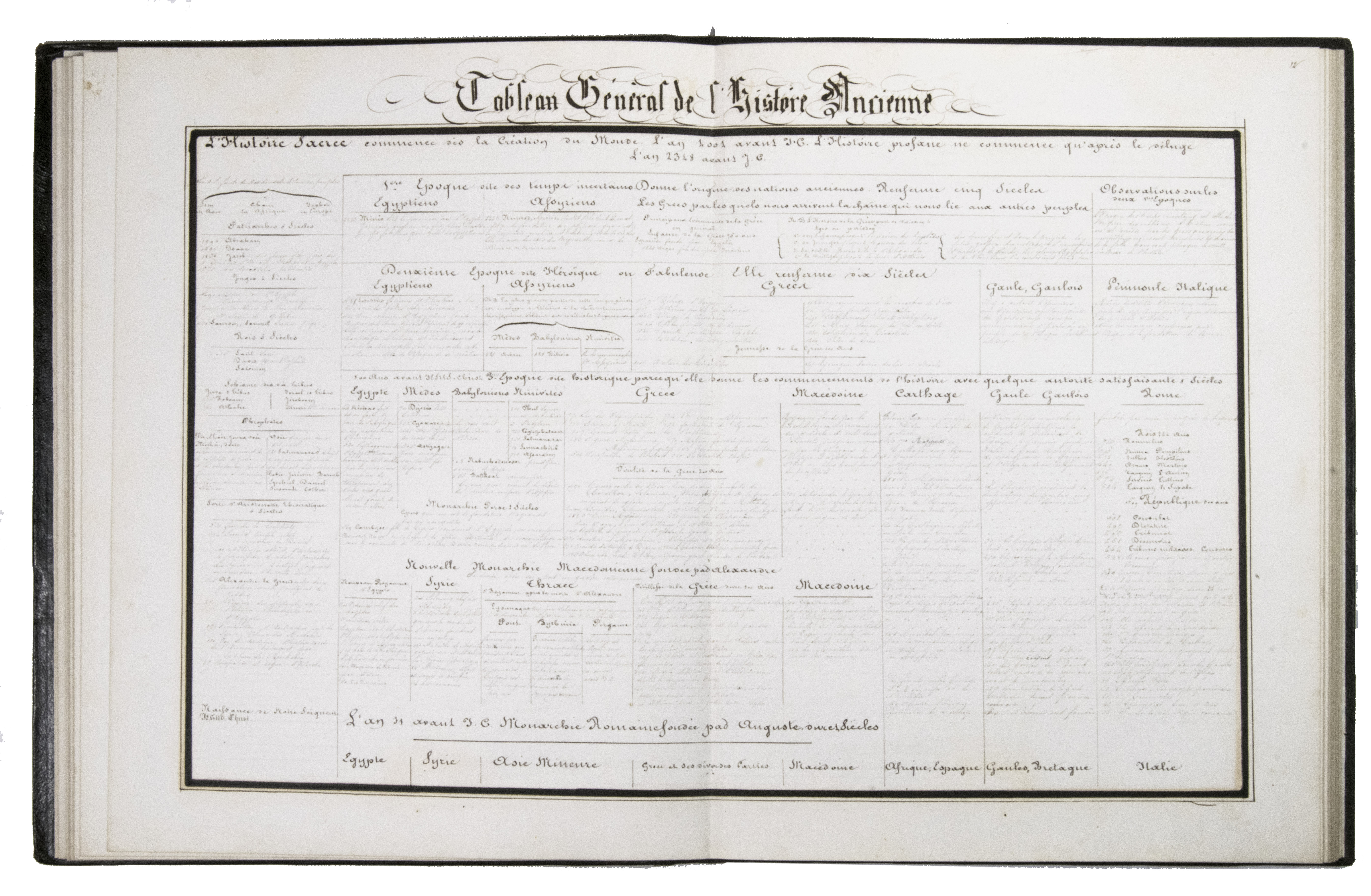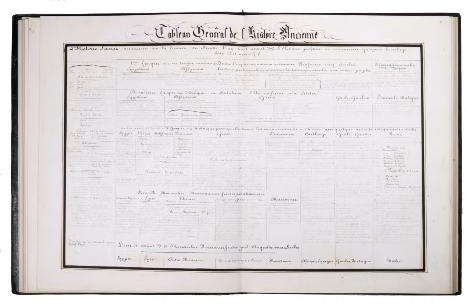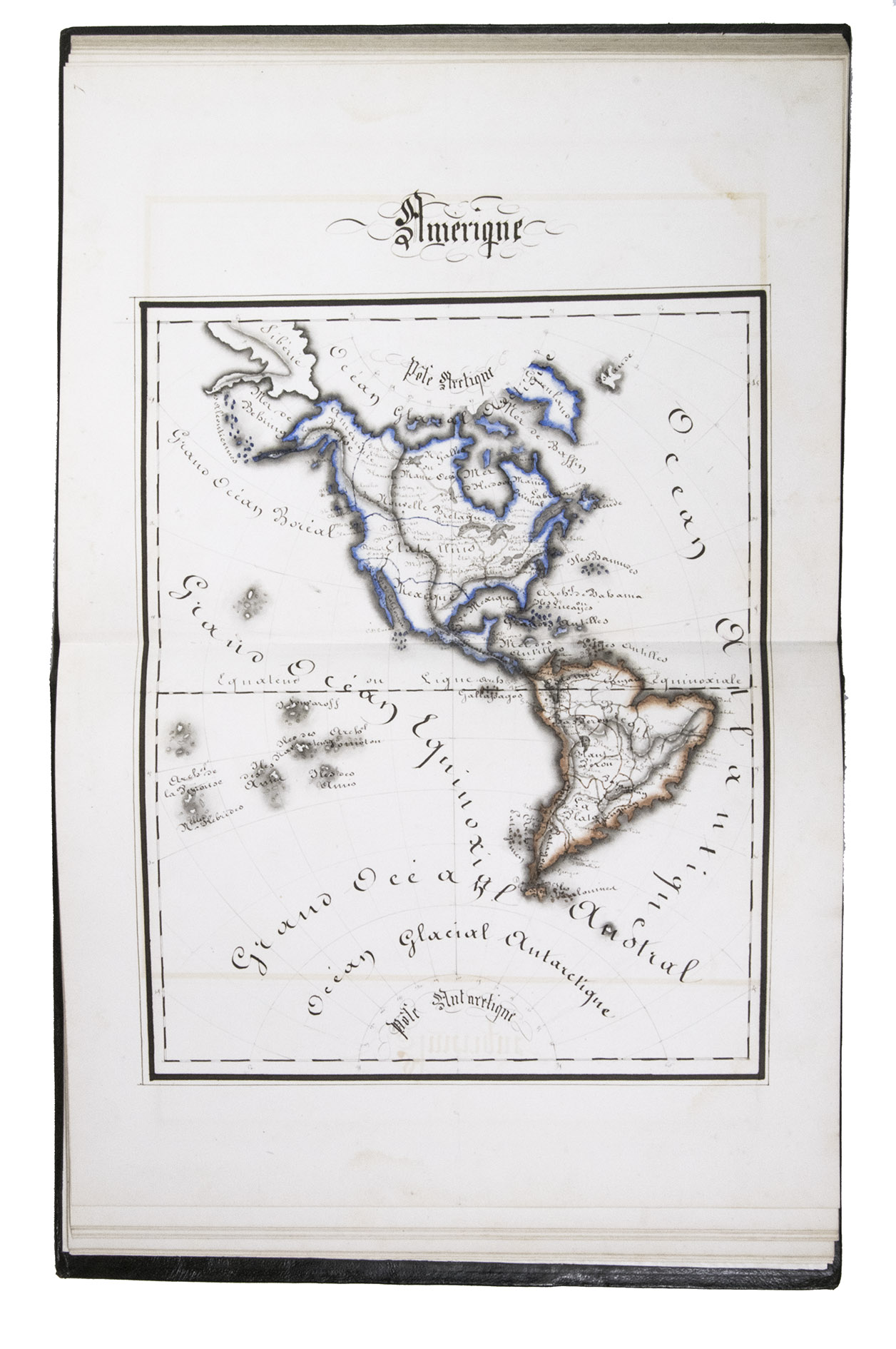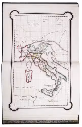A 3-volume historical manuscript atlas with beautiful manuscript maps, the volumes titled: Atlas historique, Souvenirs historiques and Tableaux et cartes. The Atlas historique contains finely calligraphed chronological tables displaying events in ecclesiastical history, the history of the Roman Empire and France, from the first century to 1850, followed by coloured double-page maps of France, the Ottoman Empire, Europe and the Roman Empire. The Souvenir historiques has the same structure, but is solely devoted to the history of England, Spain, Germany and Italy, covering the period from the fifth century to 1850, with coloured double-page maps of the British Isles, the Iberian Peninsula, the German states, and Italy. The Cartes et tableaux is the most ambitious volume, containing no fewer than 14 coloured double-page maps, including two world maps, maps of Africa, Asia, America, Oceania, Europe, etc., and numerous chronological tables.