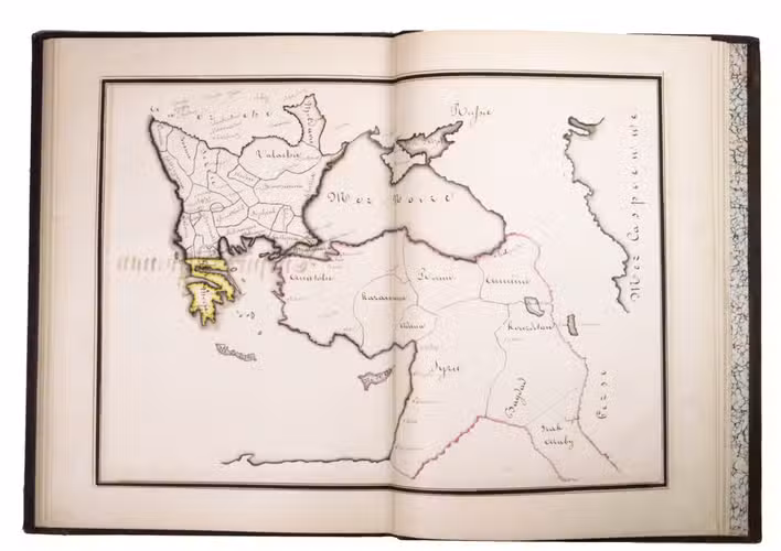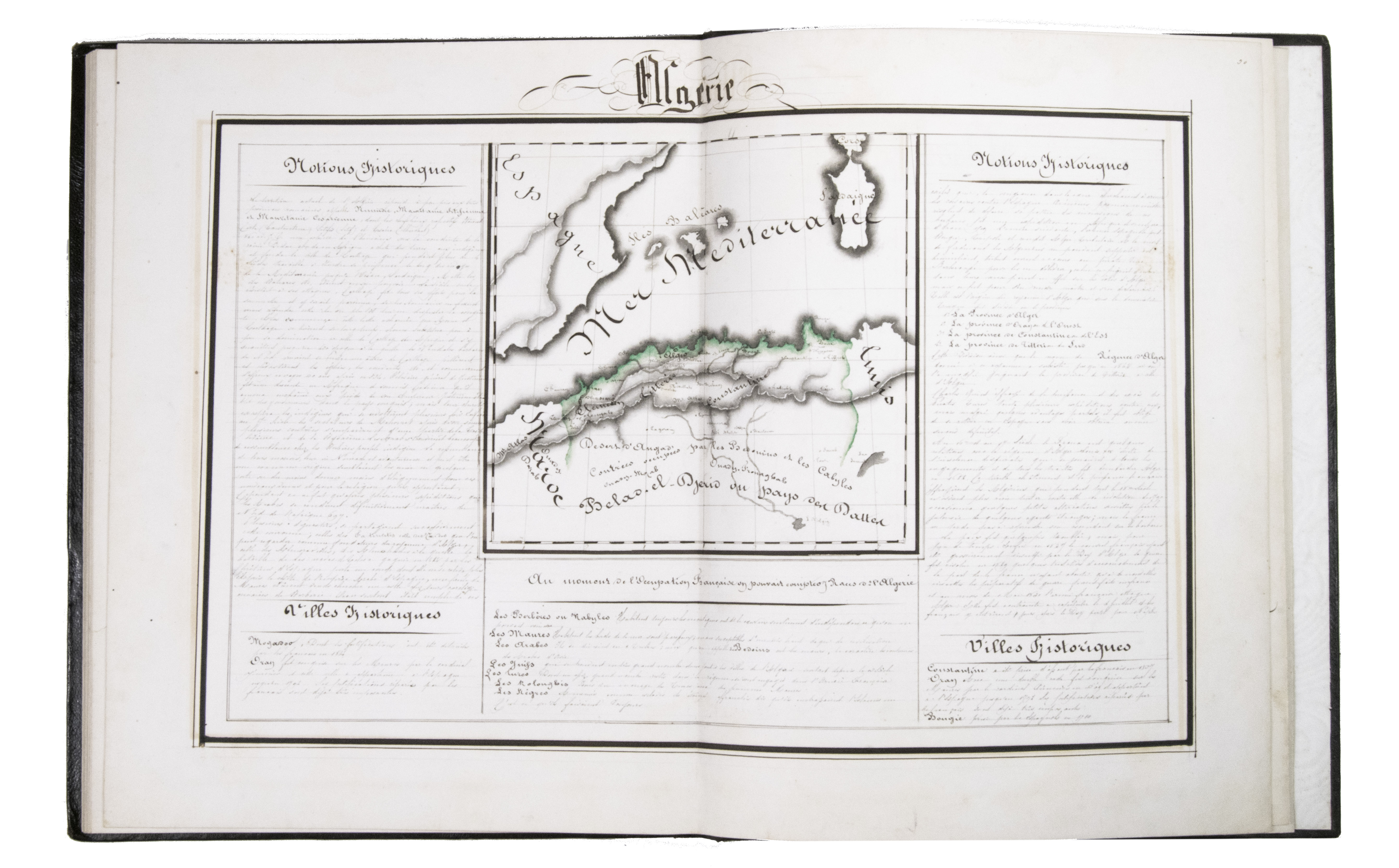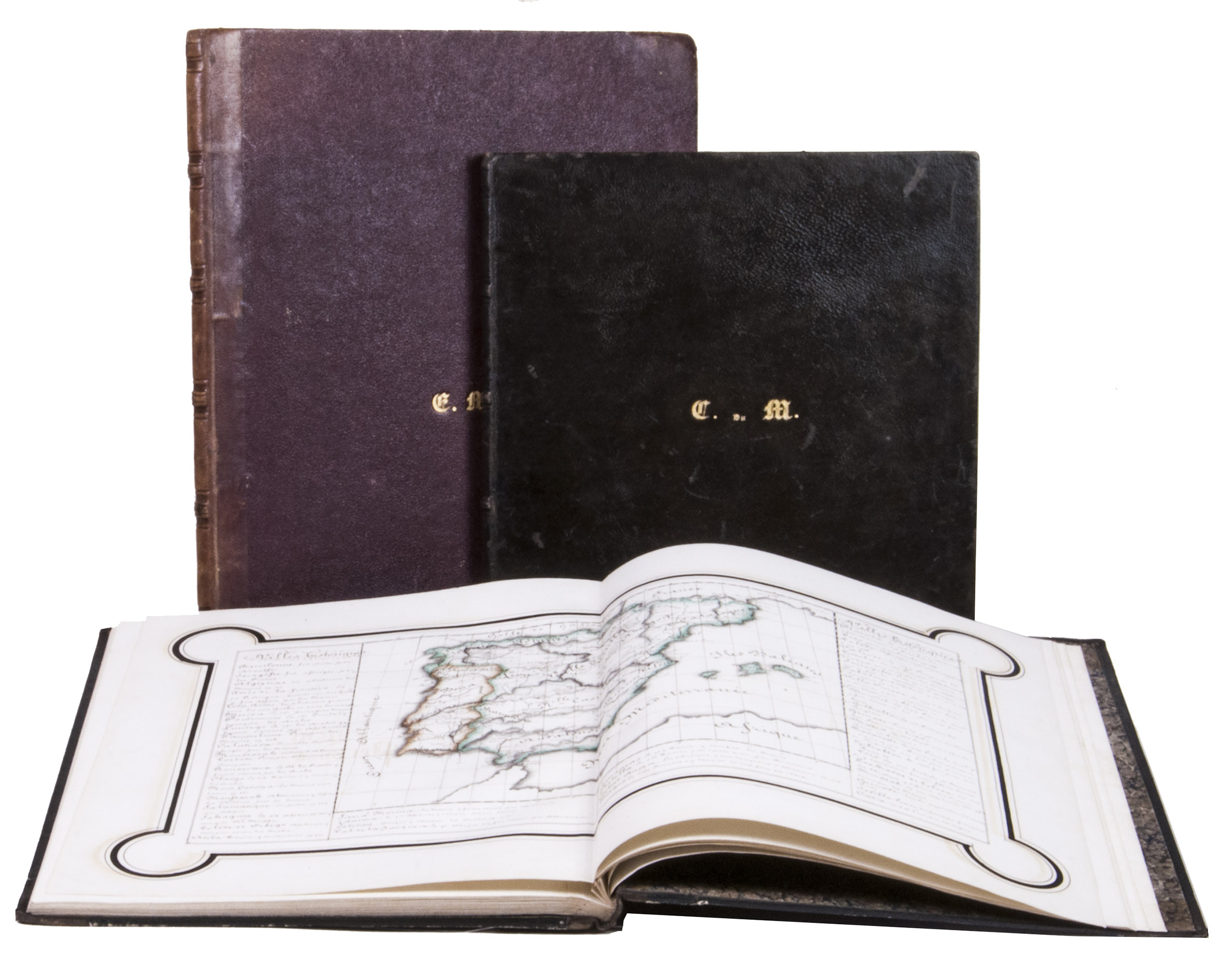 [Montpellier?], [date on spine of vol. 1:] 1851. 3 volumes. Folio (vol. 1) and large 4to (vols. 2-3). Neatly written manuscripts on paper with 23 graphically vibrant maps, coloured in outline with subtly shaded washes in grey (for the coasts) and numerous bright colours (for political boundaries), and with calligraphic headings. Contemporary bindings: vol. 1 red half goatskin; vol. 2 black half goatskin; vol. 3 black sheepskin. [1], [26 double]; [1], [22 double]; [1], 30 double, [1] ll.