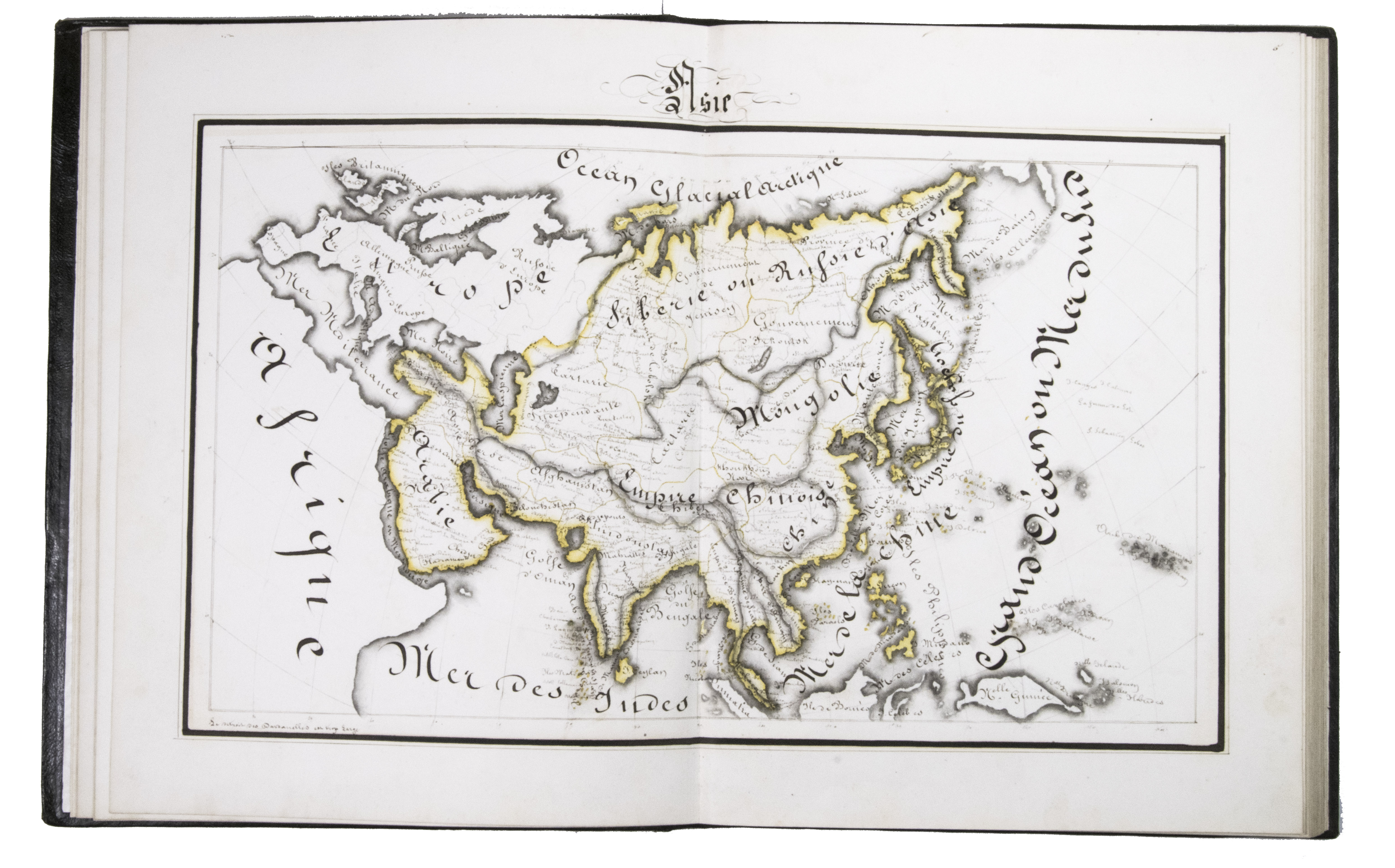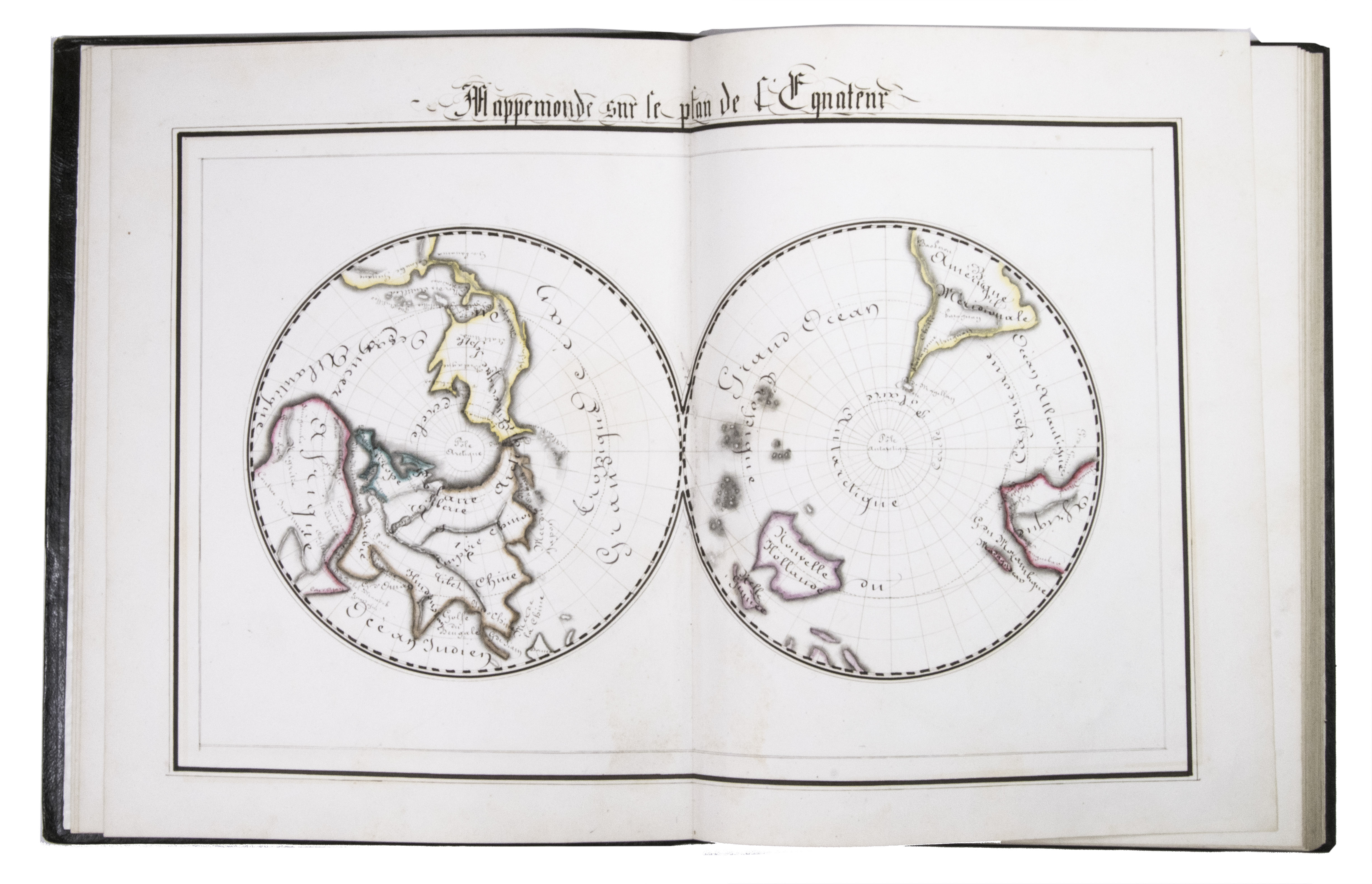 The ink has sometimes left a browned shadow on the back of the leaves or facing leaves and occasionally eaten a small hole in the paper, but the atlas is otherwise in very good condition. Bindings slightly chafed. A graphically vibrant French historical manuscript atlas.