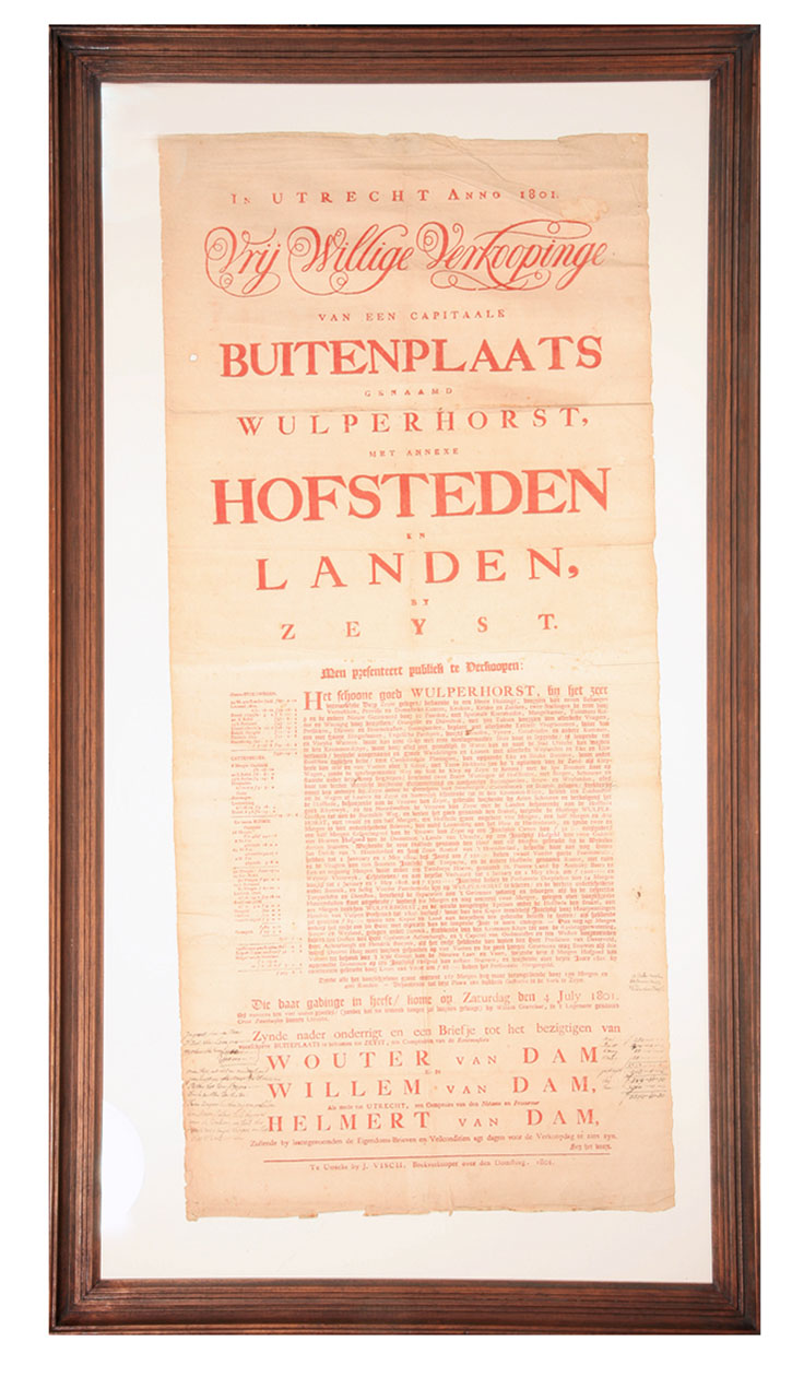 Only survived (?) copy of an auction poster announcing the sale of the country estate Wulperhorst, originally dating from the 17th century. In the last half of the 18th century the estate came into the possession of lieutenant-stadtholder Willem Nicolaas Pesters (1717-1794) and after his death it fell to his wife Isabella van Westrenen (1728-1809). It was auctioned in 1801 and subsequently owned by Jan Anthony Taets van Amerongen heer van Woudenberg (1769-1828), after his death it was auctioned again in 1829. The new owner, Jan Elias Huydecoper, had it demolished, but decided in 1829 to build a new country house, which still exists today.
