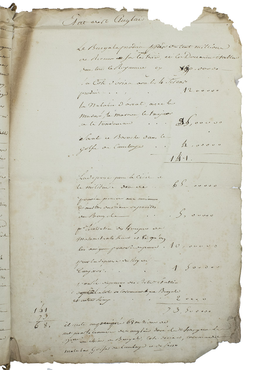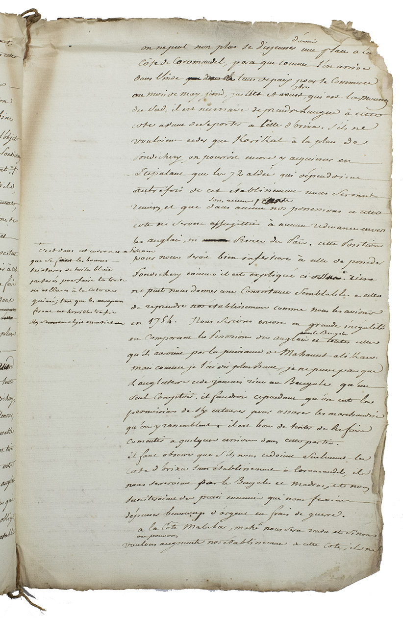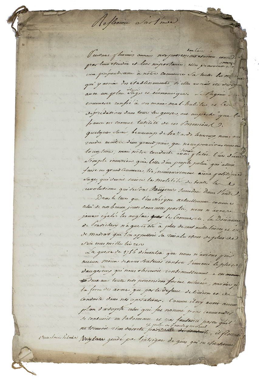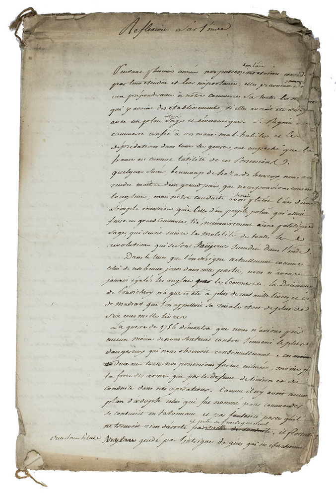 First draft of an autograph manuscript in French, with erasures and corrections, probably written by a diplomat or strategist, concerning the causes of Britains defeat of France in India during the Seven Years War (1756-1763) and analysing different ways to restore France to power on Indian soil by an alliance with the sultan Haider Ali Khan (1722-1782), who ruled Mysore and a large part of southern India and was one of the greatest enemies of the British East India Company. According to the unidentified diplomat who wrote this text, Haider Ali Khan was the only one who was able to defeat the British or challenge their supremacy in India. In this manuscript he describes the best strategy not only to join Haider Ali Khan, but also to negotiate with the British people on profitable Indian trade for both parties.