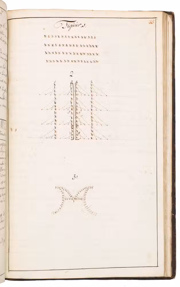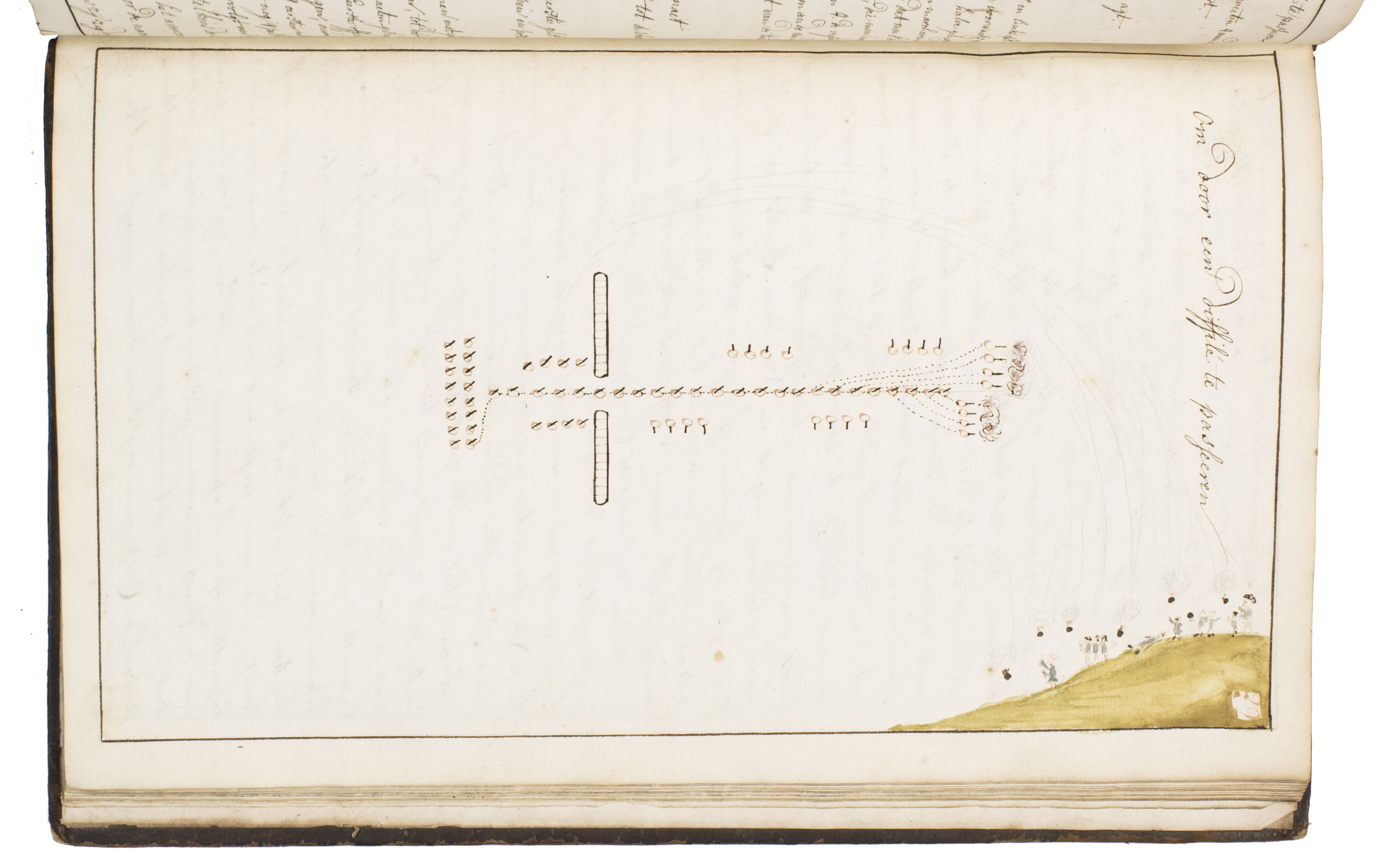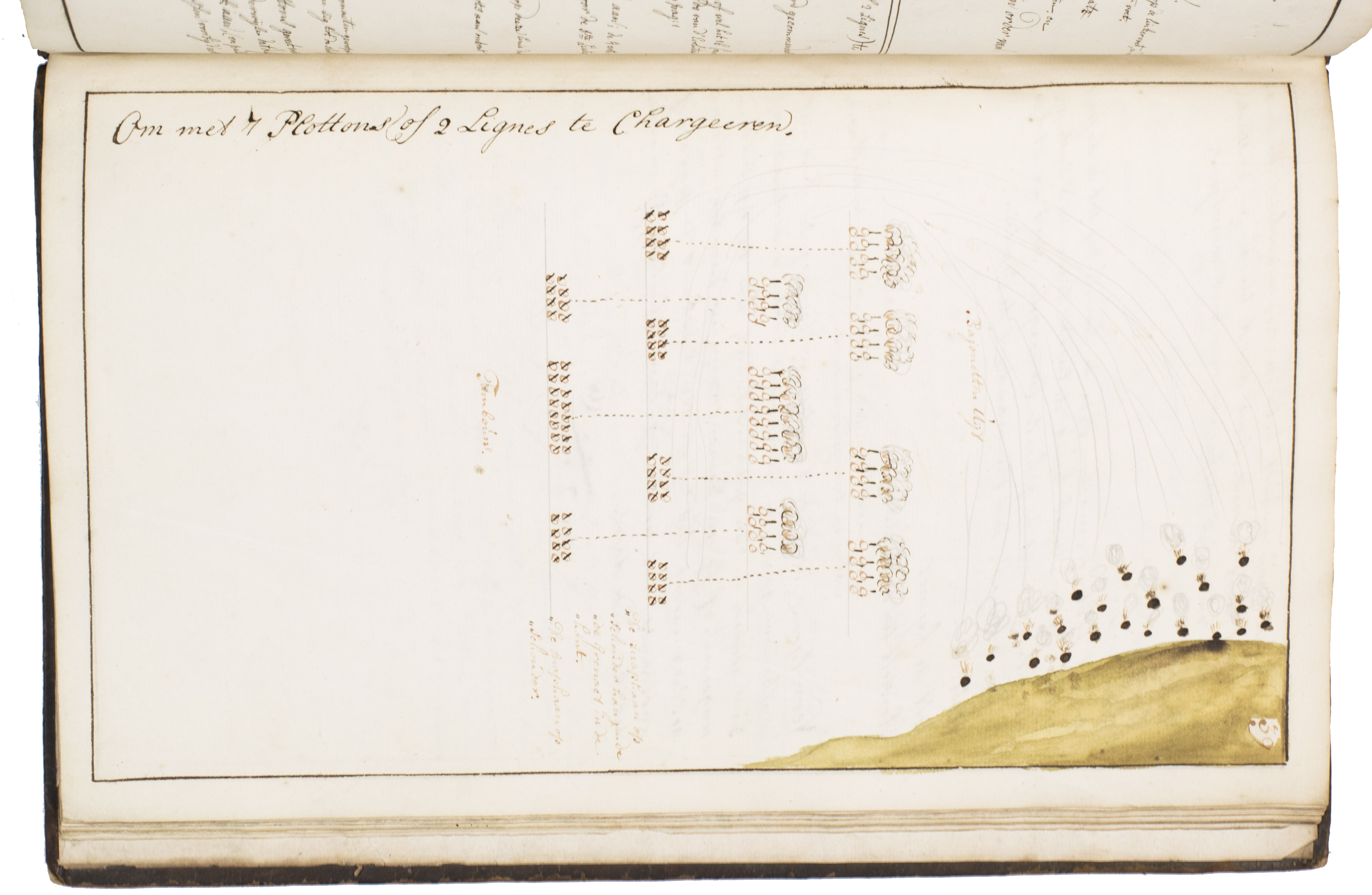 Unusual military manuscript with exercises for grenadiers, written by a captain. The easily legible work describes and depicts various tactical formations, with clear instructions on how the company or platoon could move into them. The explanations are written on the left and the drawings are drawn on the right, making the manuscript easy to use. Discussed are formations in rows, square formations, formations in the shape of the commander's initials, and a formation a company could use to pass a barrier. The manuscript also explains the proper ways to hold and use grenades and rifles while in these formations. The work has never been published, which means this is the only known copy of it.