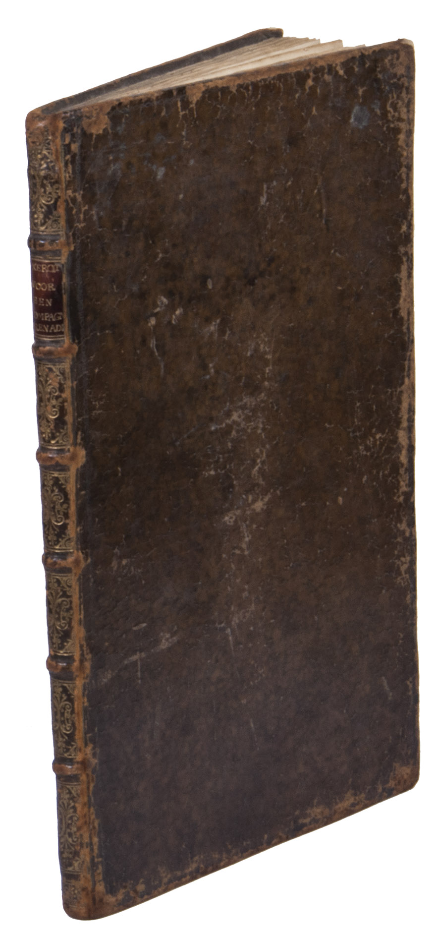The binding shows traces of use: the edges and corners of the boards are scuffed, and the leather on the front and back boards is somewhat scratched and cracked, the joints are slightly weakened, but without affecting the structural integrity of the binding. Very minor foxing throughout. Otherwise in good condition.
