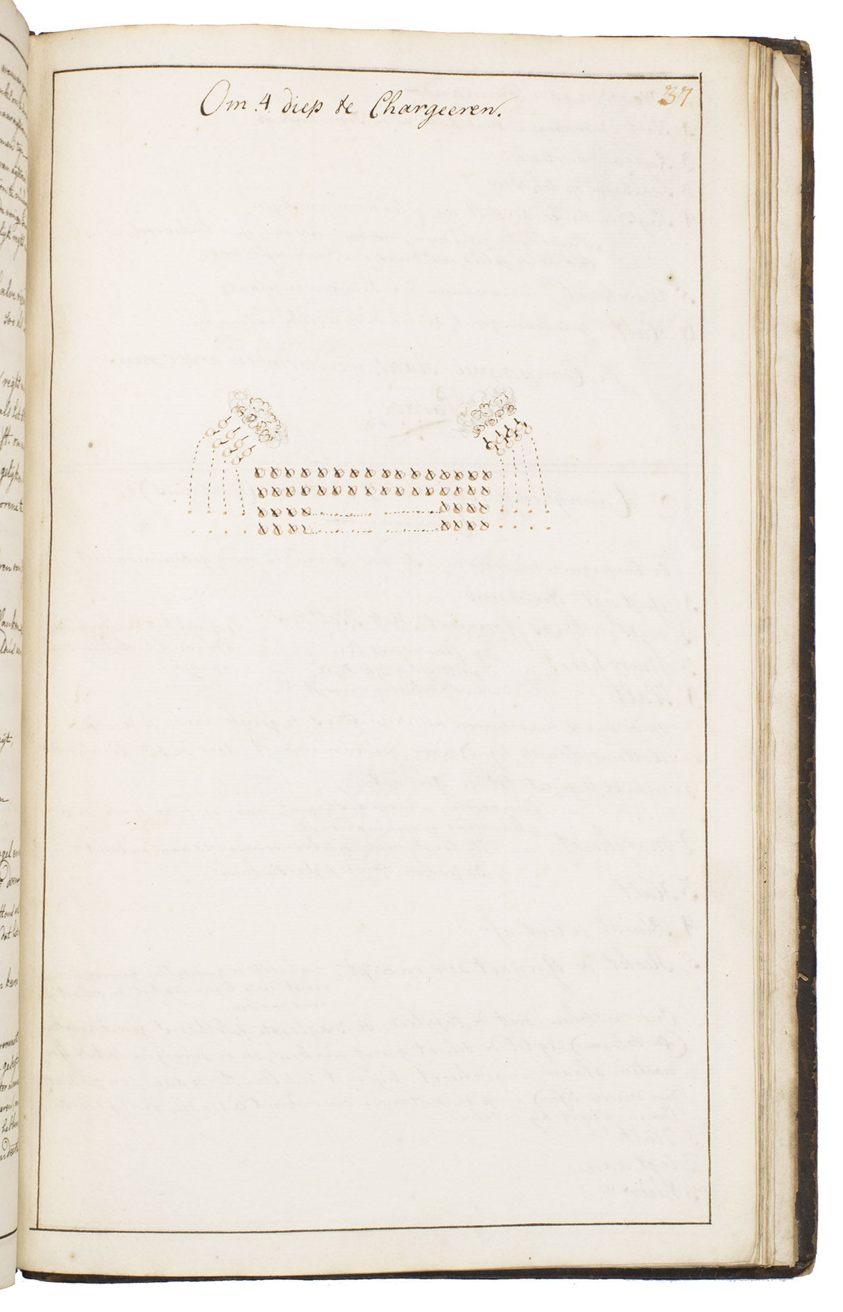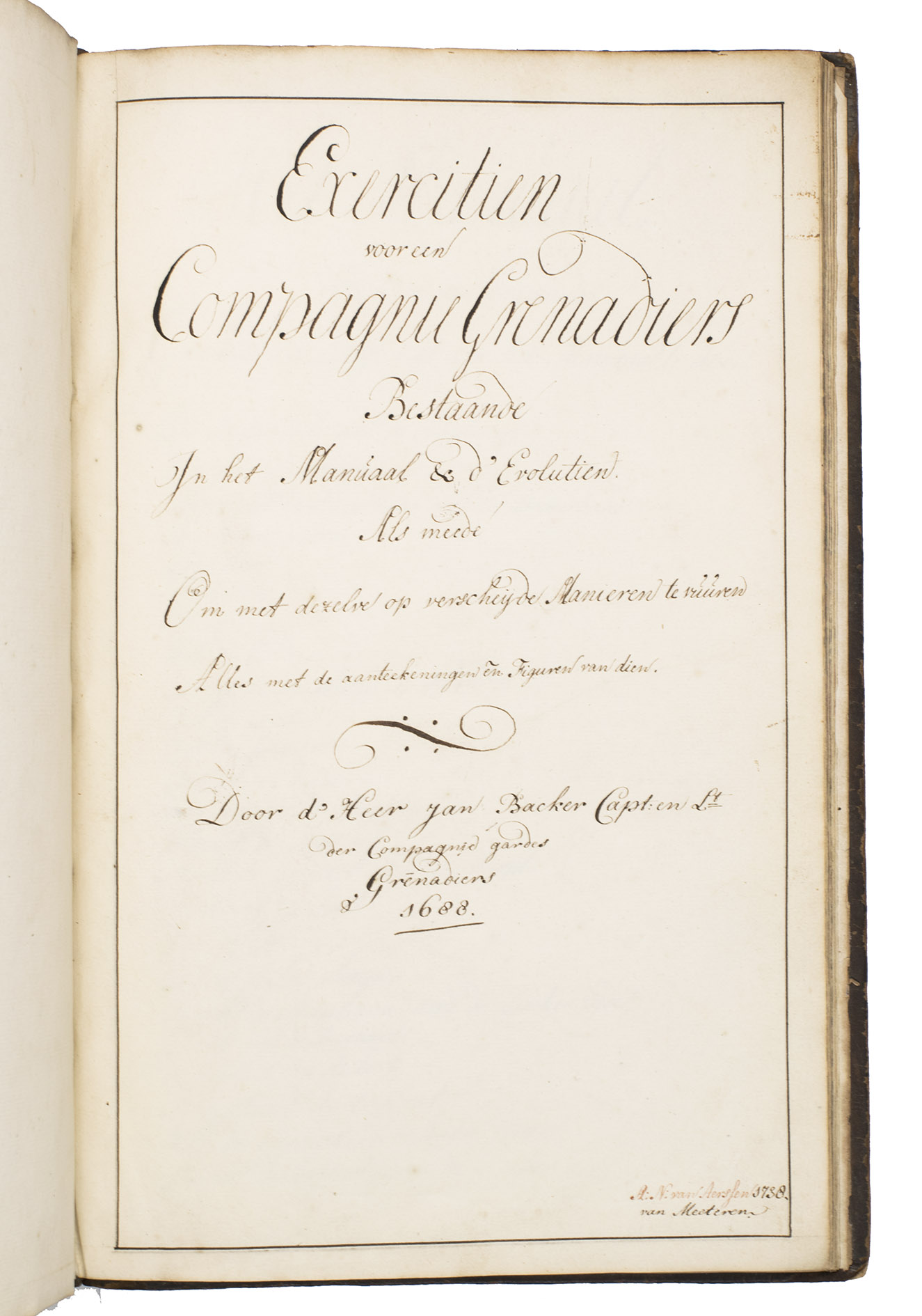 The manuscript was written by Albrecht Nicolaas van Aerssen Beijeren, lord of Voshol, Meteren, Hoogerheyden, Geldermalsen and Triangel (1723-1805), when he was 15 years old. He went on to have a flourishing military career and became a lieutenant-general and commander of Deventer in 1790. However, according to the title-page of the manuscript, the work was composed in 1688 by Jan Backer, captain of a company of grenadiers. Unfortunately, nothing else is known about him, but considering his titles, he must have been an experienced grenadier.